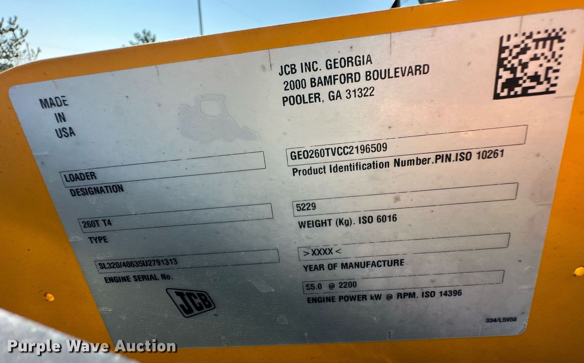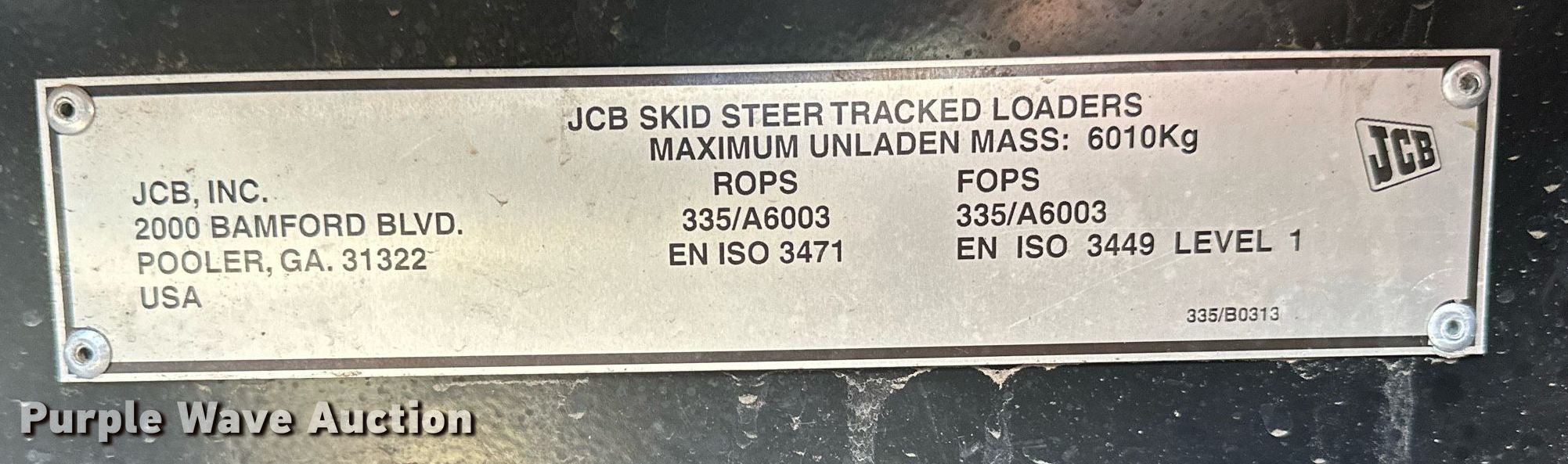 Purple Wave is selling a used Tracked Skid Steer Loader in Oklahoma. This item is a 2012 JCB 260T Eco tracked skid steer loader with the following: Hours: 498 on meter, Serial: GE0260TVCC2196509