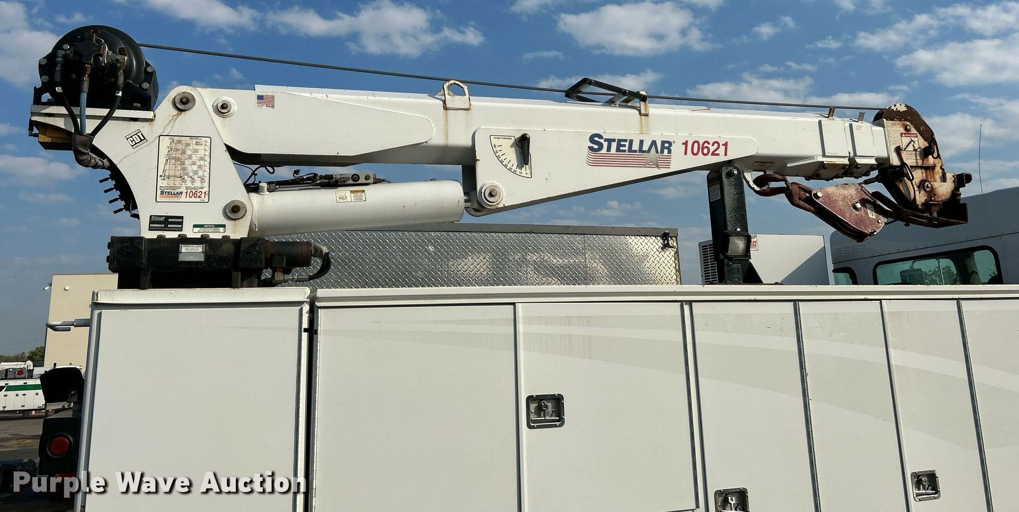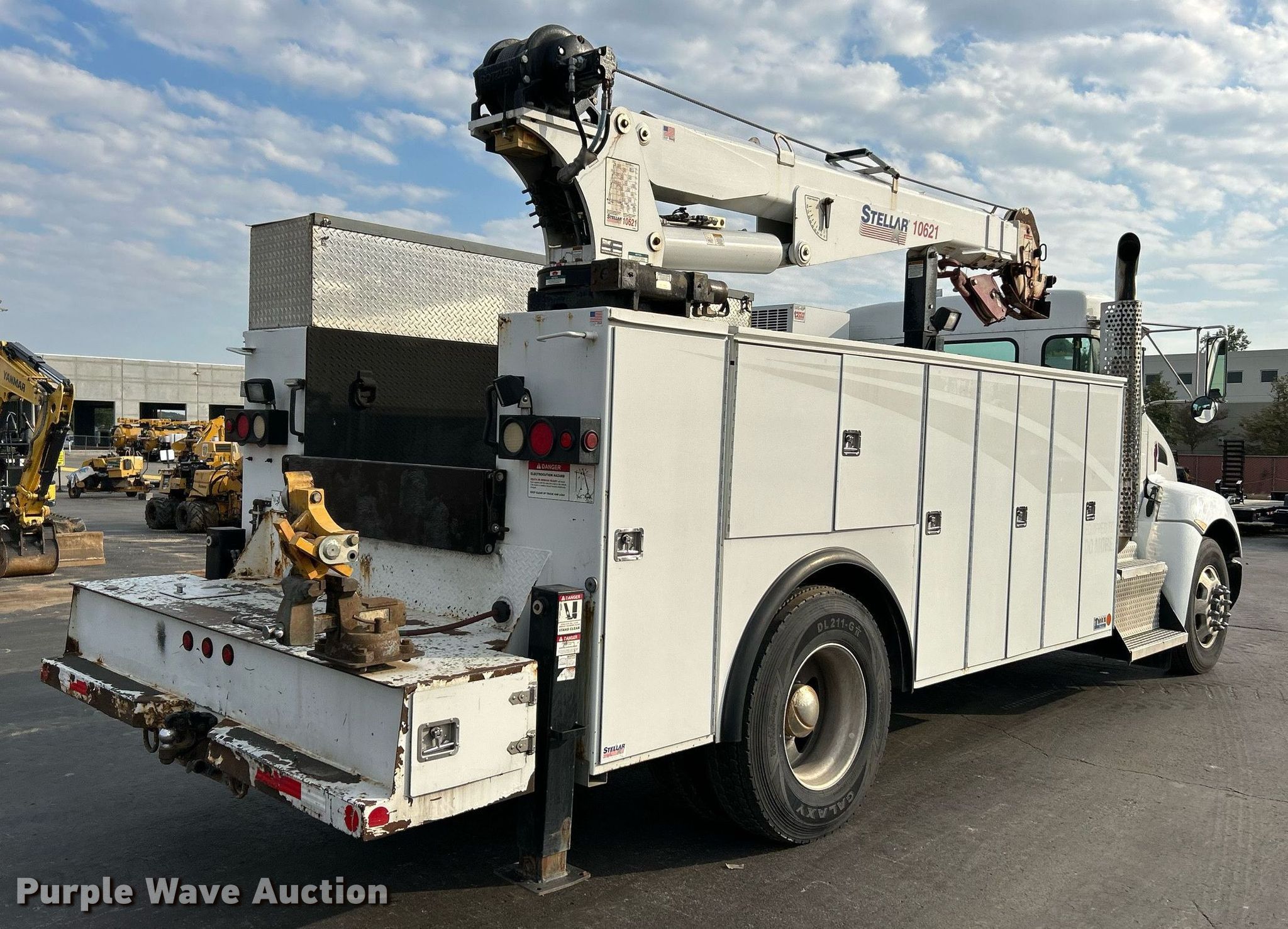 2013 Kenworth T300 utility / service truck. Miles: 364,349 on odometer, Hours: 11,139 on meter, VIN: 2NKHHN7X5DM362666. Engine Paccar PX-8 350, Displacement: 8.3L, Cylinders: 6, Fuel type: Diesel. Transmission Allison, Automatic. Chassis Axles: Single, Suspension: Air, Brakes: Air, PTO, GVWR: 33,000 lbs. Interior AC, Heat, Heated mirrors, Cruise control, Brake controller, Power passenger window. Features Bed Stellar 10621, 14' L x 94" W, Welder/generator Miller Bobcat 250, Hours: 18 on meter, Fuel type: Diesel, 240V outlets: 1, 120V outlets: 4, Watts: 11,000, Fuel type: Diesel, Welder type: Leads, Tig, Wire, Stick (AC/DC), Air compressor American Eagle SRS-40P, Crane Stellar 10621, Maximum boom length: 21' Maximum lift capacity: 10,000 lbs.. Tires Front: 295/75R22.5, Rear: 11R22.5. Missouri title. Seller is a Missouri licensed motor vehicle dealer. Title will be assigned and distributed by the dealer. Please contact the seller for distribution questions. Title distribution may be delayed up to 14 days from verification of funds. Vermeer Midwest. 621 Spirit Valley E Dr. Chesterfield, MO 63005