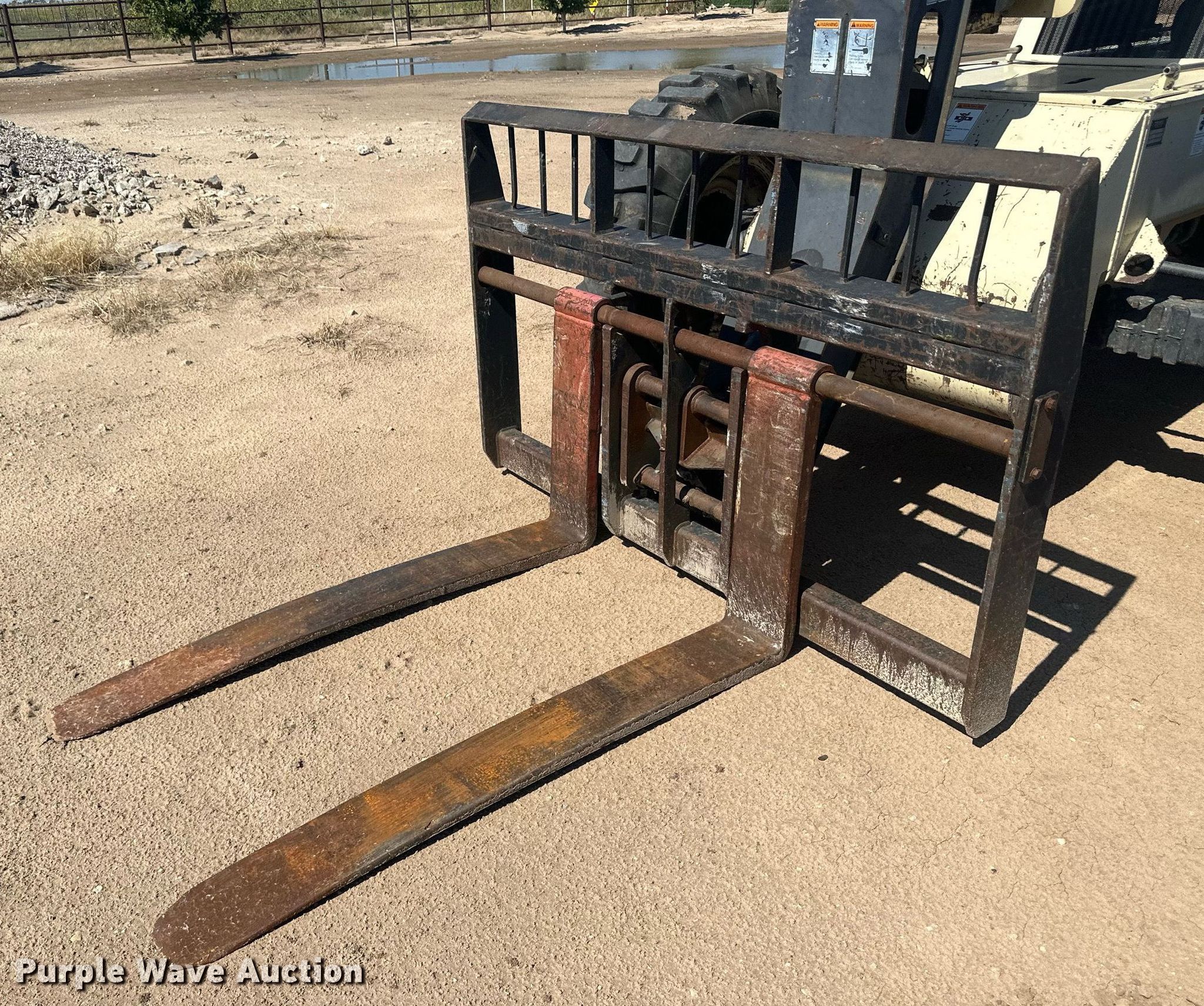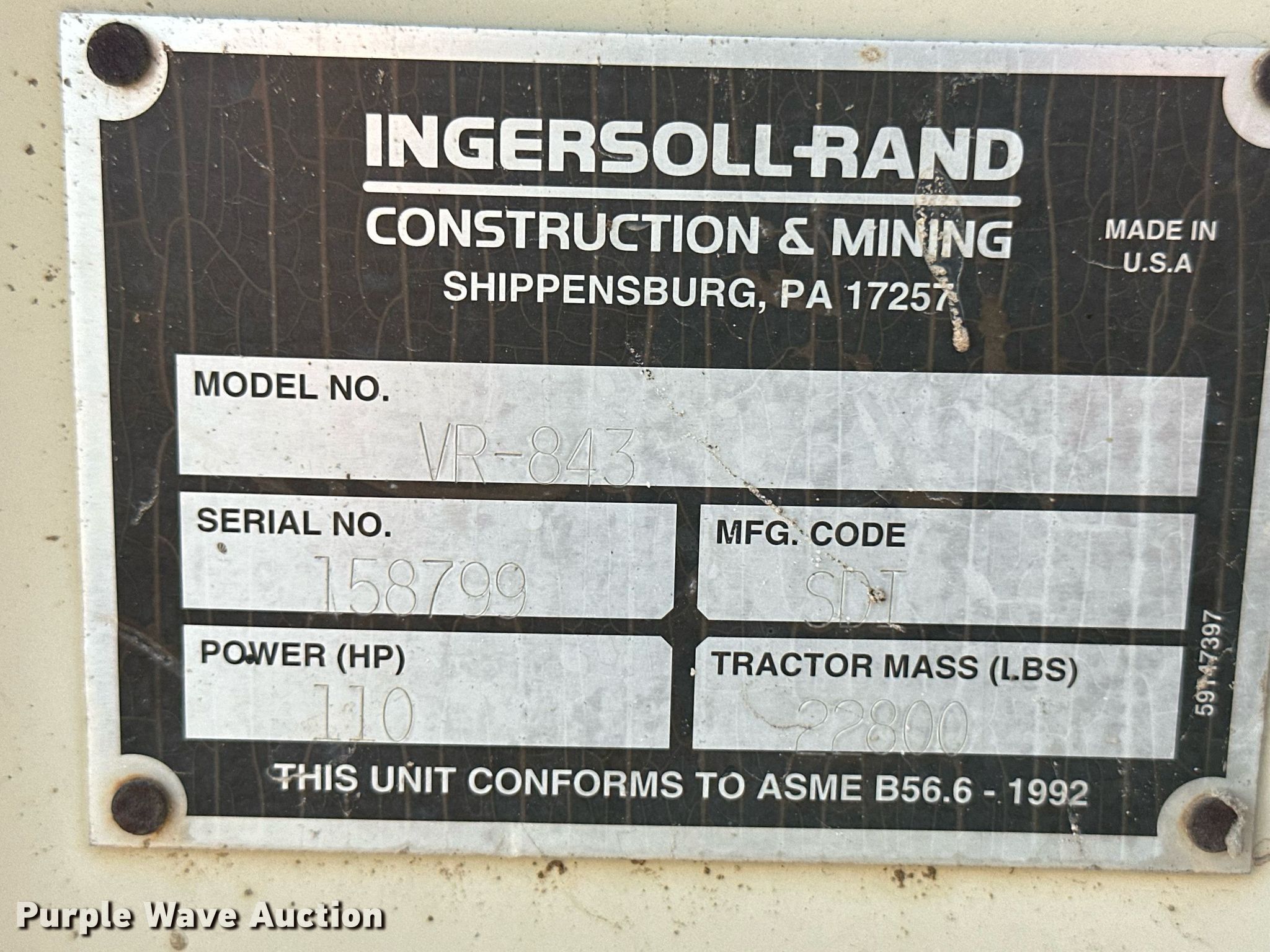 Ingersoll Rand VR-843 telehandler. Hours: 3,126 on meter, Serial: 158799. Engine Cummins, Displacement: 3.9L, Cylinders: 4, Fuel type: Diesel. Transmission Shuttle shift, 3F - 3R , Four wheel drive. Operators station Canopy, Steering: Crab, Four wheel. Features Maximum lift capacity: 8,000 lbs, Maximum lift height: 43', Boom stages: 3, Fork length: 58", Hydraulic leveling, Quick attach: Manual. Tires Size: 13.00-24. 83 Horseshoe Road. Turpin, OK 73950