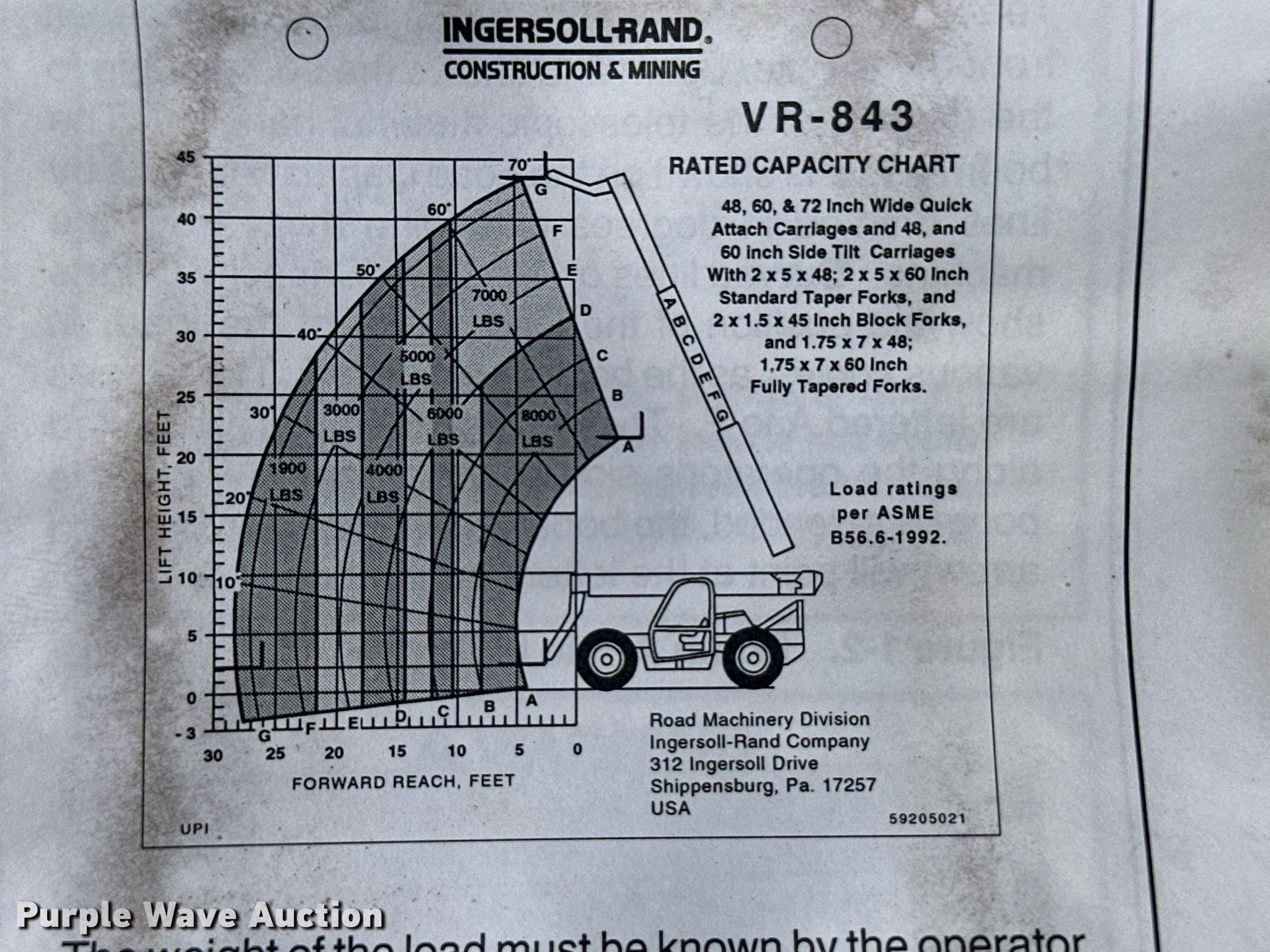 Take a look at this used Ingersoll Rand VR-843 telehandler being sold on November 9th, 2023 in the SOLD! November 09 Construction Equipment Auction made by Ingersoll Rand. Take a look at all of the item information below or take a look at similar auctions for Rough Terrain Forklifts.