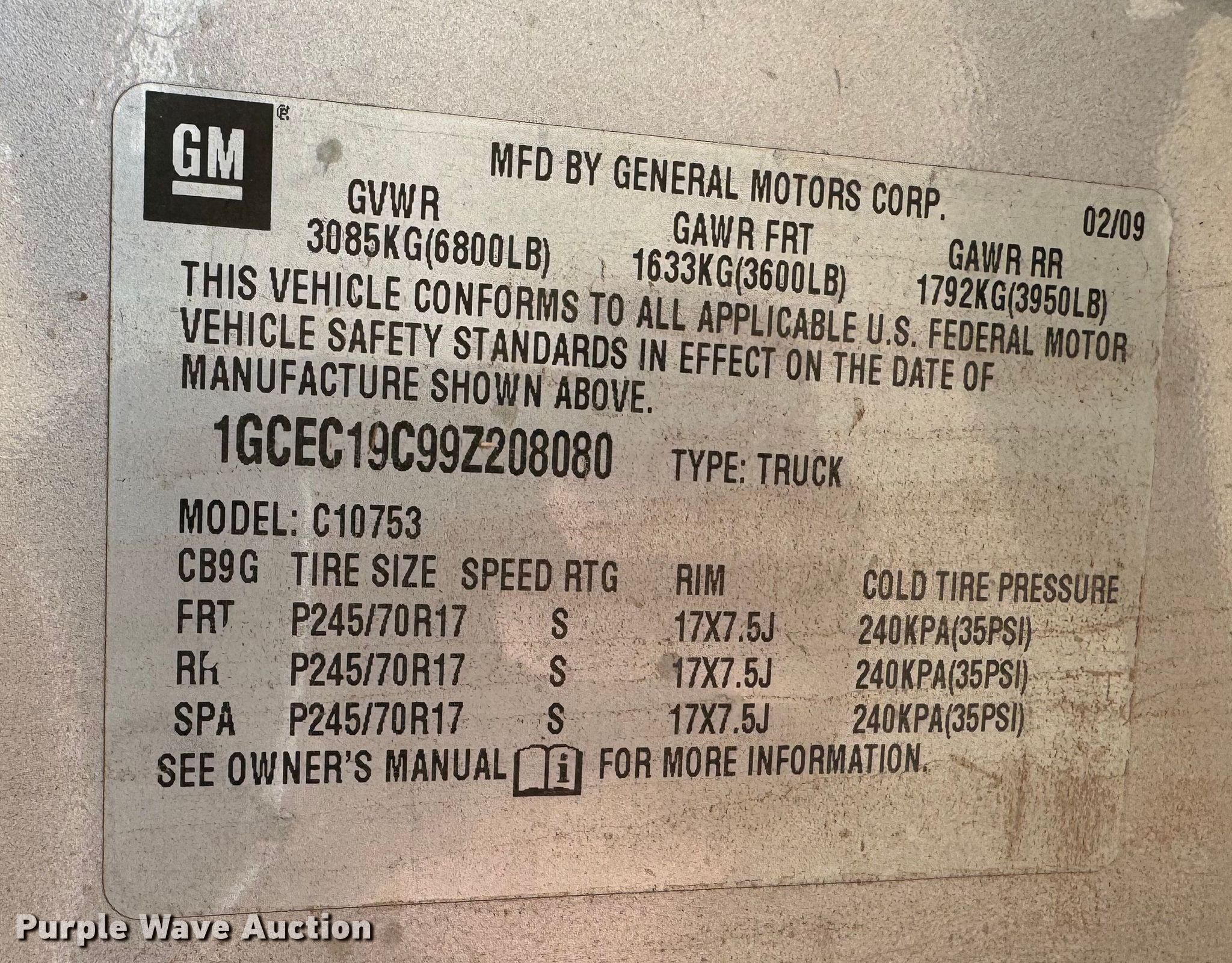 2009 Chevrolet Silverado 1500 Ext. Cab pickup truck. Miles: 206,936 on odometer, VIN: 1GCEC19C99Z208080. Engine Displacement: 4.8L V8 OHV, Cylinders: 8, Fuel type: Gas. Transmission Automatic. Interior AC, Heat, Power windows, Power locks, Cruise control. Tires Size: 245/75R17. Notes Dash warning indicator: Check engine, Windshield chipped or cracked. Texas title. Title distribution may be delayed up to 14 days from verification of funds. Swisher County, TX. 119 S Maxwell Ave. Tulia, TX 79088