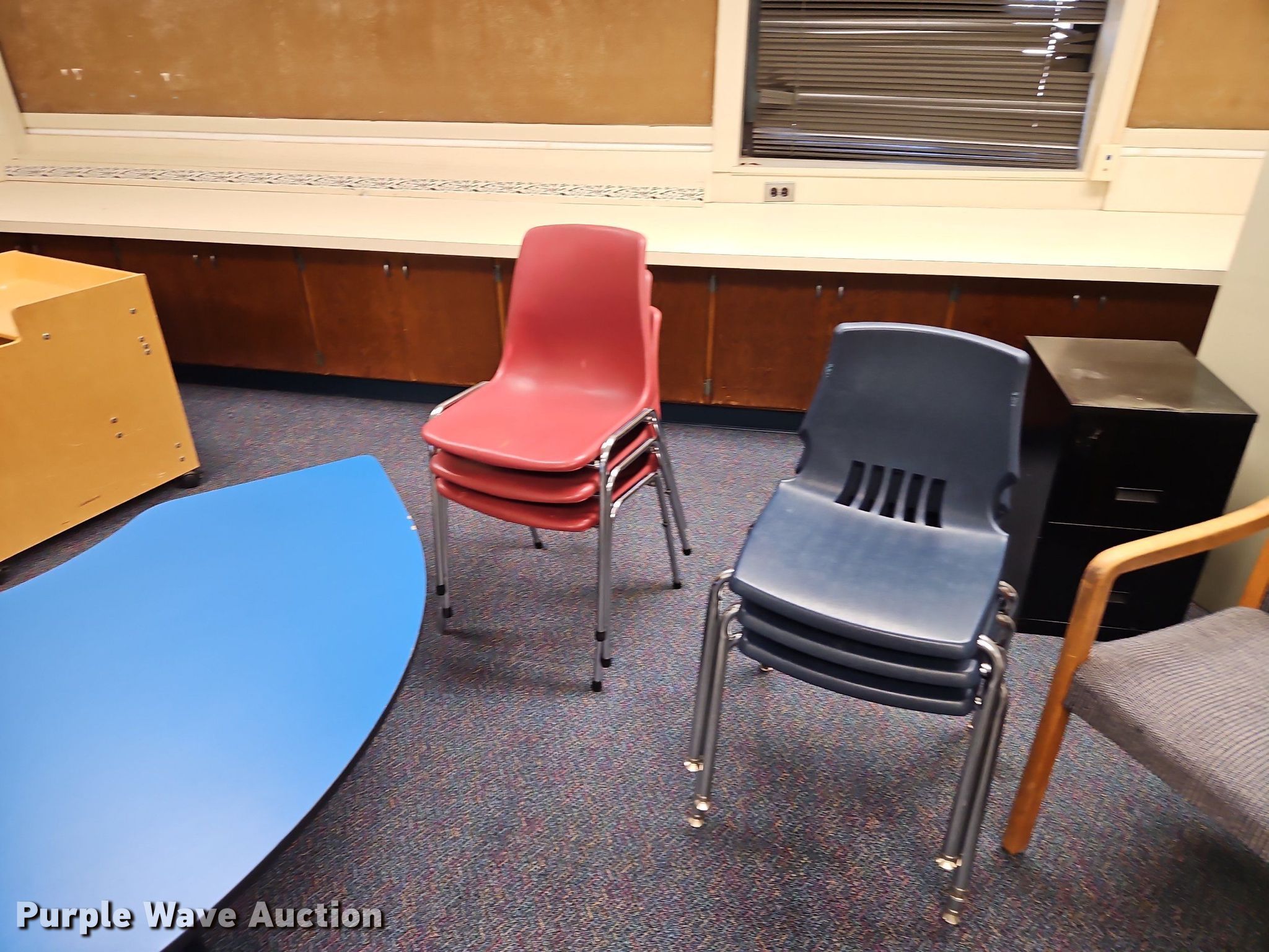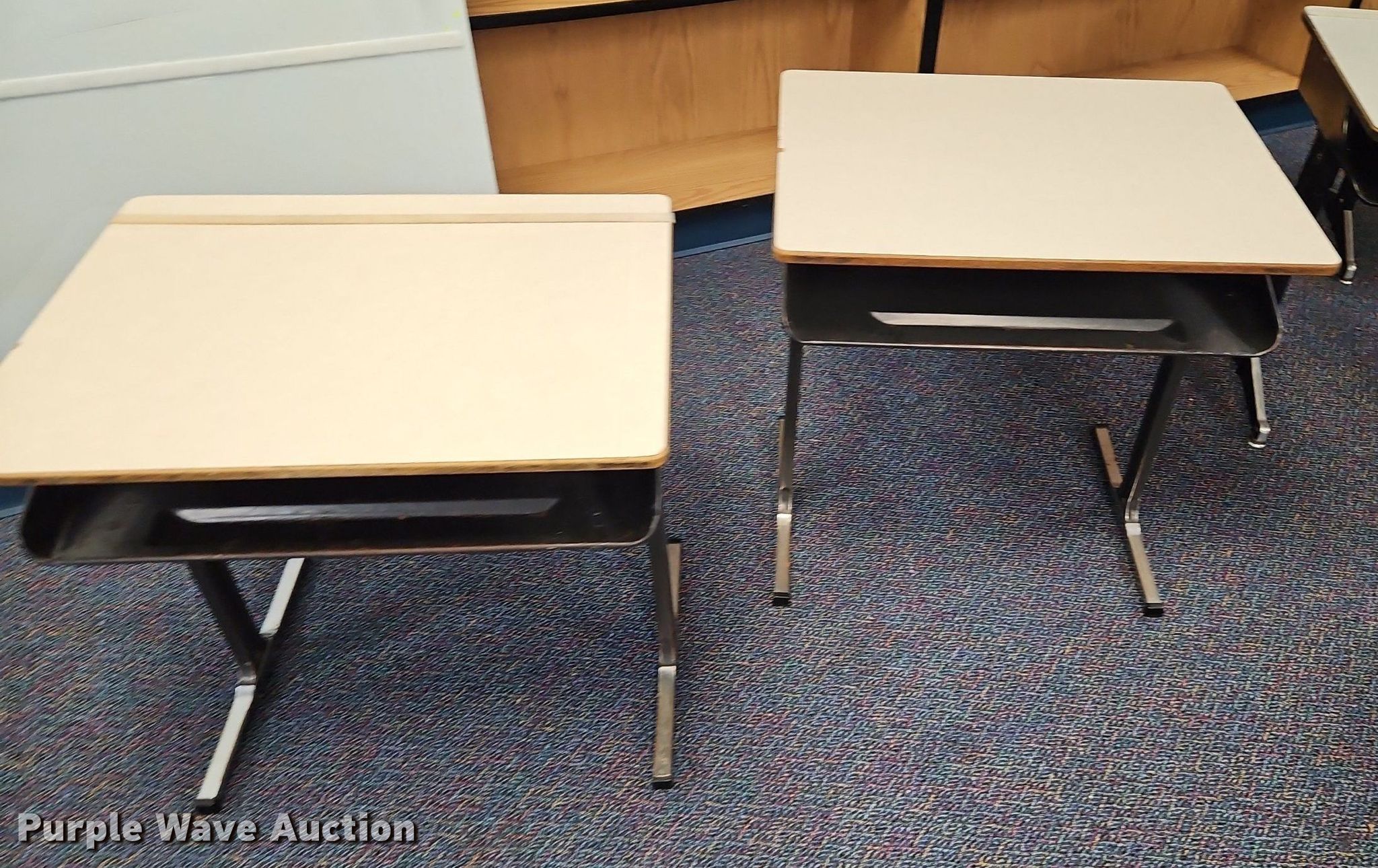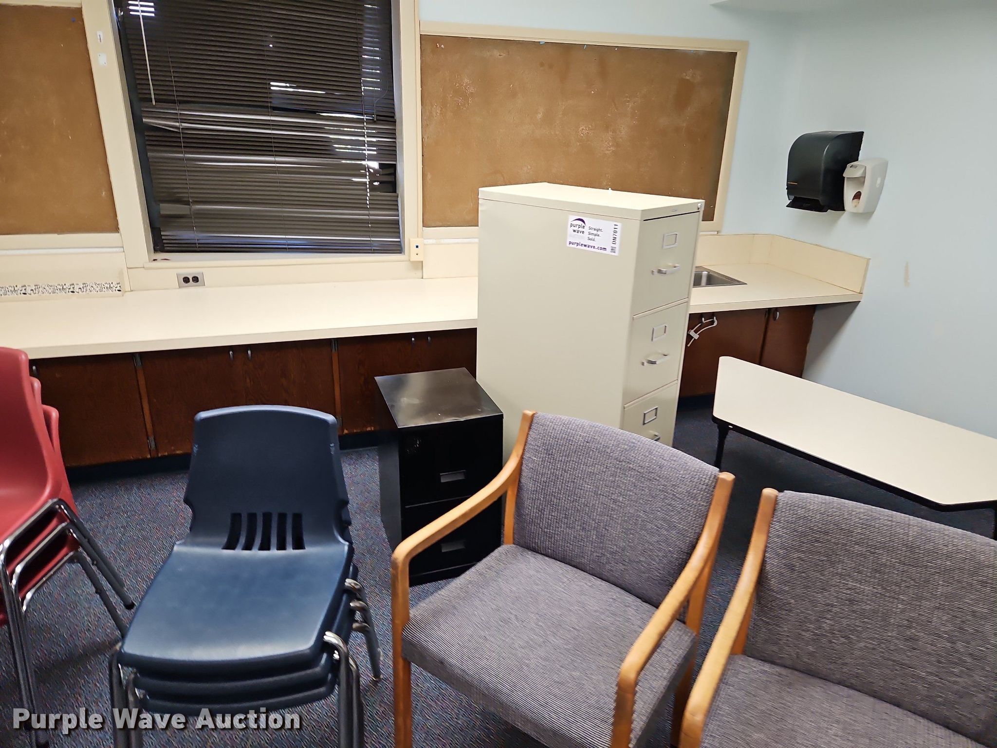 Purple Wave is selling a used Furniture in Kansas. This item is a Furniture with the following: (7) tables, (5) student desks, (8) chairs, (2) filing cabinets, Bookshelf