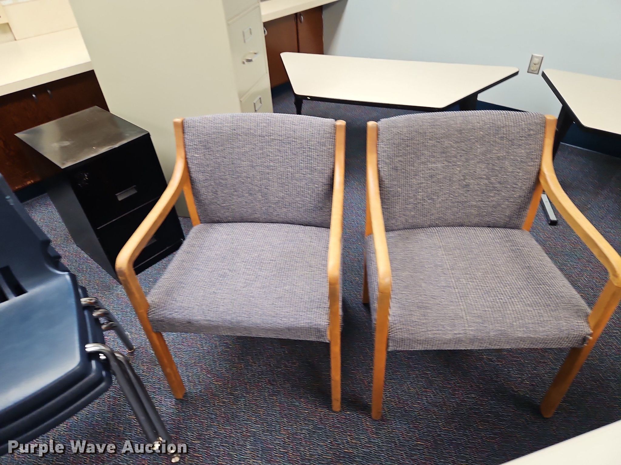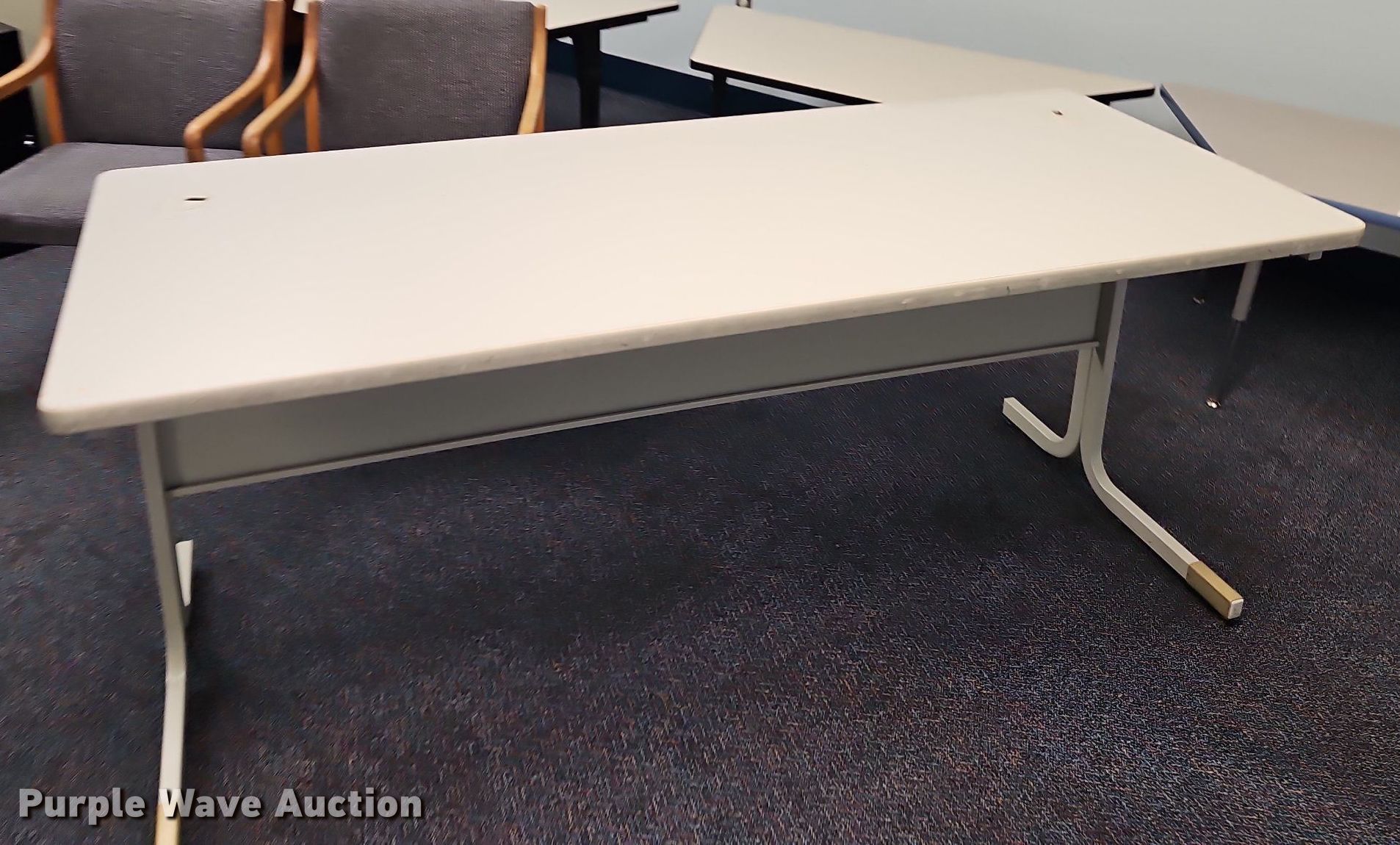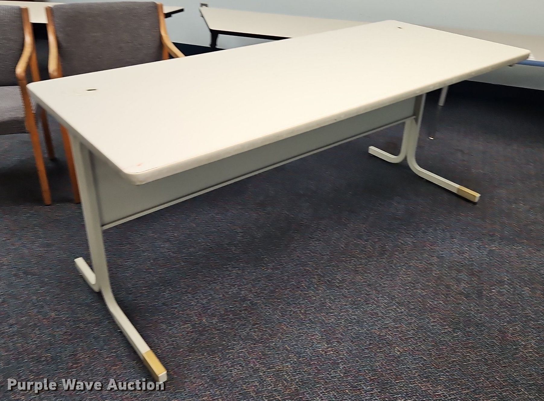 Purple Wave is selling a used Furniture in Kansas. This item is a Furniture with the following: (7) tables, (5) student desks, (8) chairs, (2) filing cabinets, Bookshelf