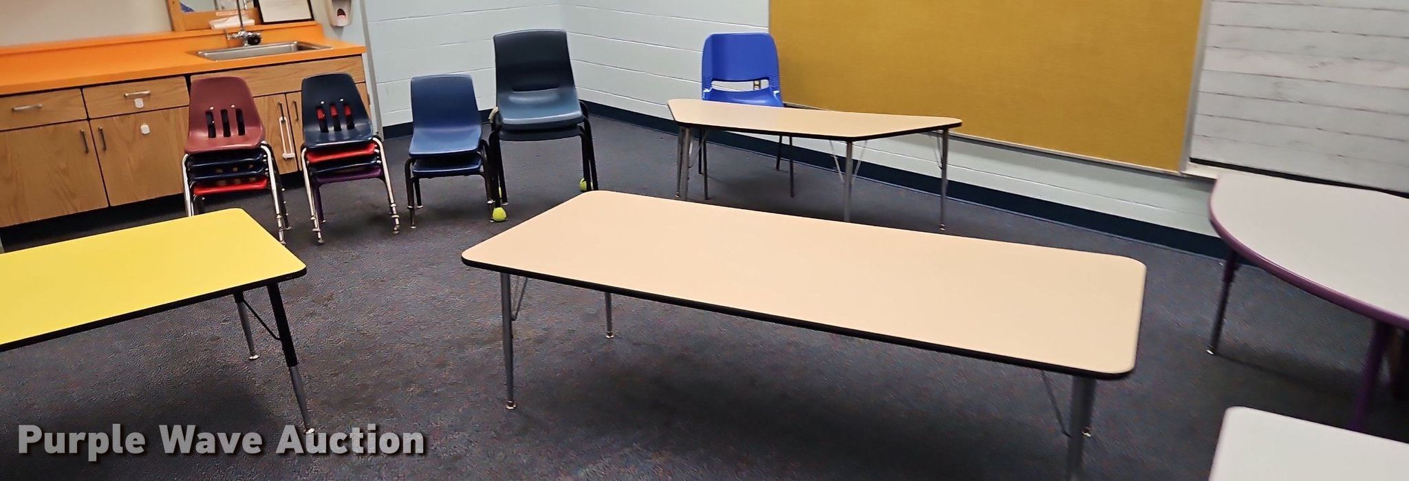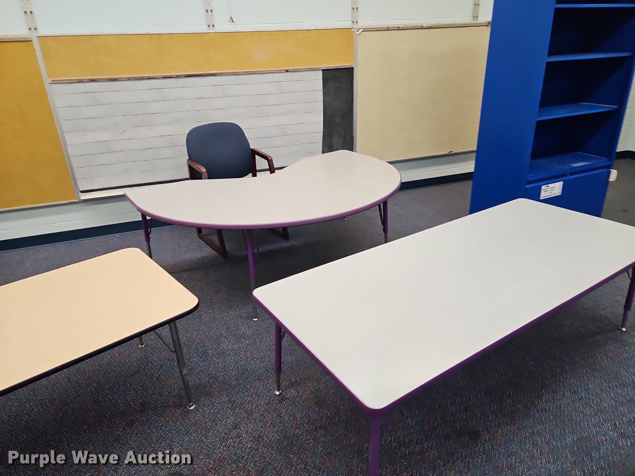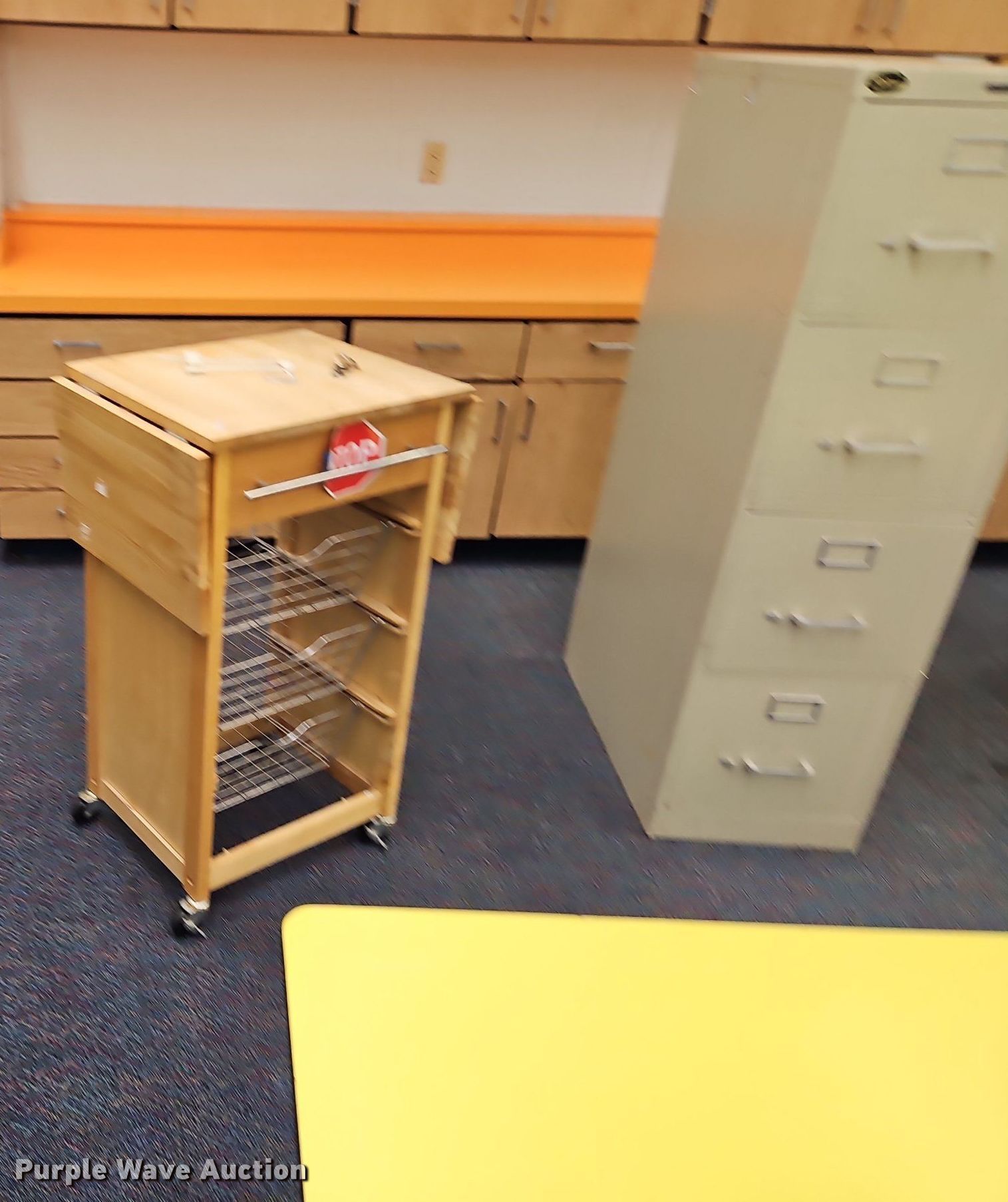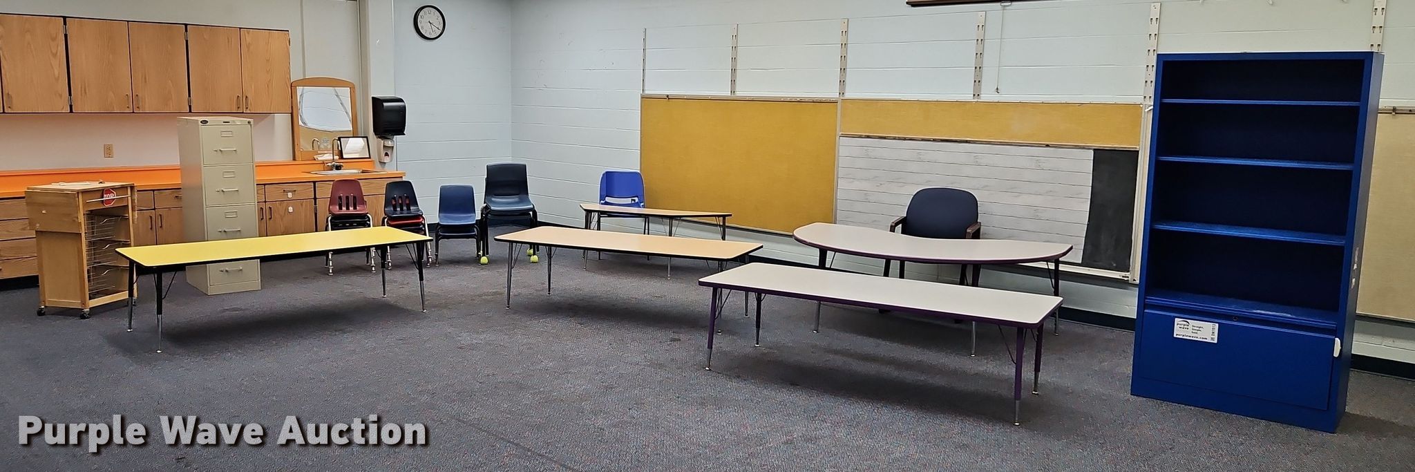 Purple Wave is selling a used Furniture in Kansas. This item is a Furniture with the following: (5) tables, (14) chairs, Metal cabinet, Metal filing cabinet