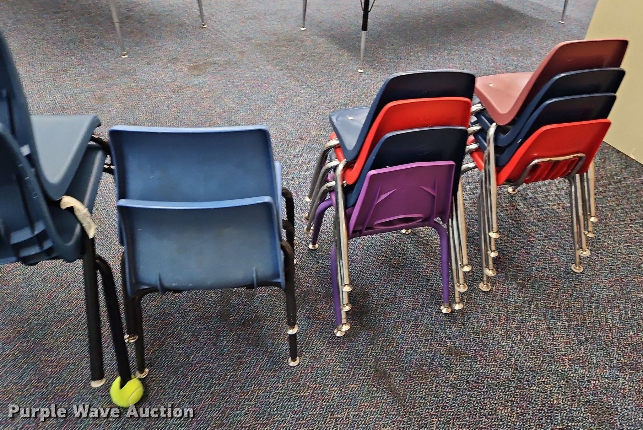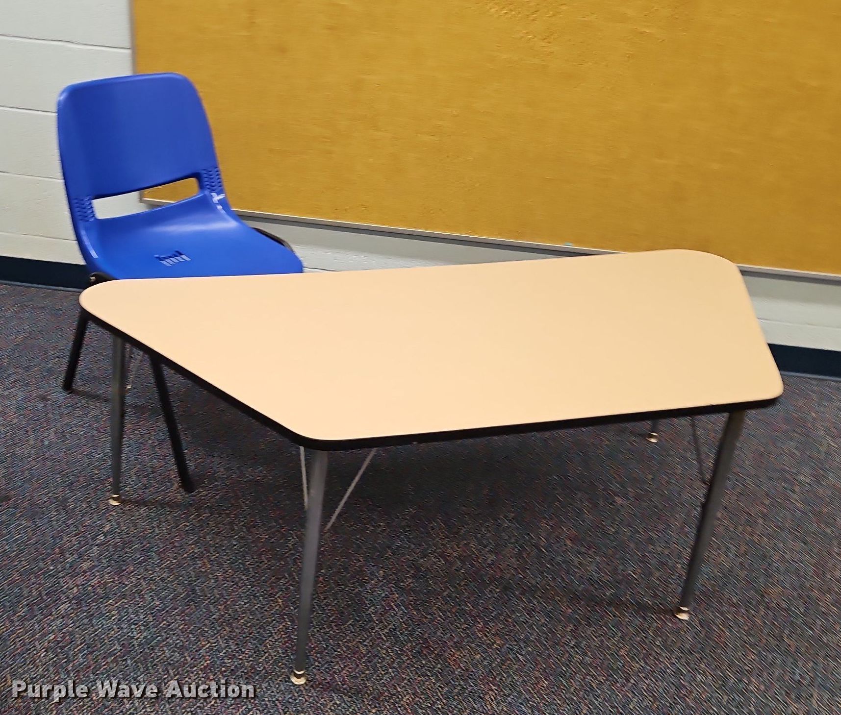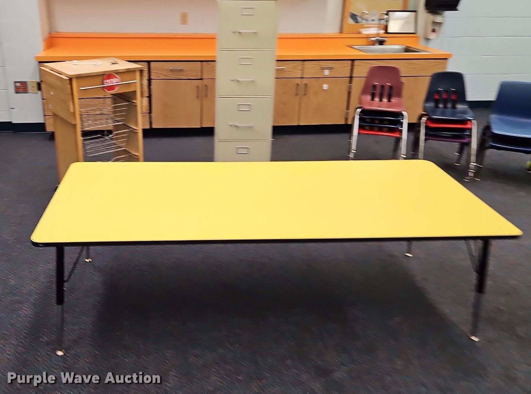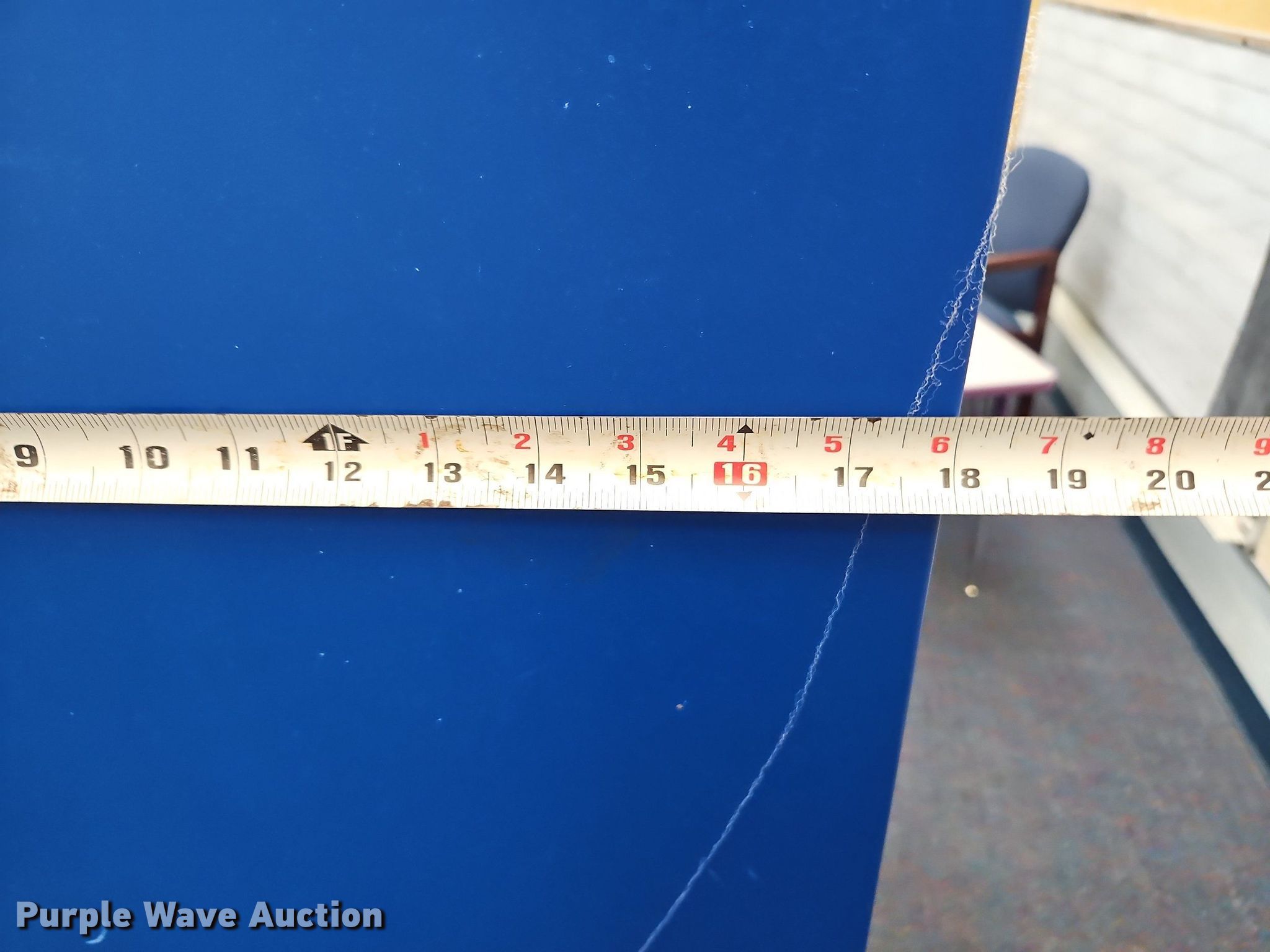 Purple Wave is selling a used Furniture in Kansas. This item is a Furniture with the following: (5) tables, (14) chairs, Metal cabinet, Metal filing cabinet