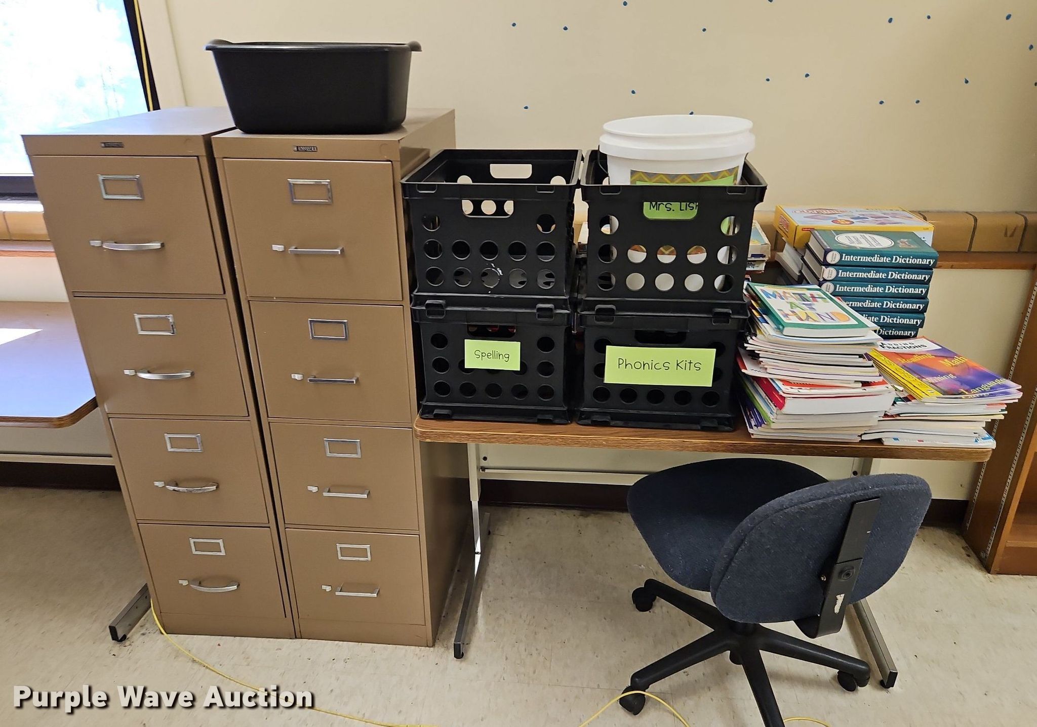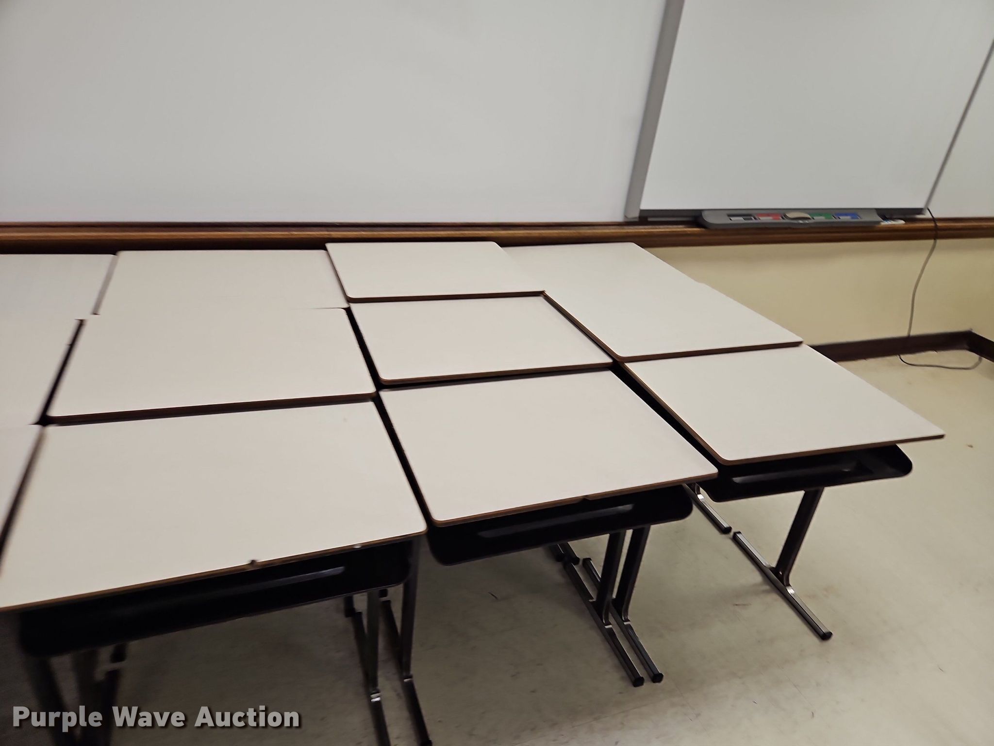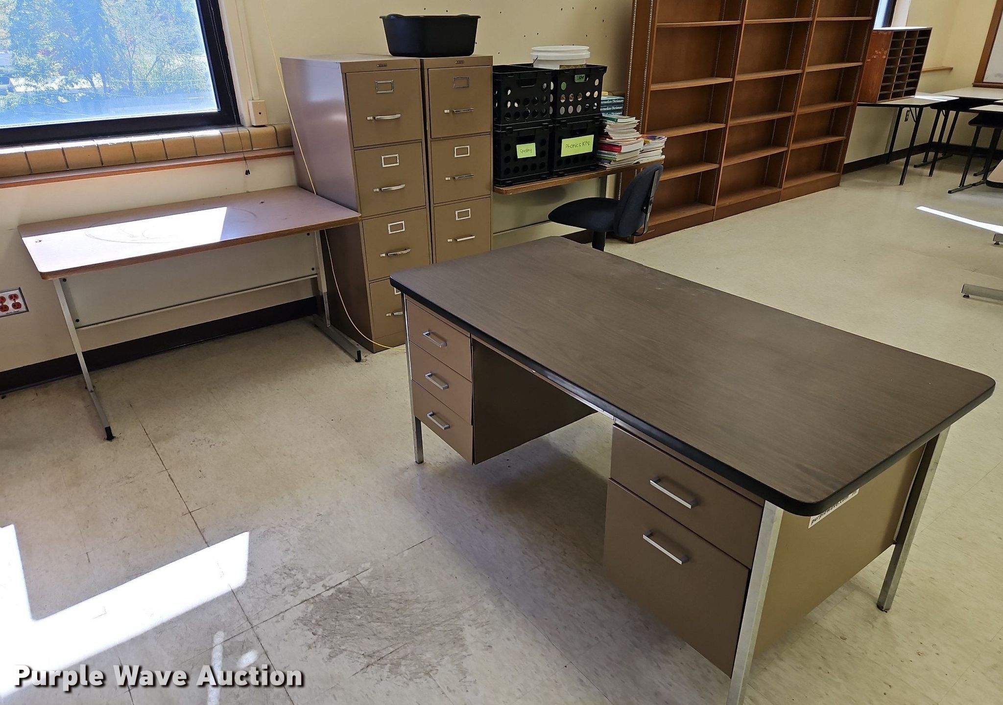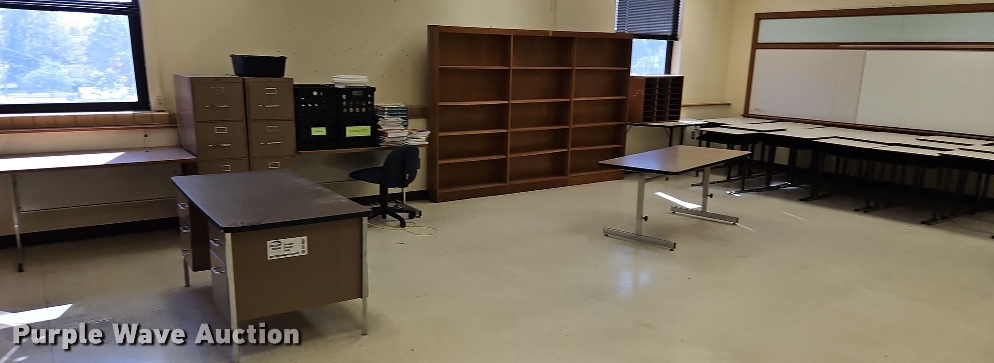 Purple Wave is selling a used Furniture in Kansas. This item is a Furniture with the following: (18) student desks, (23) chairs, (4) tables, (2) metal filing cabinets, Lectern, Desk, Bookshelf, VCR/DVD player and more