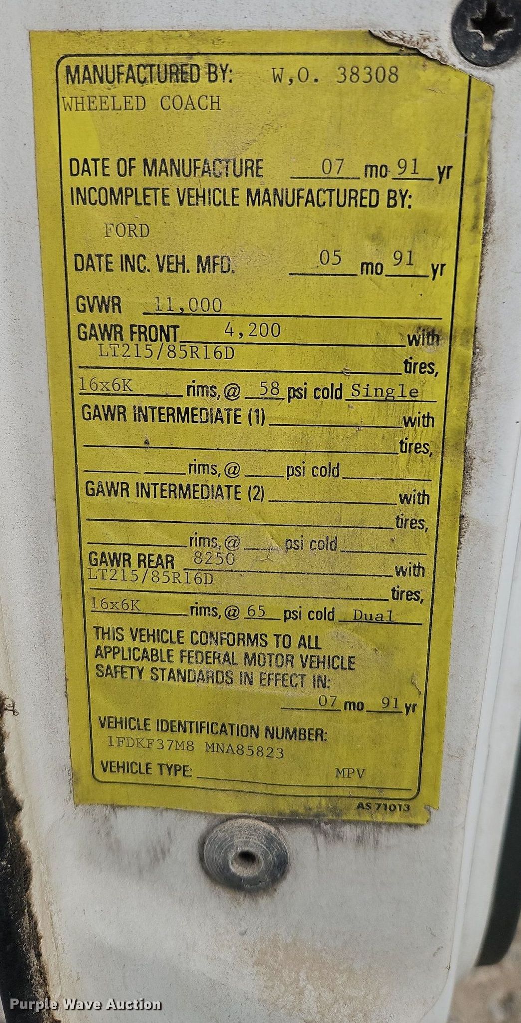 1991 Ford F350 XL ambulance. Miles: 55,370 on odometer, VIN: 1FDKF37M8MNA85823. Engine Ford, Displacement: 7.3L V8 OHV, Cylinders: 8, Fuel type: Diesel. Transmission Automatic. Chassis Axles: Single, Suspension: Spring, Brakes: Hydraulic, GVWR: 11,000 lbs. Interior AC, Heat, Power windows, Power locks, Cruise control, Auxiliary controls, Brake controller. Features Ambulance body Wheeled Coach I, PA/ siren controls, Oxygen hookups. Tires Size: 215/85R16. Notes Possible injection pump issue, will not start, Non-operational unit. Title distribution may be delayed up to 14 days from verification of funds. Bourbon County Public Works. 1427 215th St. Fort Scott, KS 66701