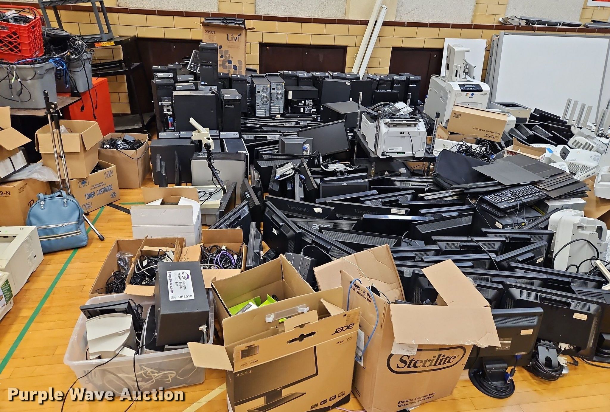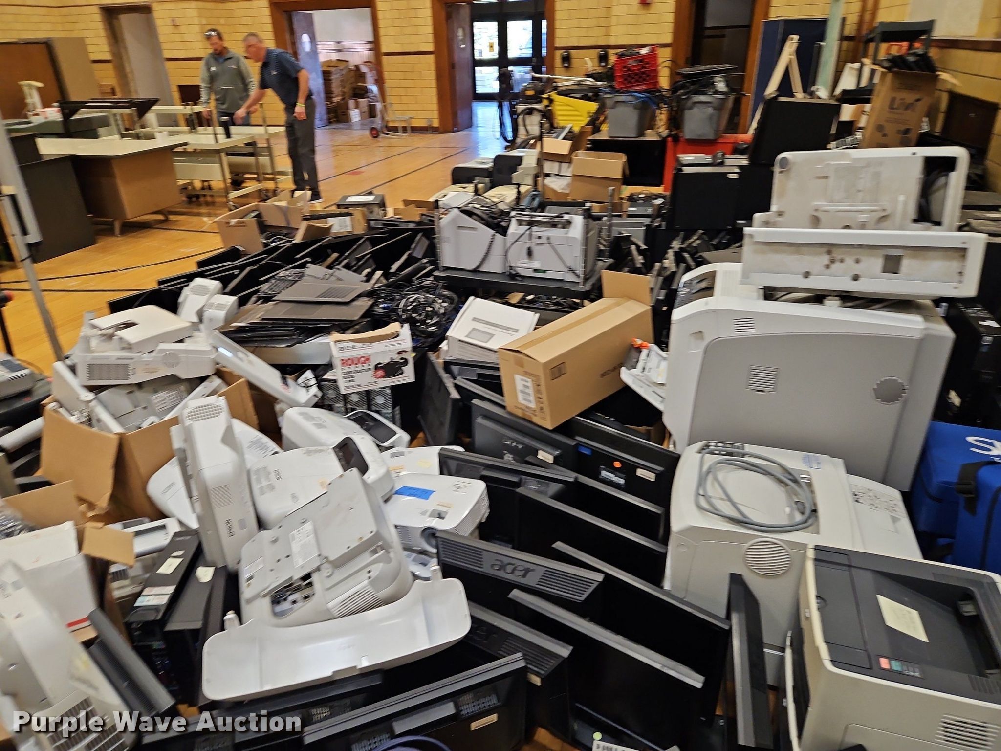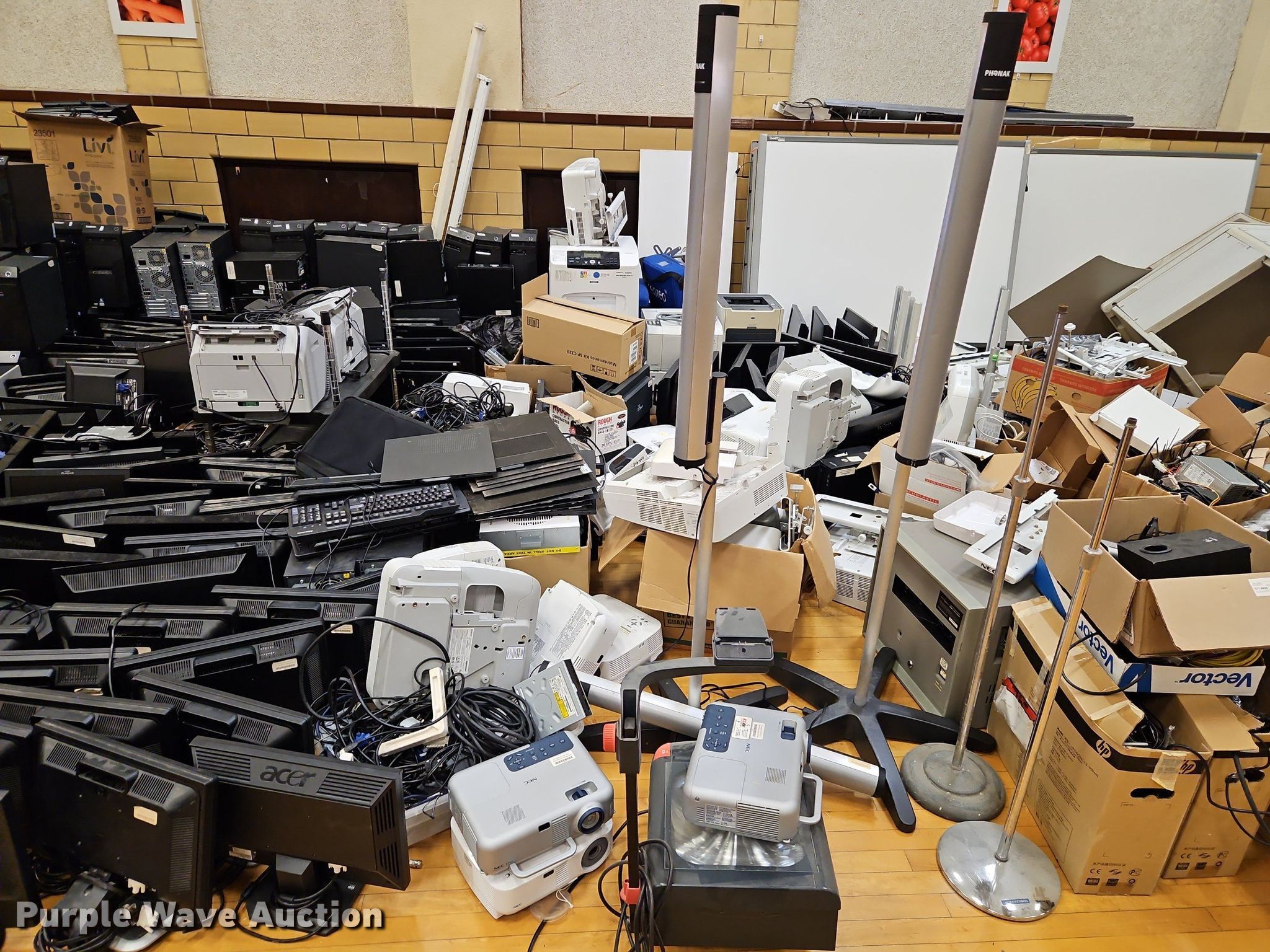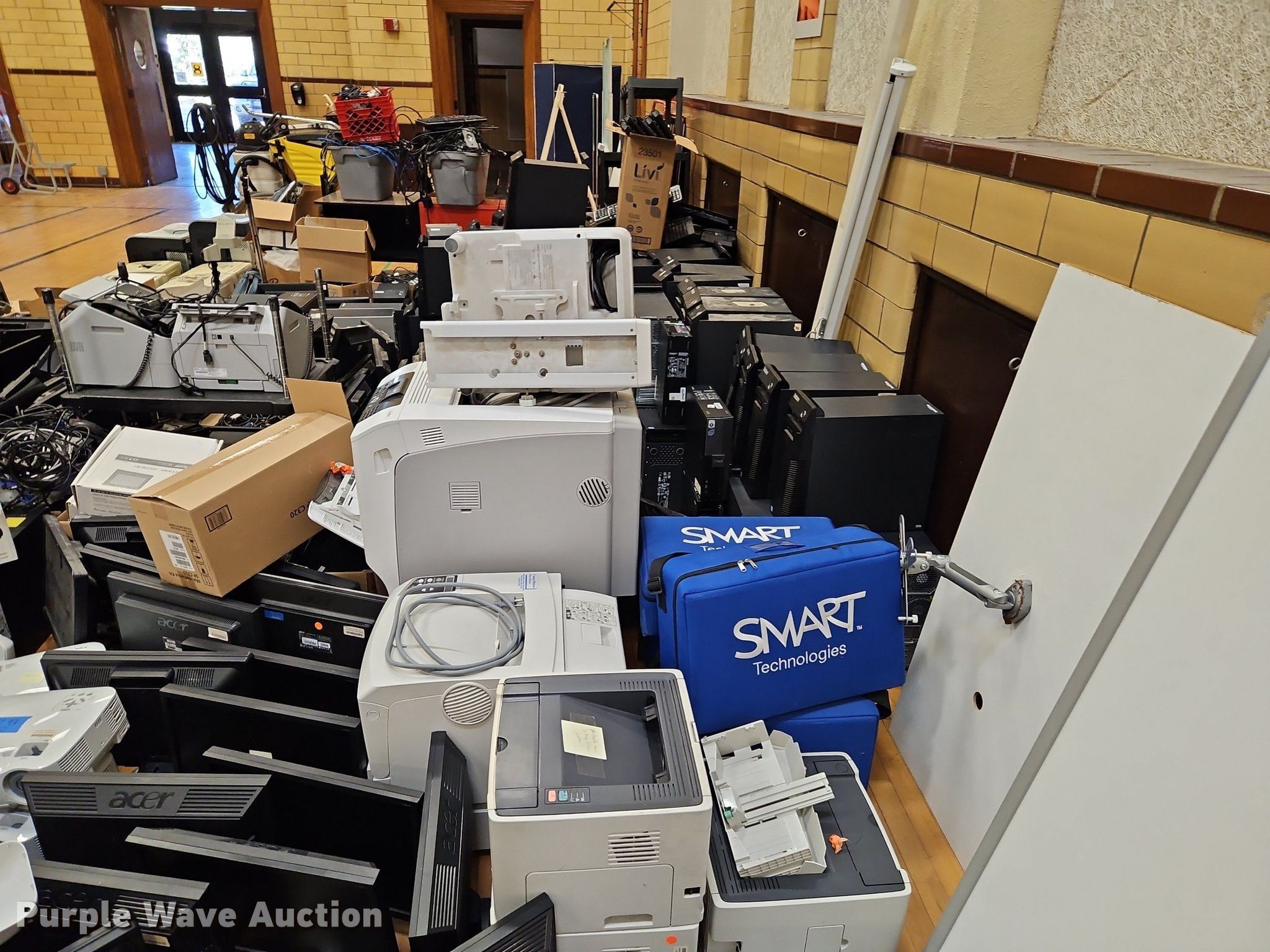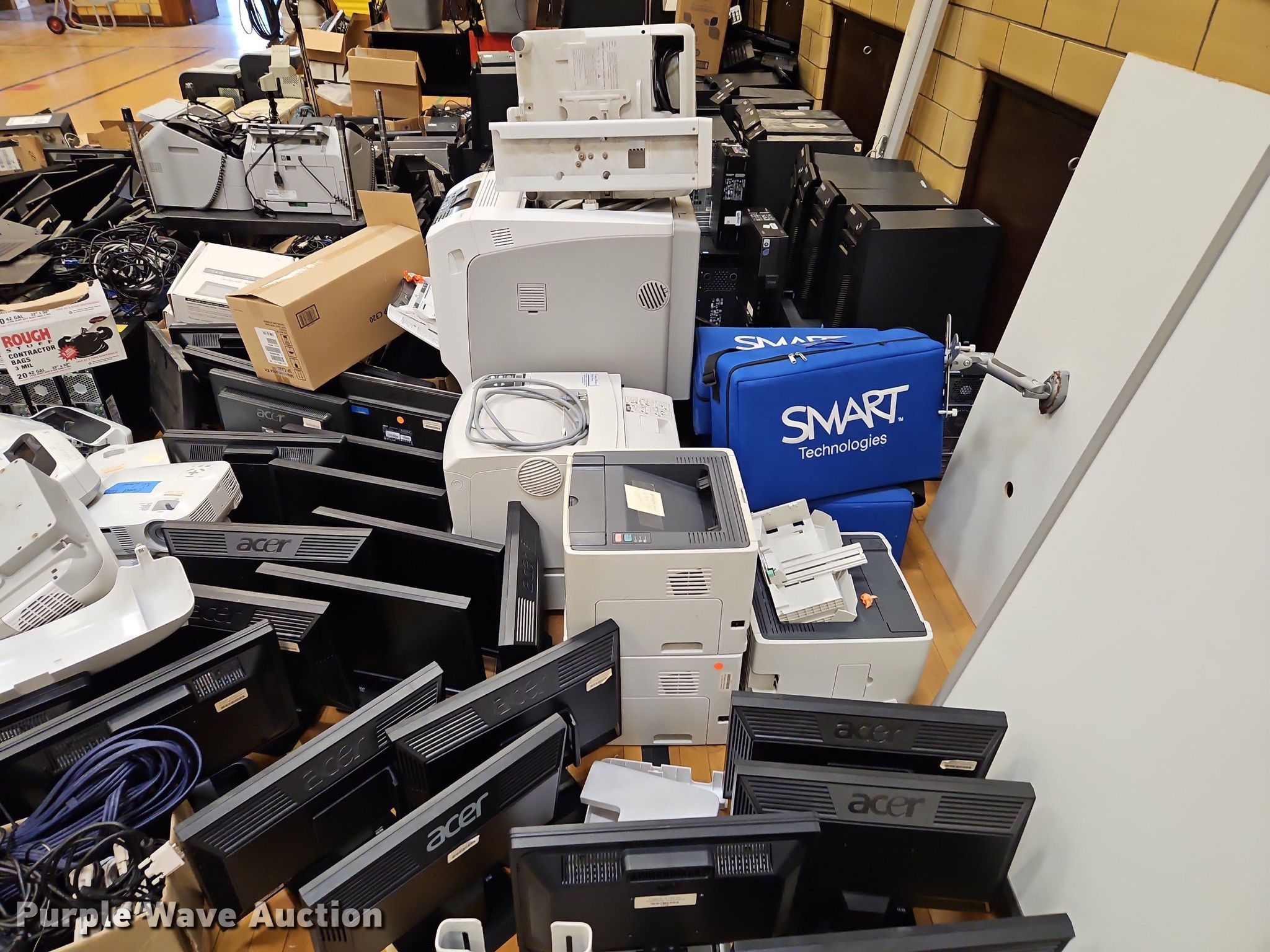 Purple Wave is selling a used Electronics in Kansas. This item is a Electronics with the following: Approx. 100 computer monitors, Approx. 100 computer towers, Approx. 20 printers, Approx. 20 projectors, (5) smart boards
