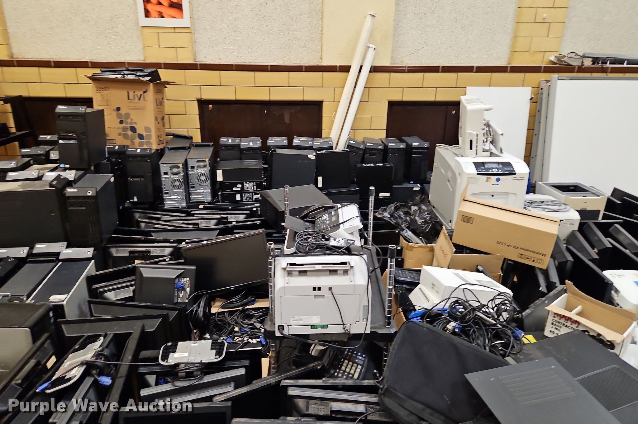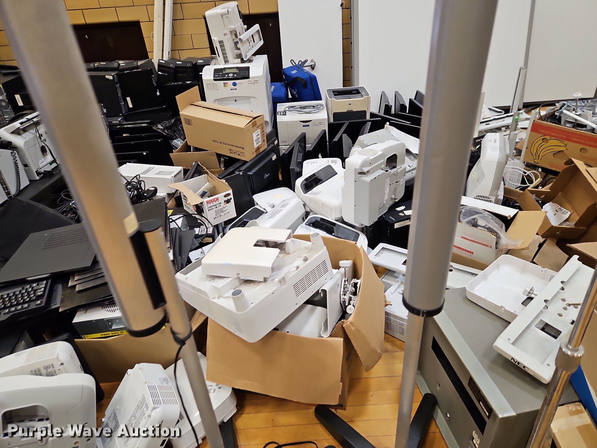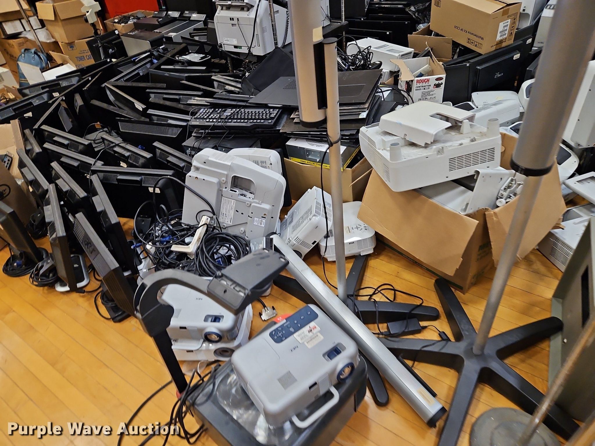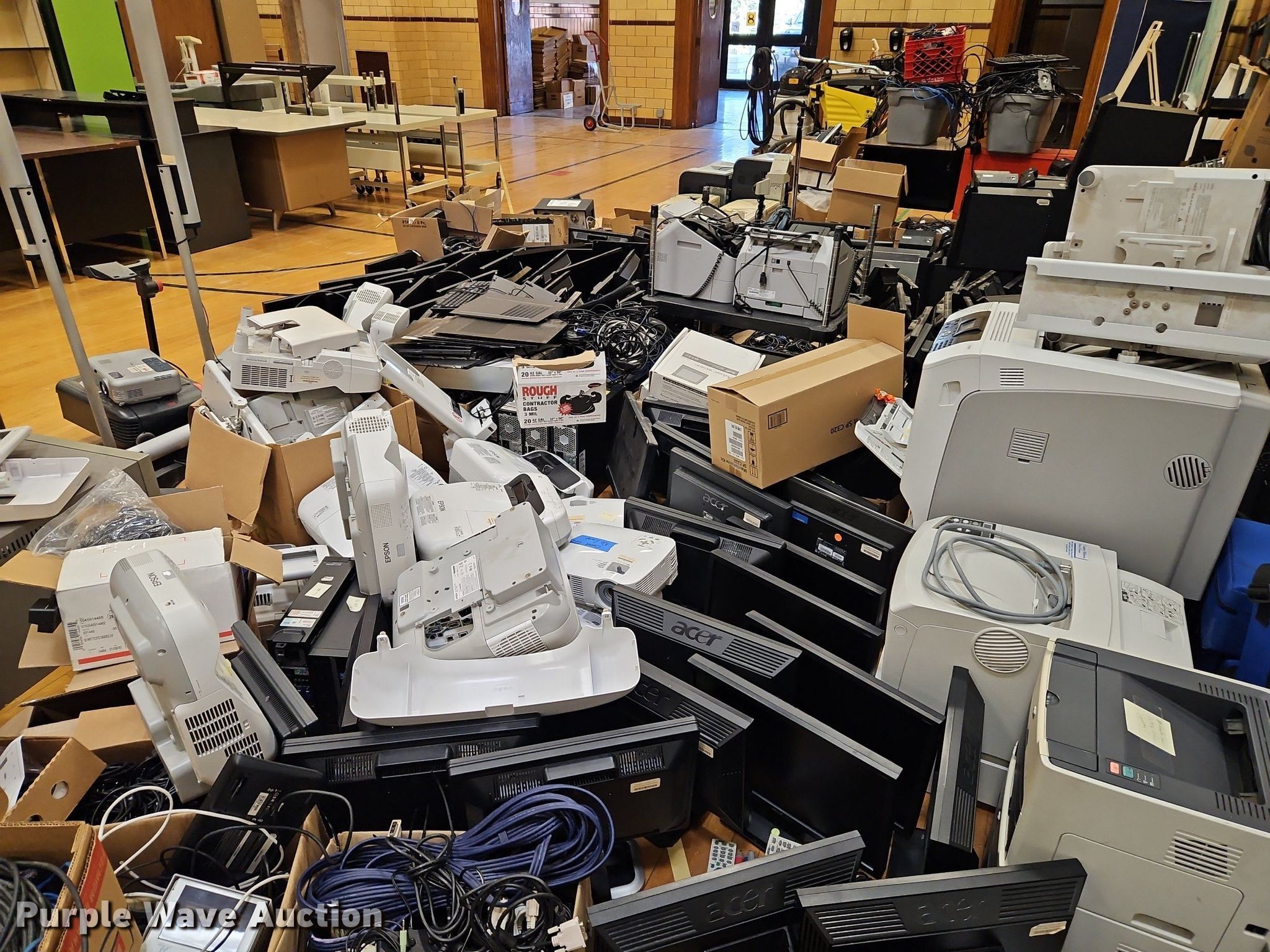 Purple Wave is selling a used Electronics in Kansas. This item is a Electronics with the following: Approx. 100 computer monitors, Approx. 100 computer towers, Approx. 20 printers, Approx. 20 projectors, (5) smart boards