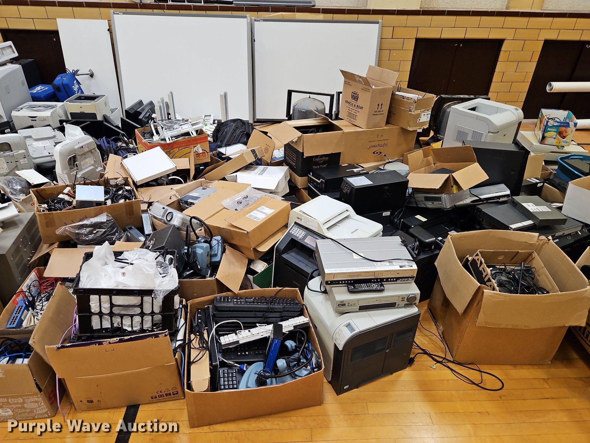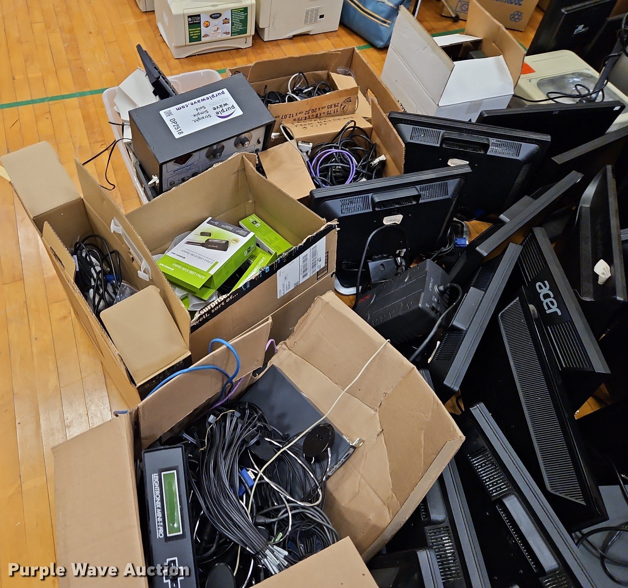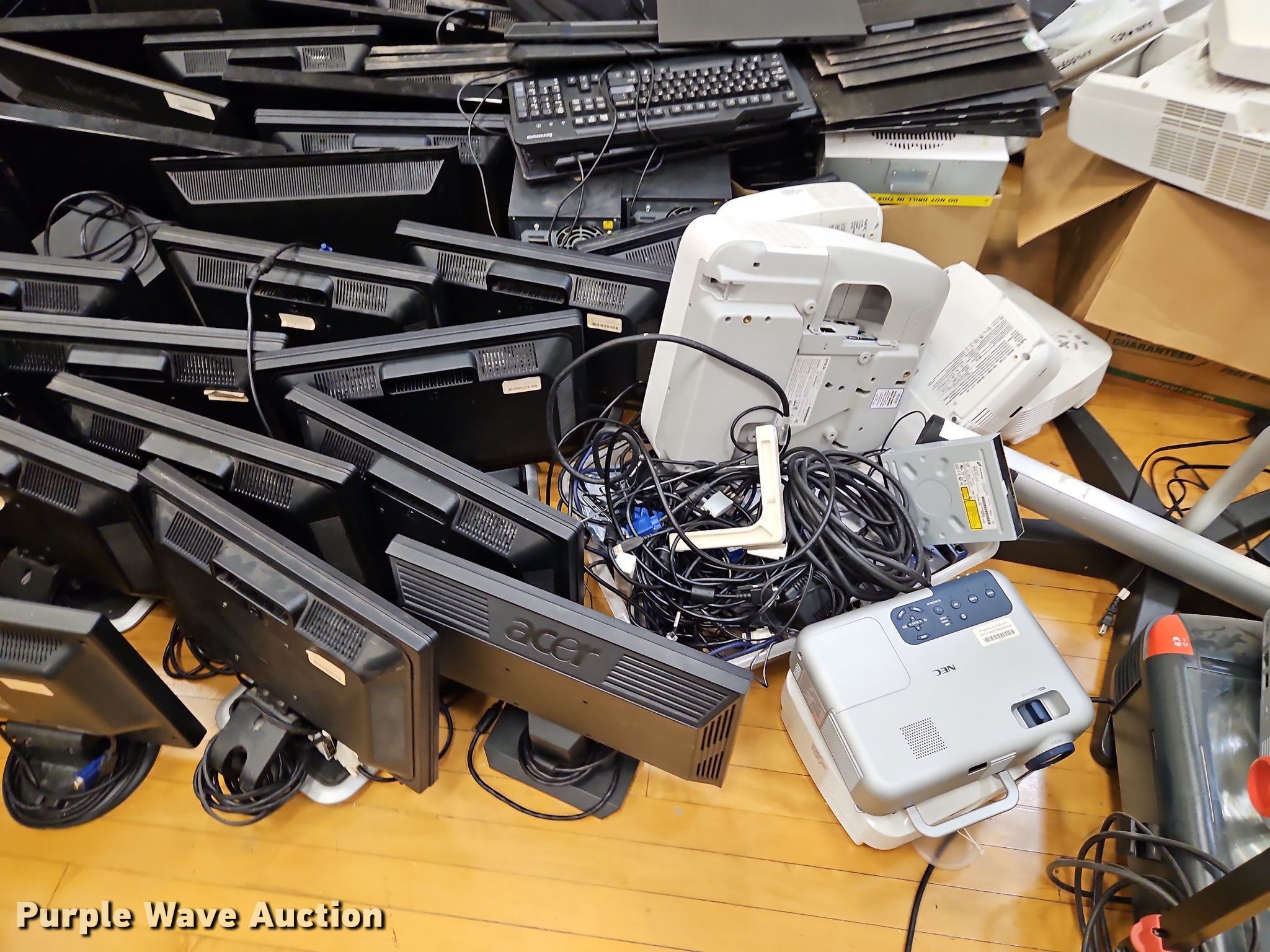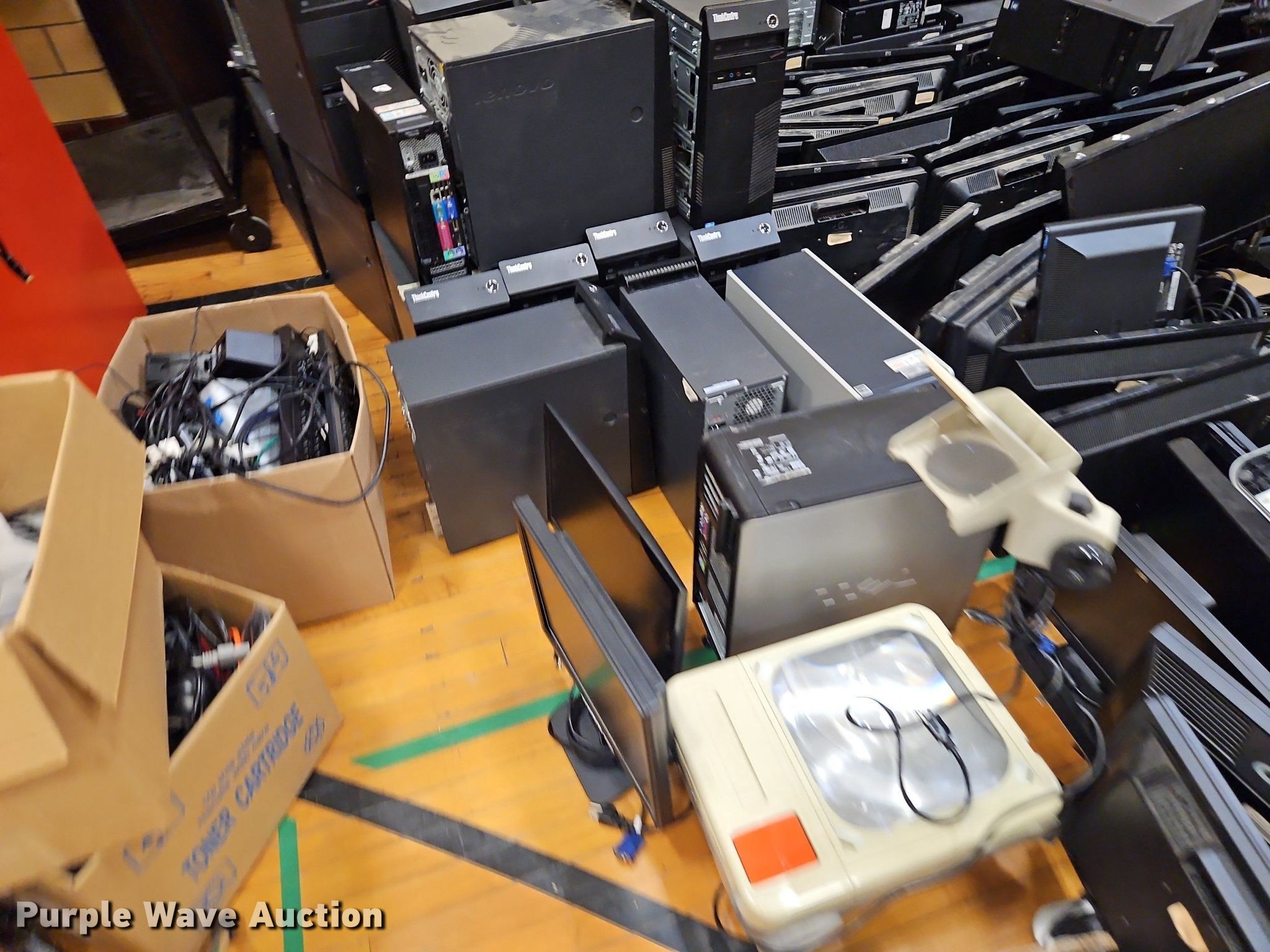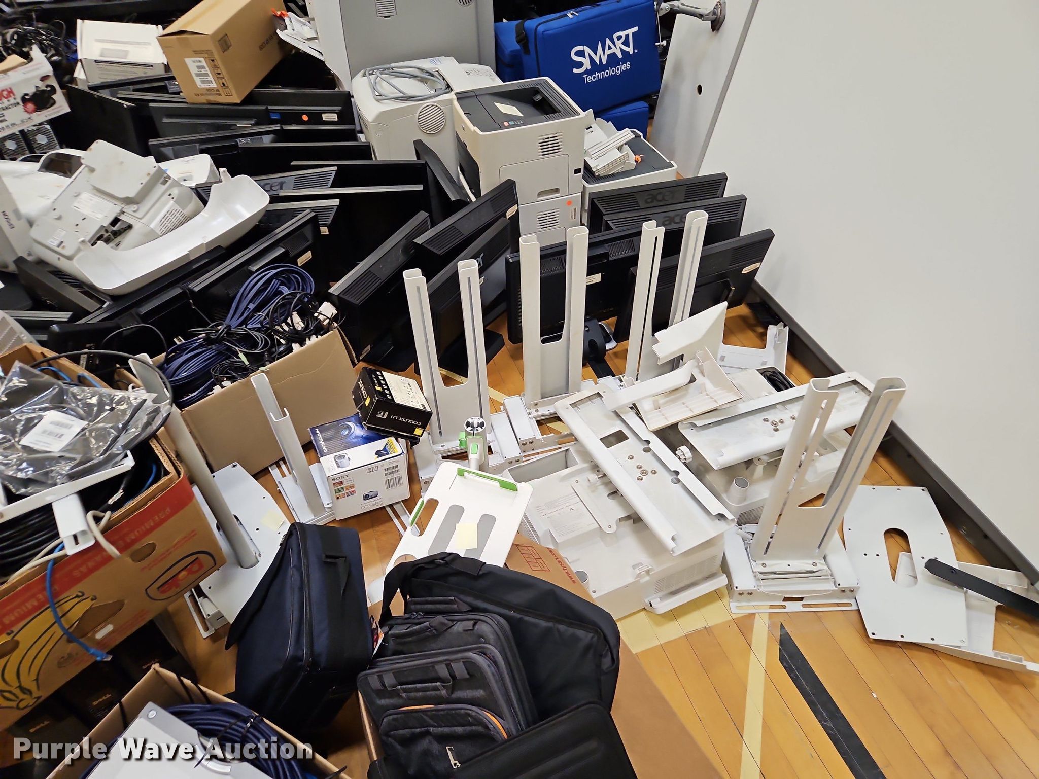 Purple Wave is selling a used Electronics in Kansas. This item is a Electronics with the following: Approx. 100 computer monitors, Approx. 100 computer towers, Approx. 20 printers, Approx. 20 projectors, (5) smart boards
