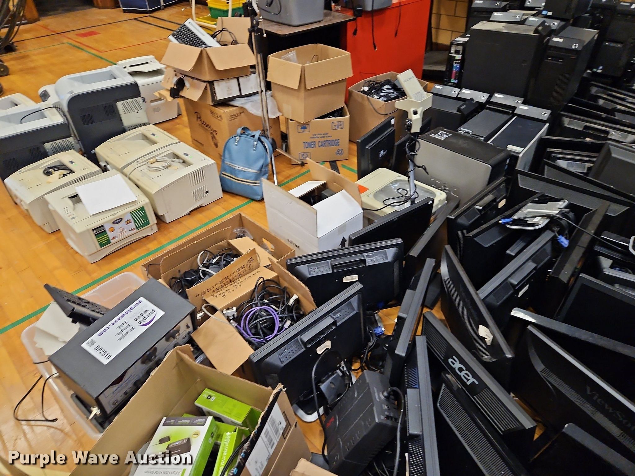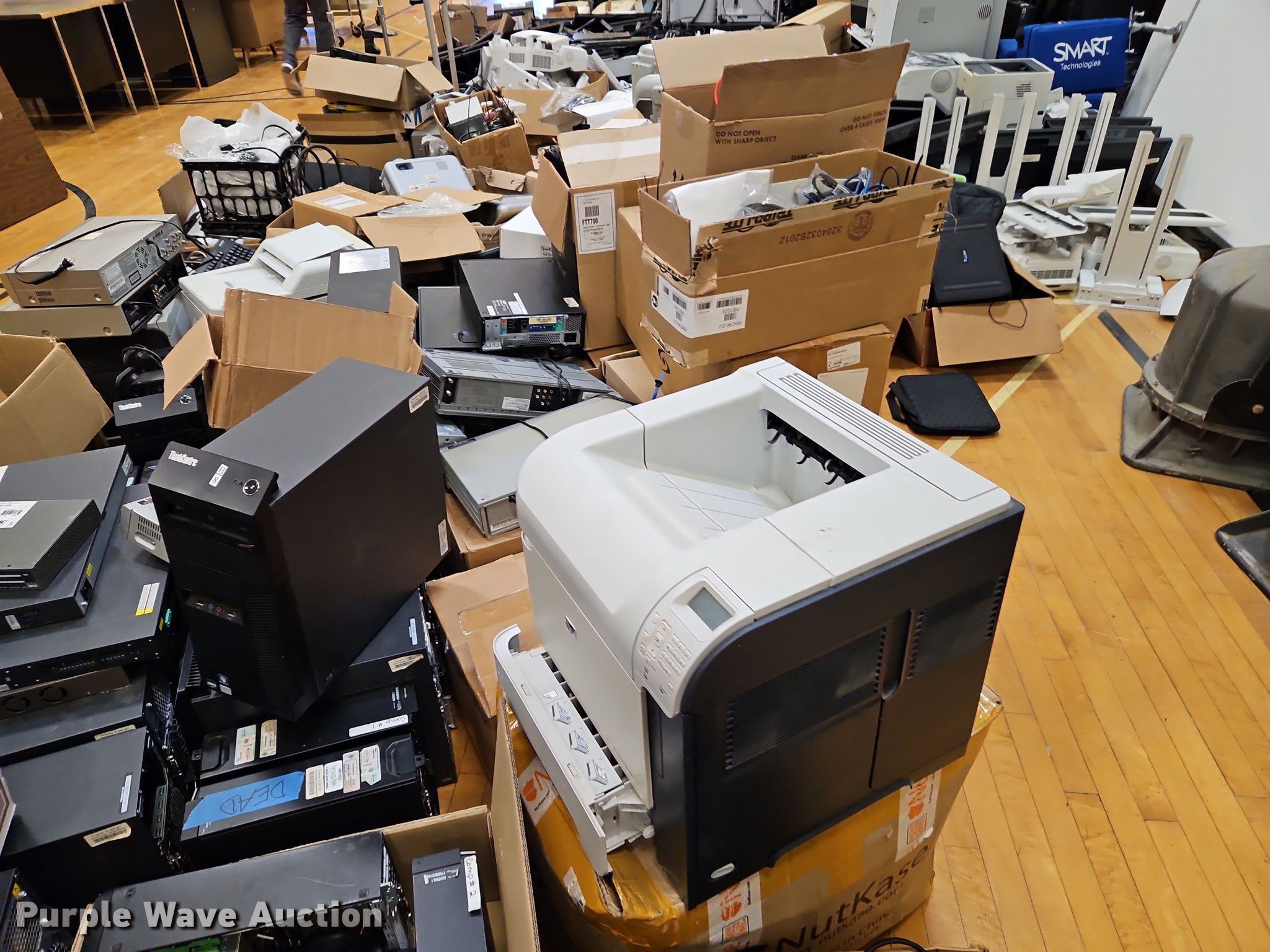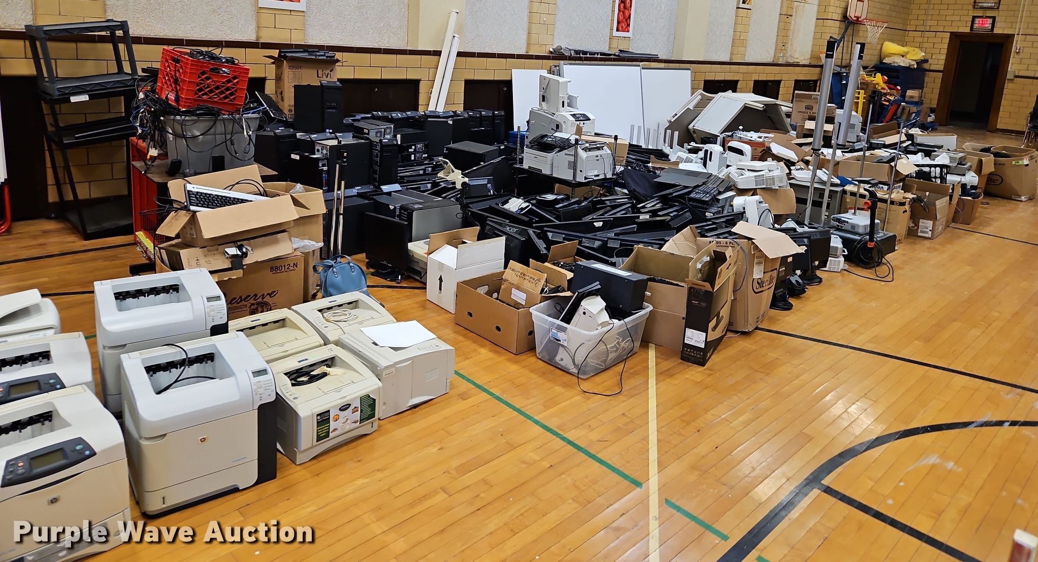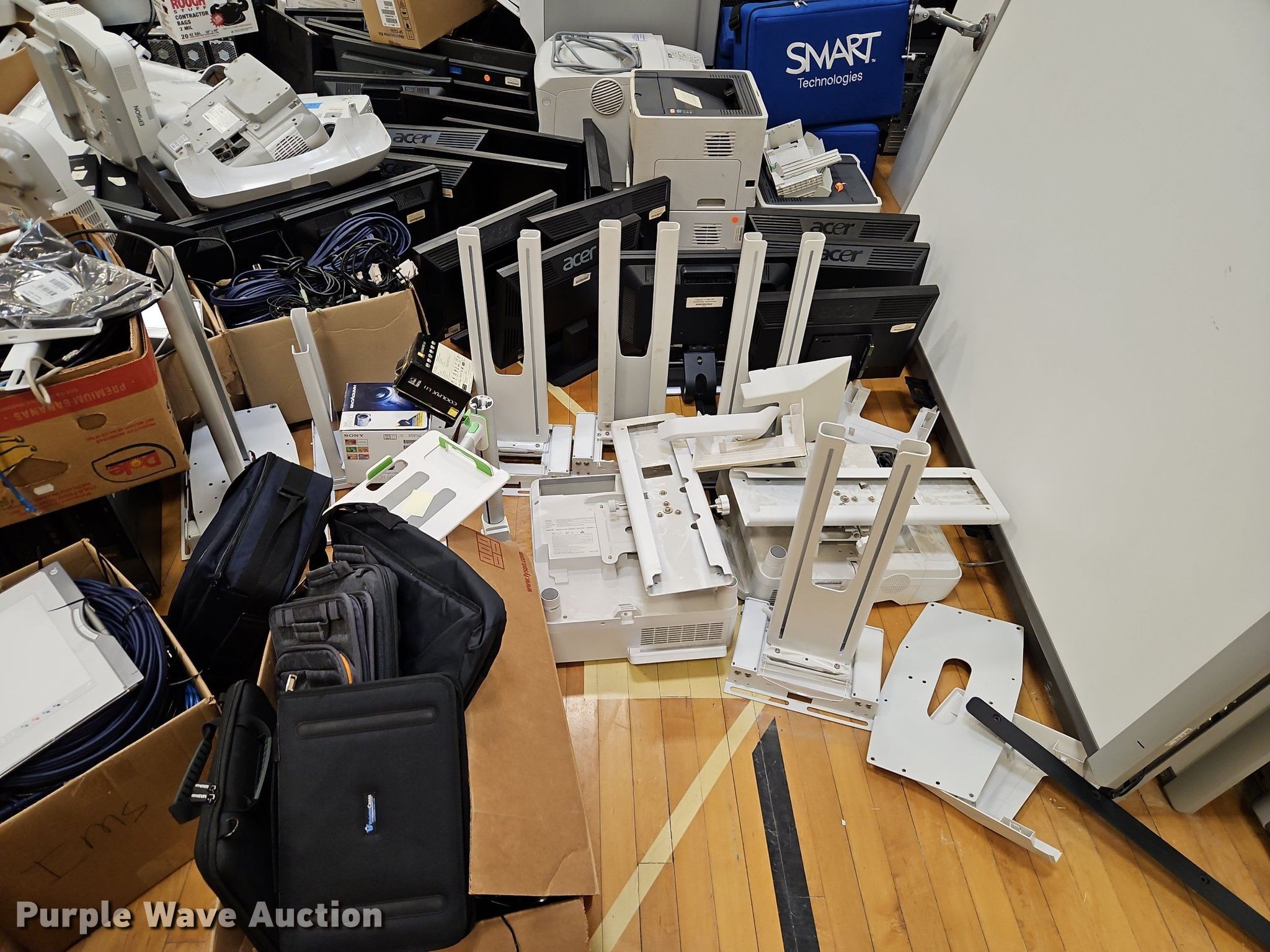 Purple Wave is selling a used Electronics in Kansas. This item is a Electronics with the following: Approx. 100 computer monitors, Approx. 100 computer towers, Approx. 20 printers, Approx. 20 projectors, (5) smart boards