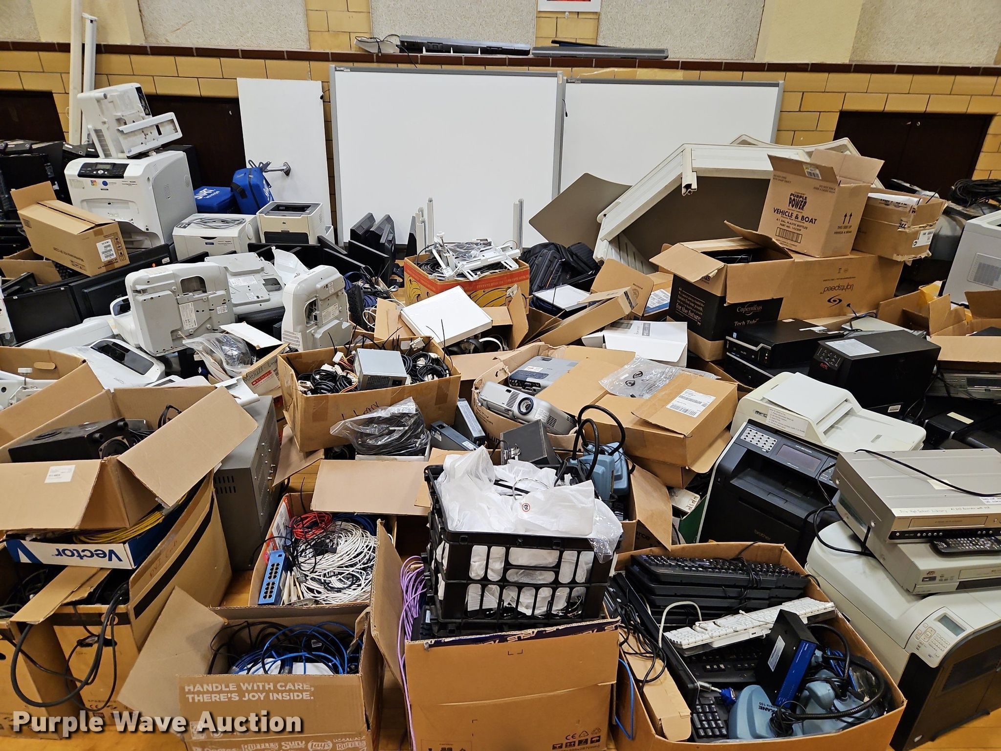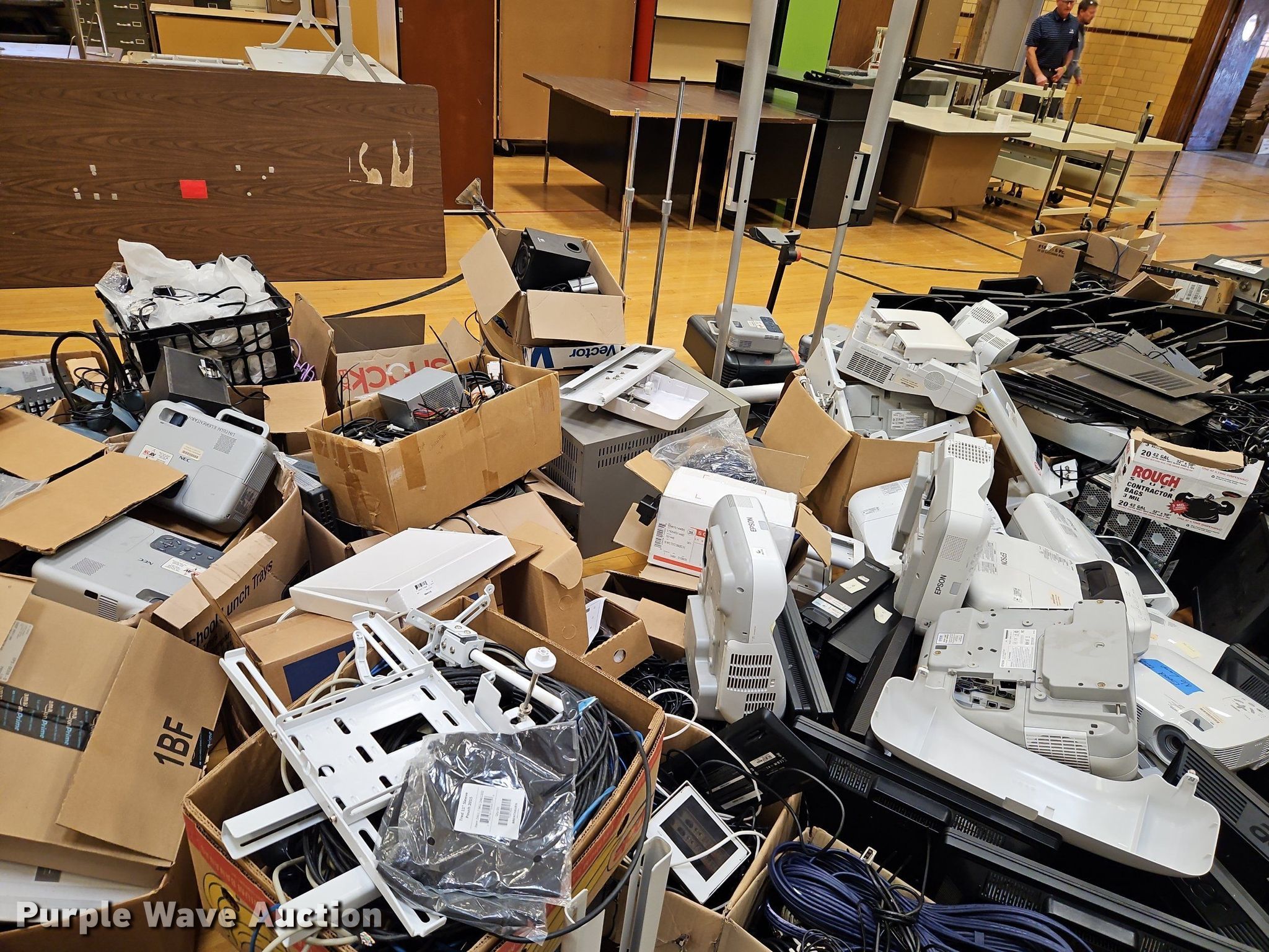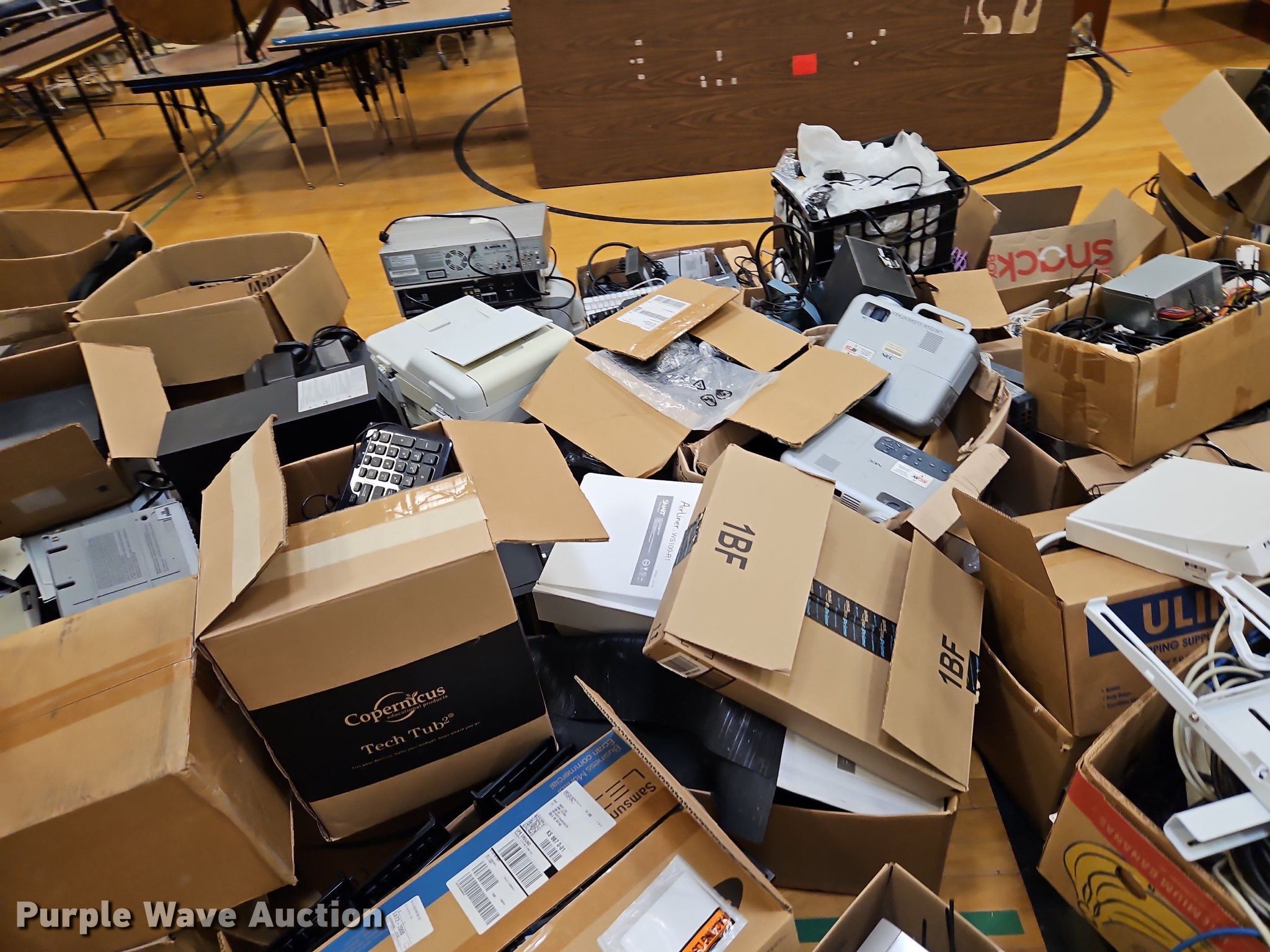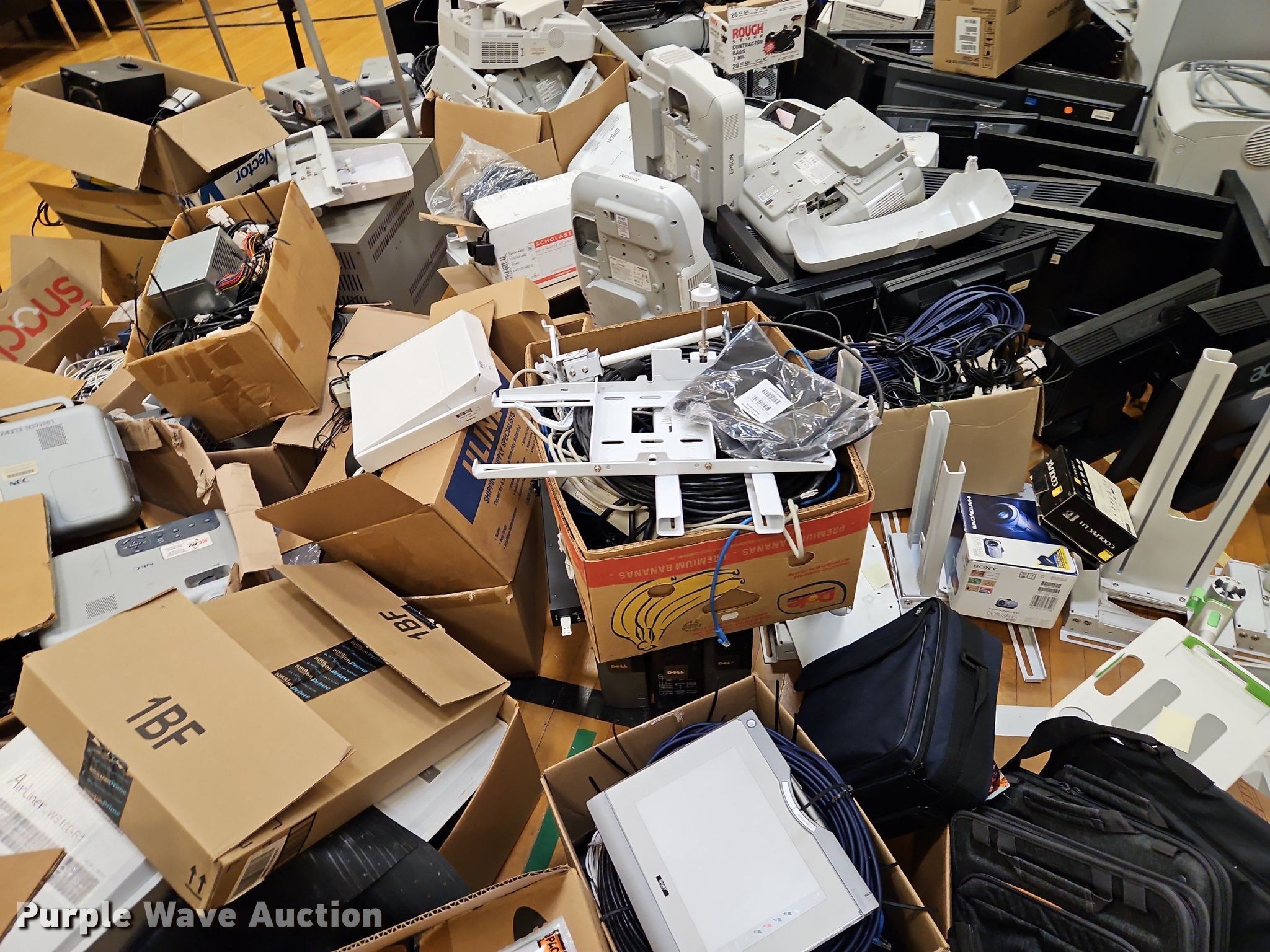 Purple Wave is selling a used Electronics in Kansas. This item is a Electronics with the following: Approx. 100 computer monitors, Approx. 100 computer towers, Approx. 20 printers, Approx. 20 projectors, (5) smart boards