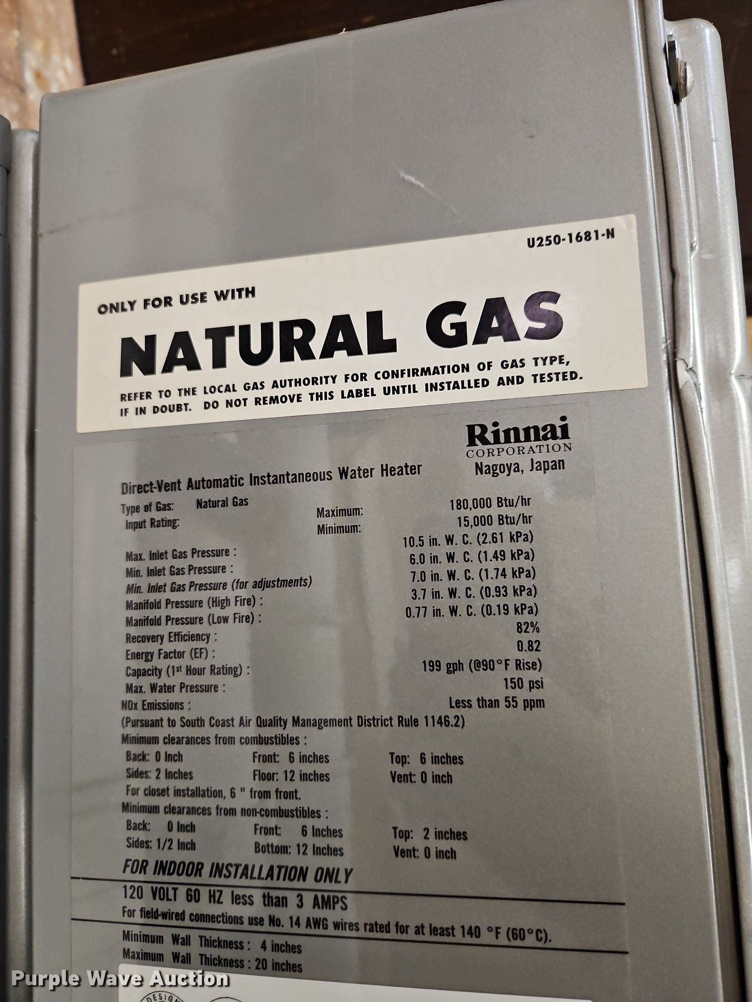 Purple Wave is selling a used Appliances in Kansas. This item is a (2) Rinnai R85 instant hot water heaters with the following: Natural gas, Vent pips