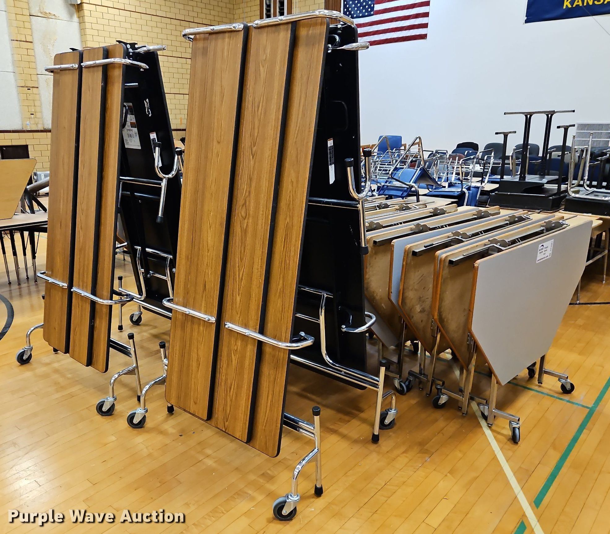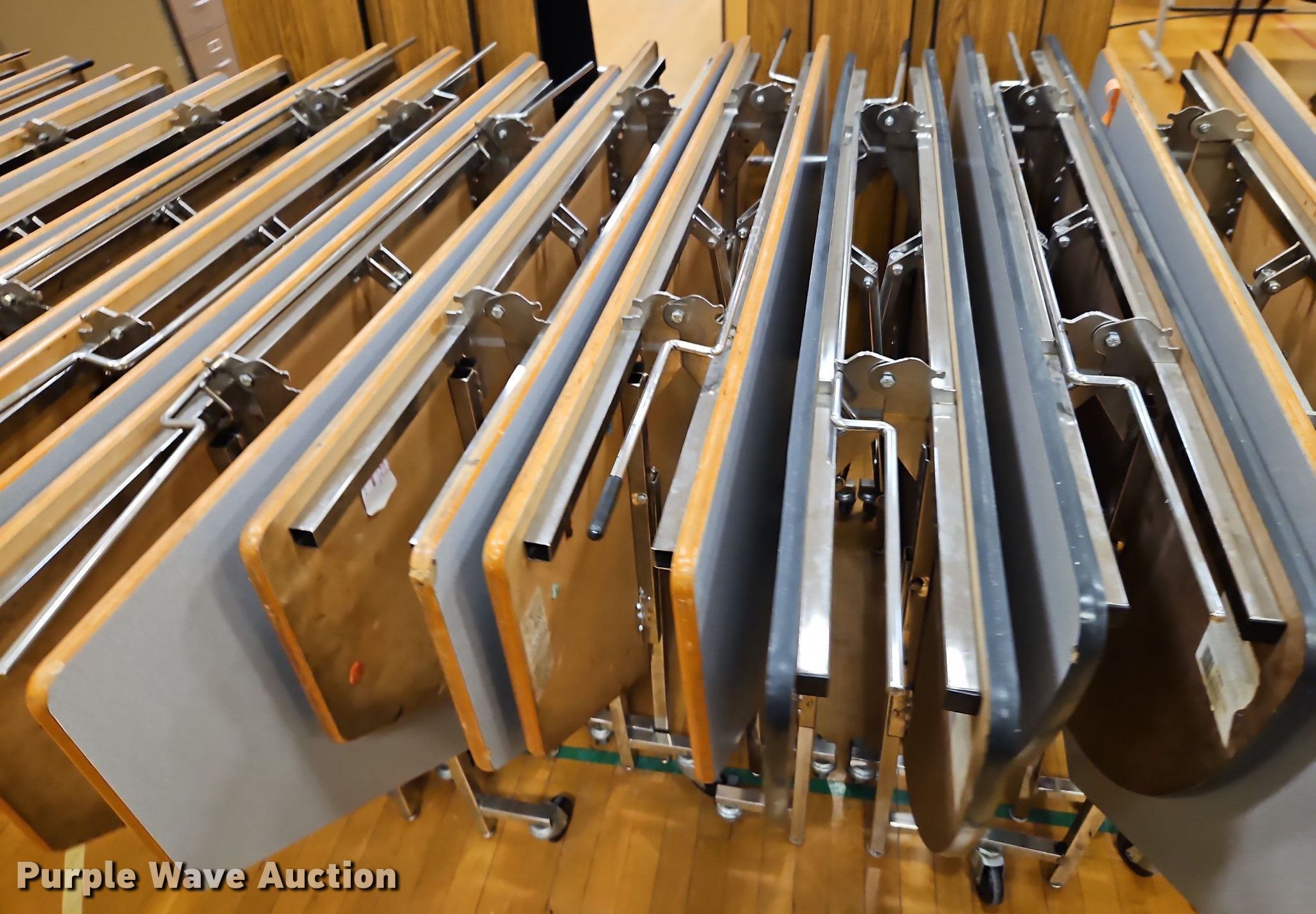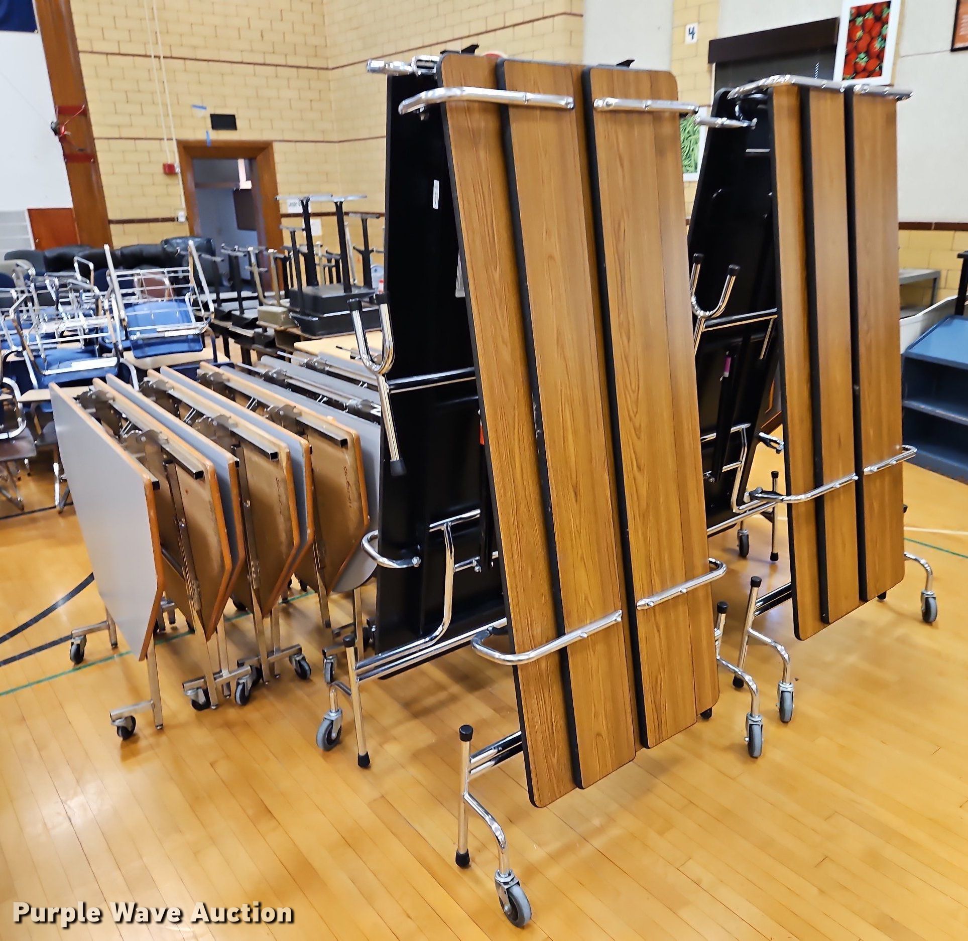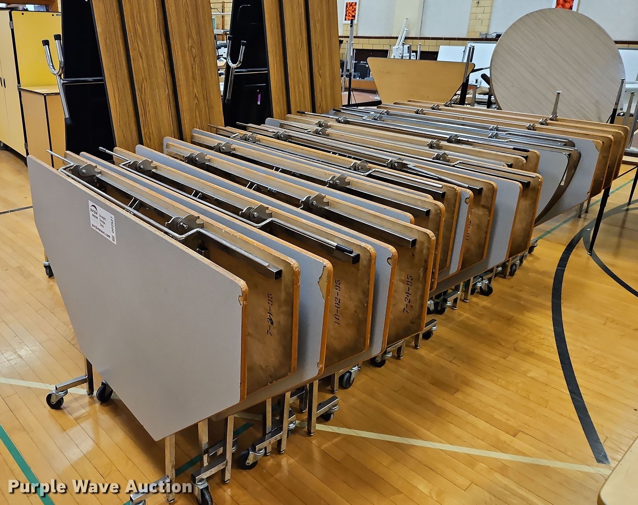Purple Wave is selling a used Furniture in Kansas. This item is a Tables with the following: (14) octagon folding tables, (2) rectangle folding tables with benches
