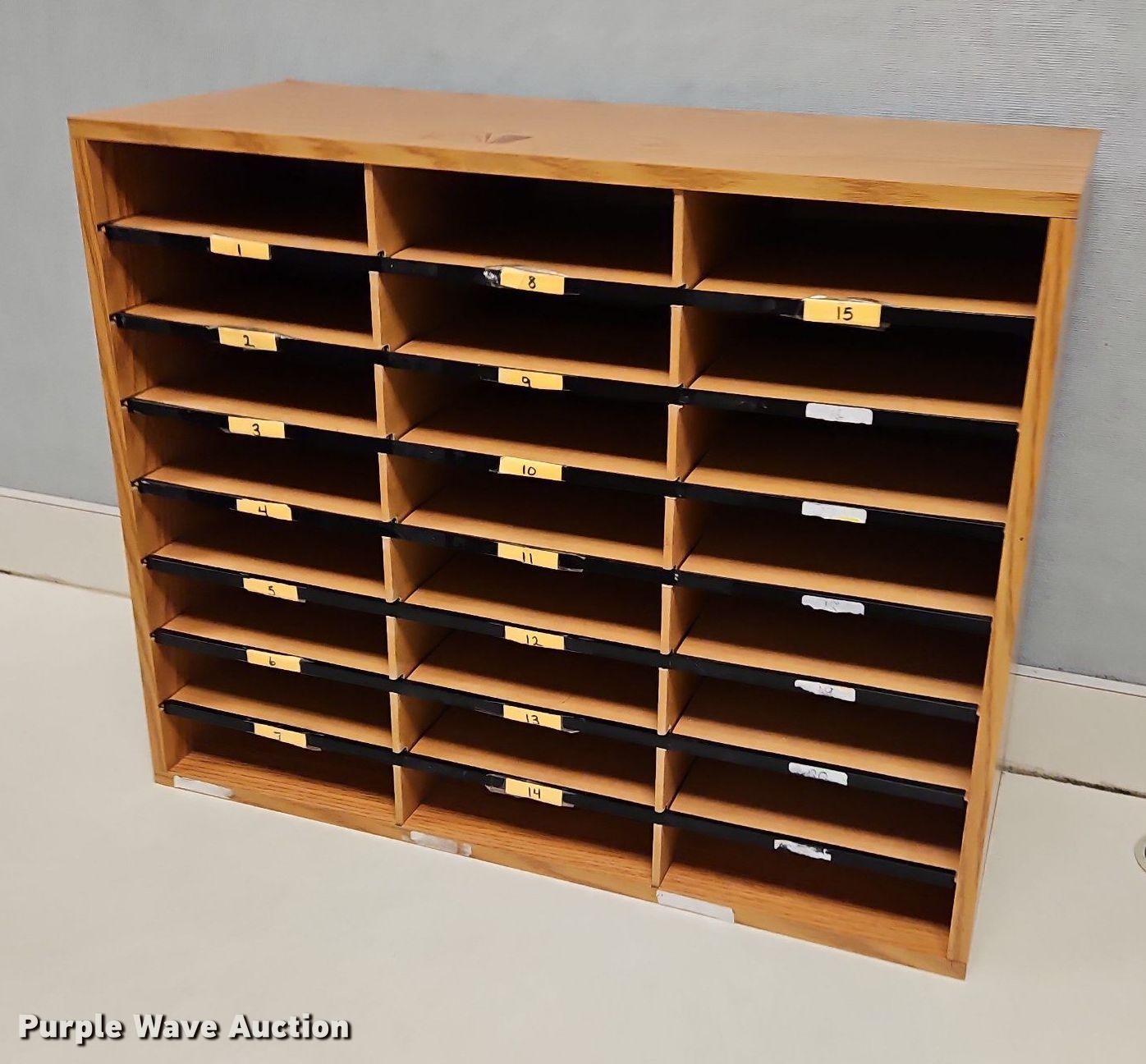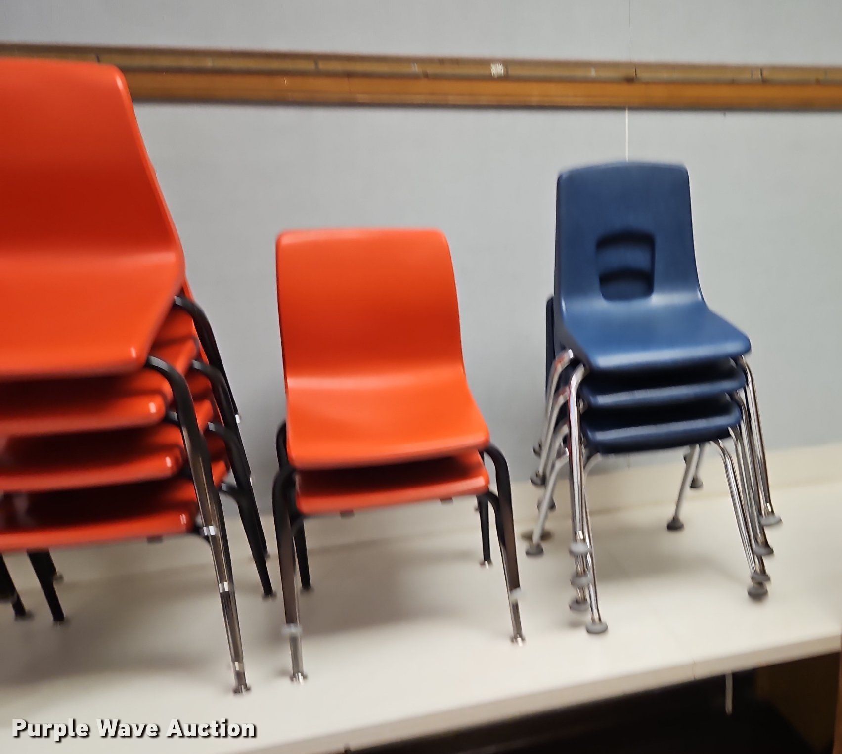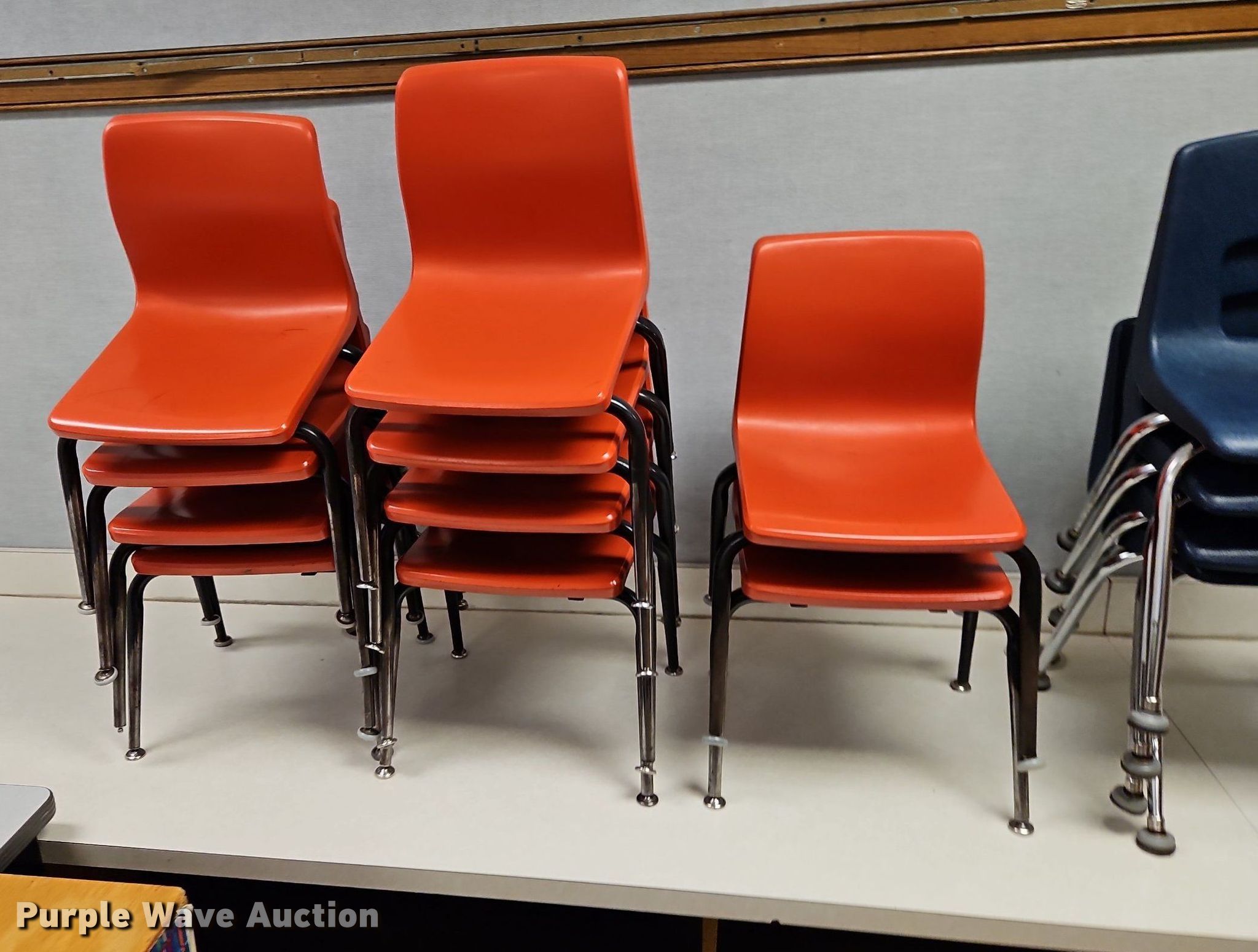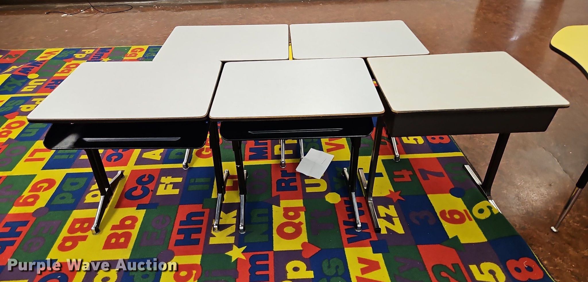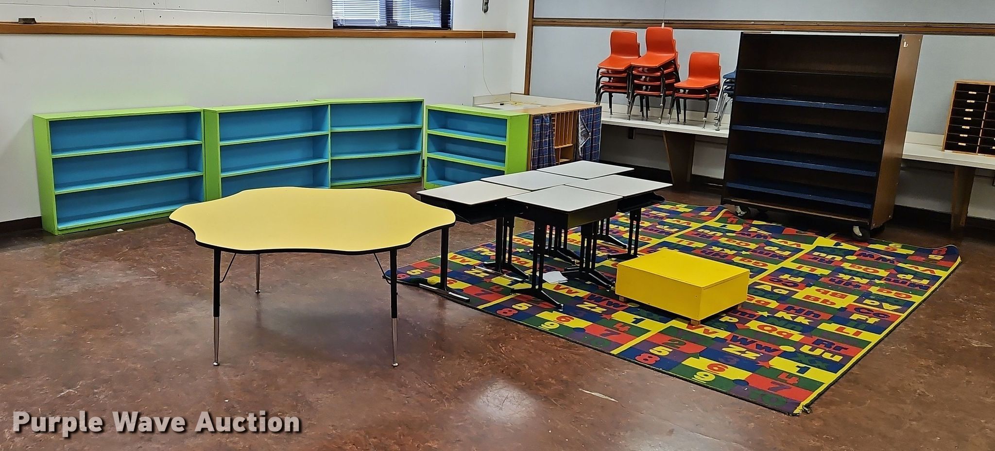 Purple Wave is selling a used Furniture in Kansas. This item is a Furniture with the following: (5) student desks, (14) student chairs, (6) shelves, (2) four drawer metal filling cabinet, Cart, Desk and more