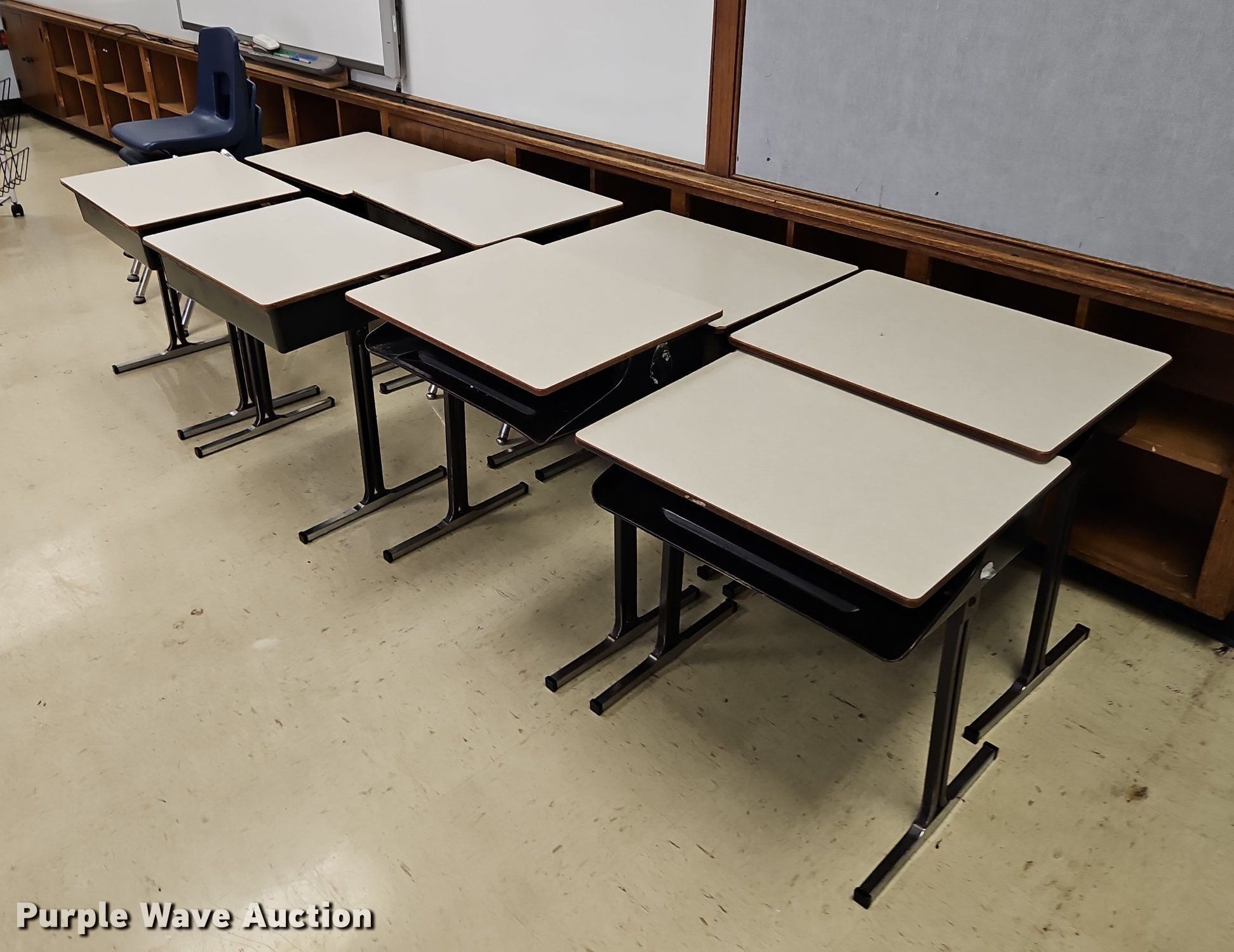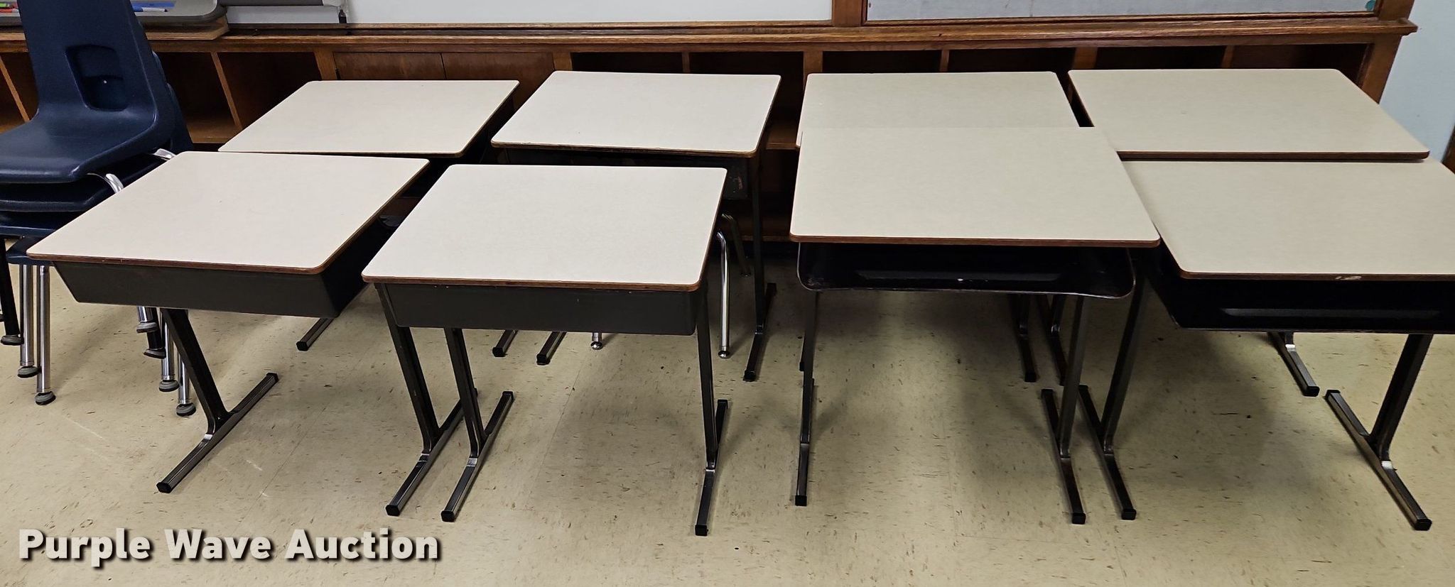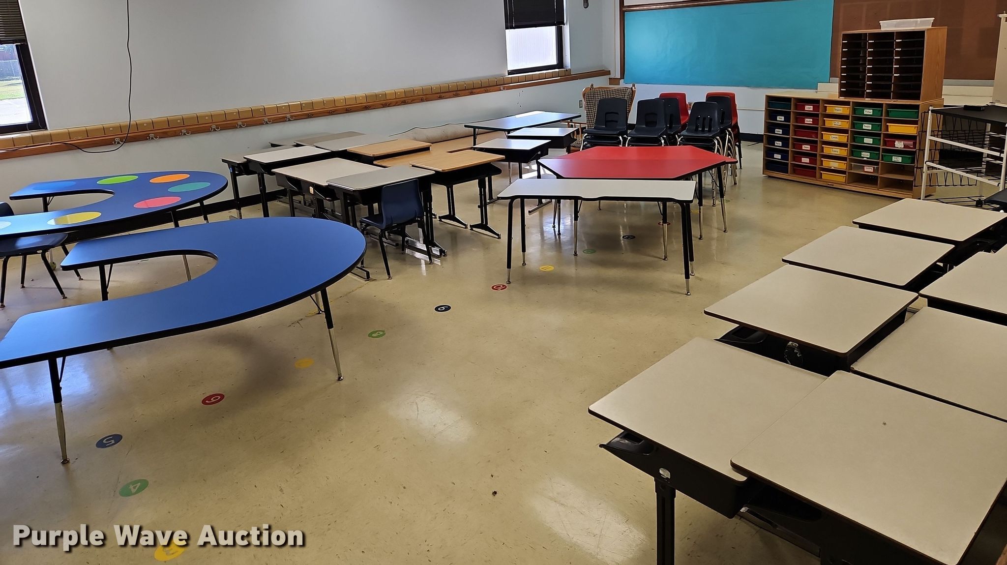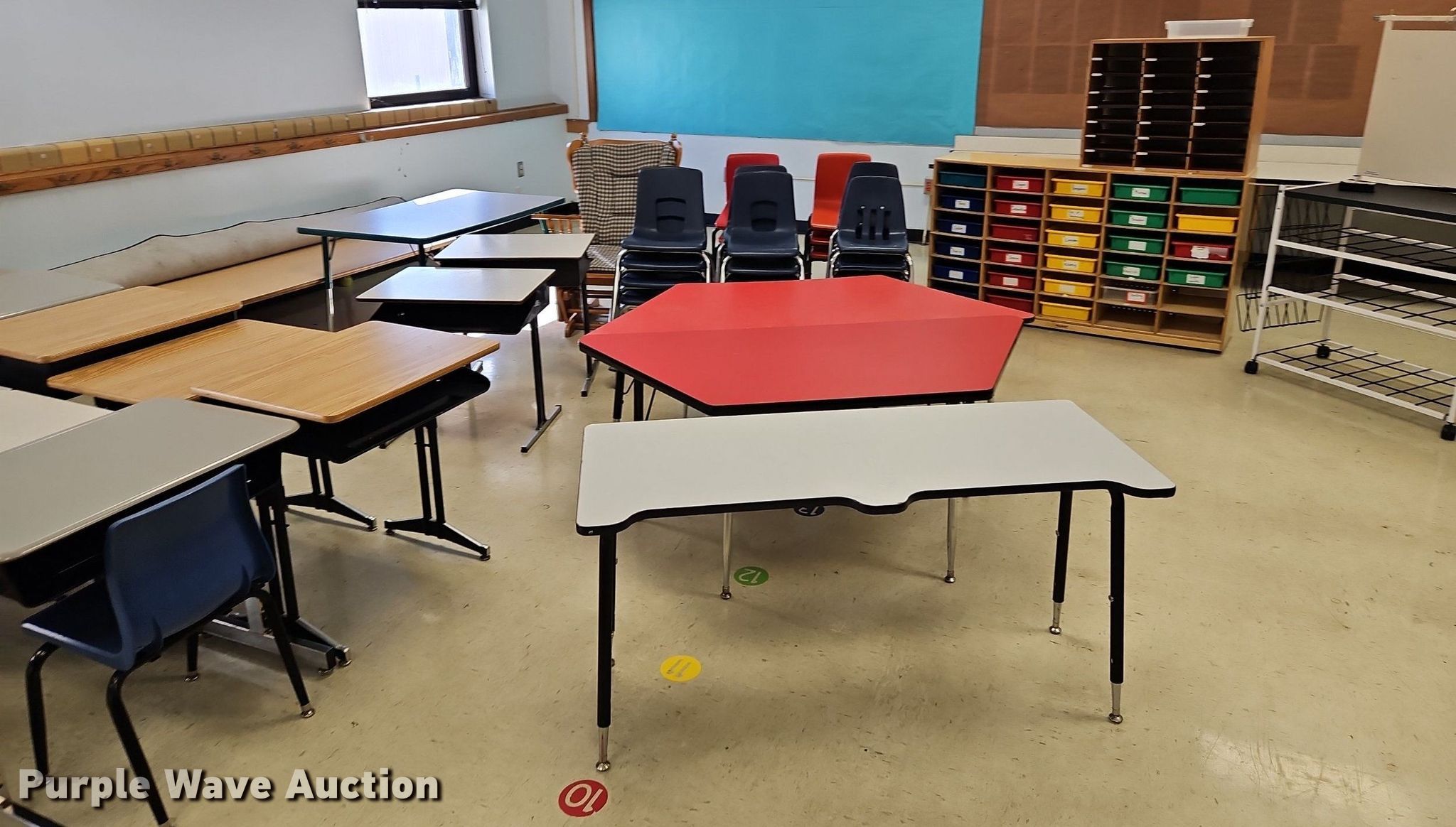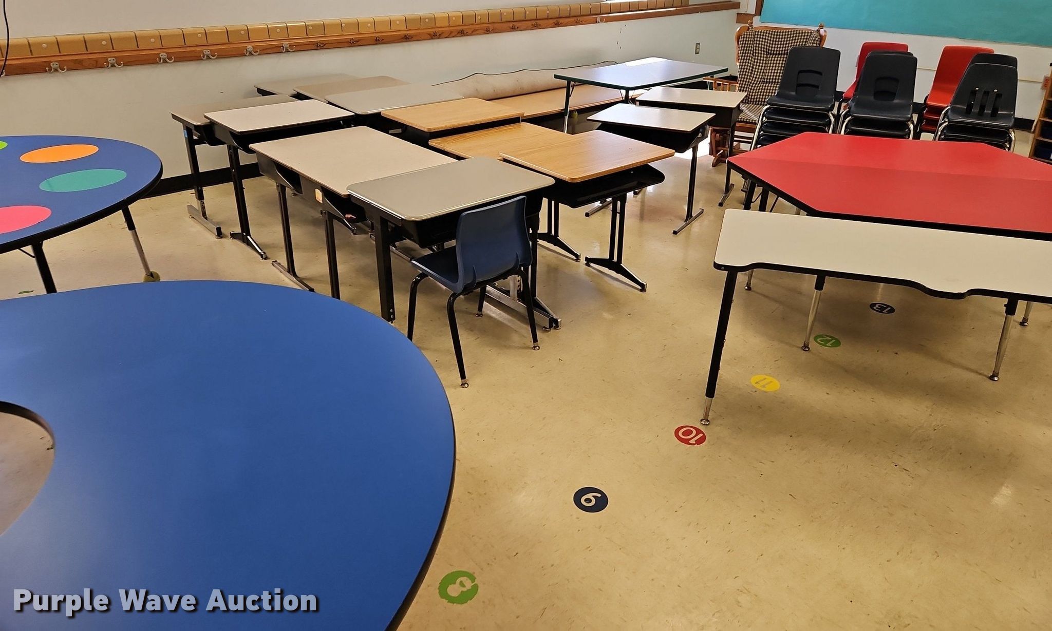 Purple Wave is selling a used Furniture in Kansas. This item is a Furniture with the following: (34) chairs, (21) student desks, (7) tables, (2) carts, Rocking chair