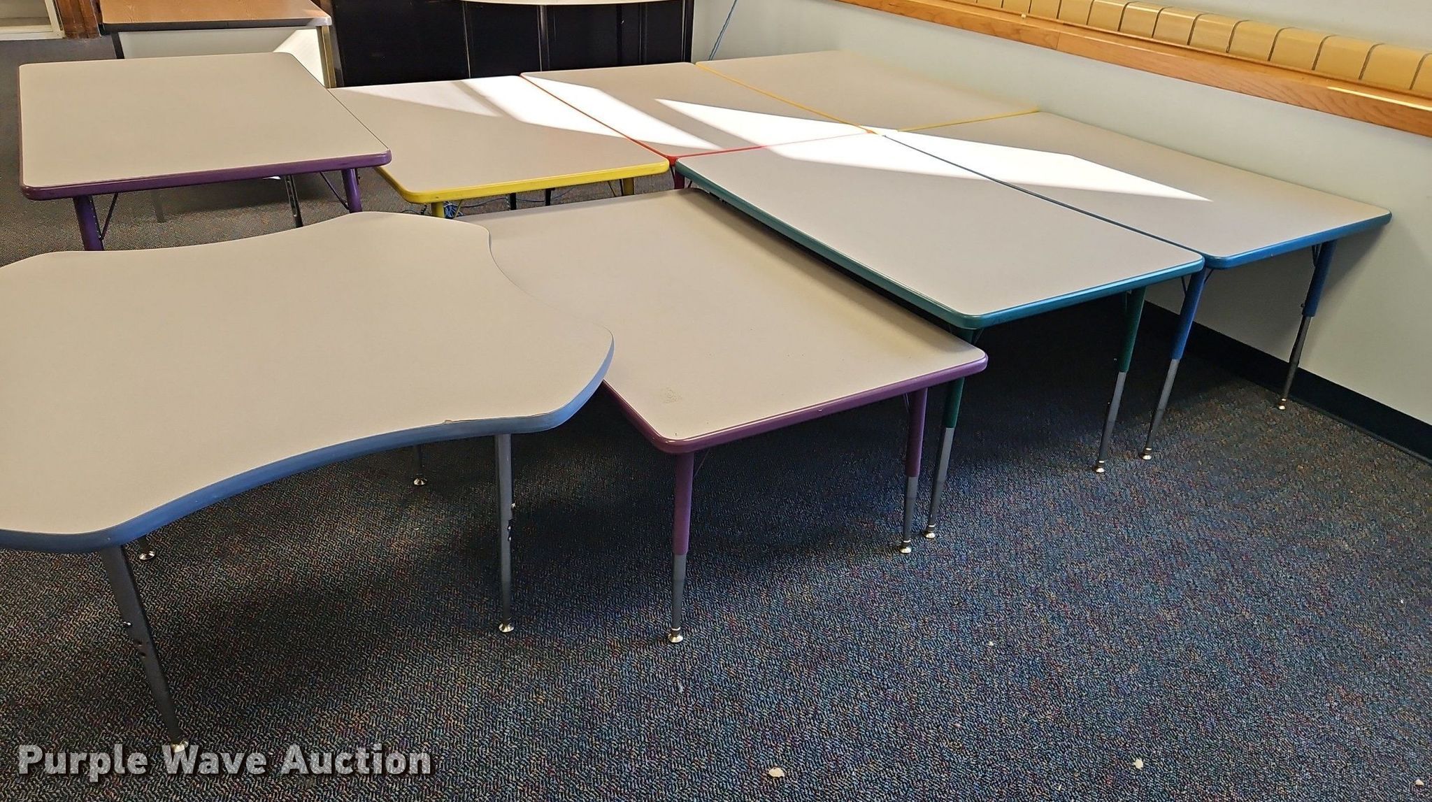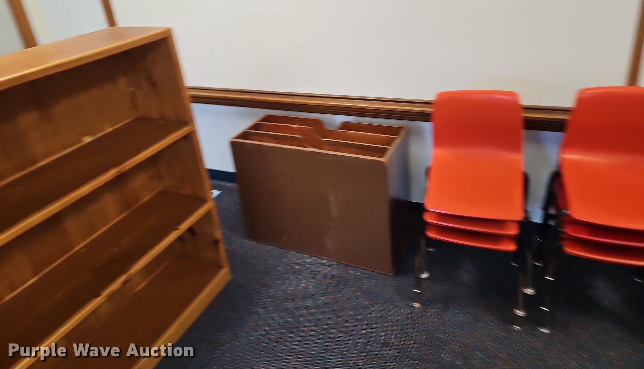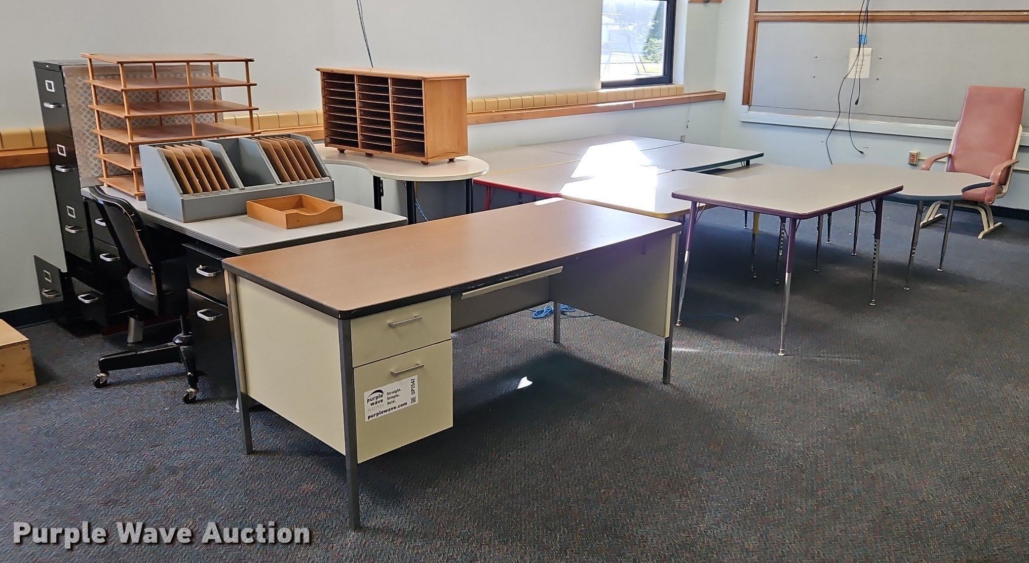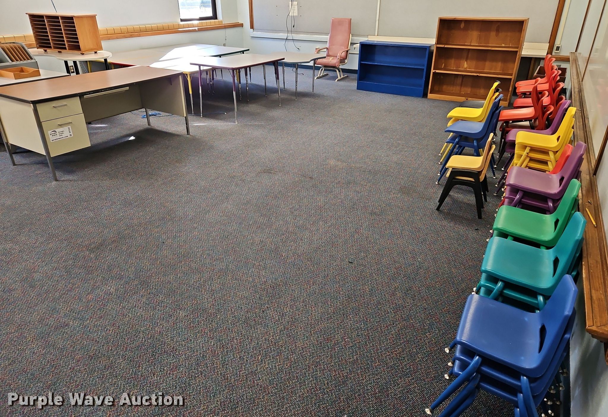 Purple Wave is selling a used Furniture in Kansas. This item is a Furniture with the following: (9) tables, (47) chairs, (2) desks, (3) shelves, Metal file cabinet and more