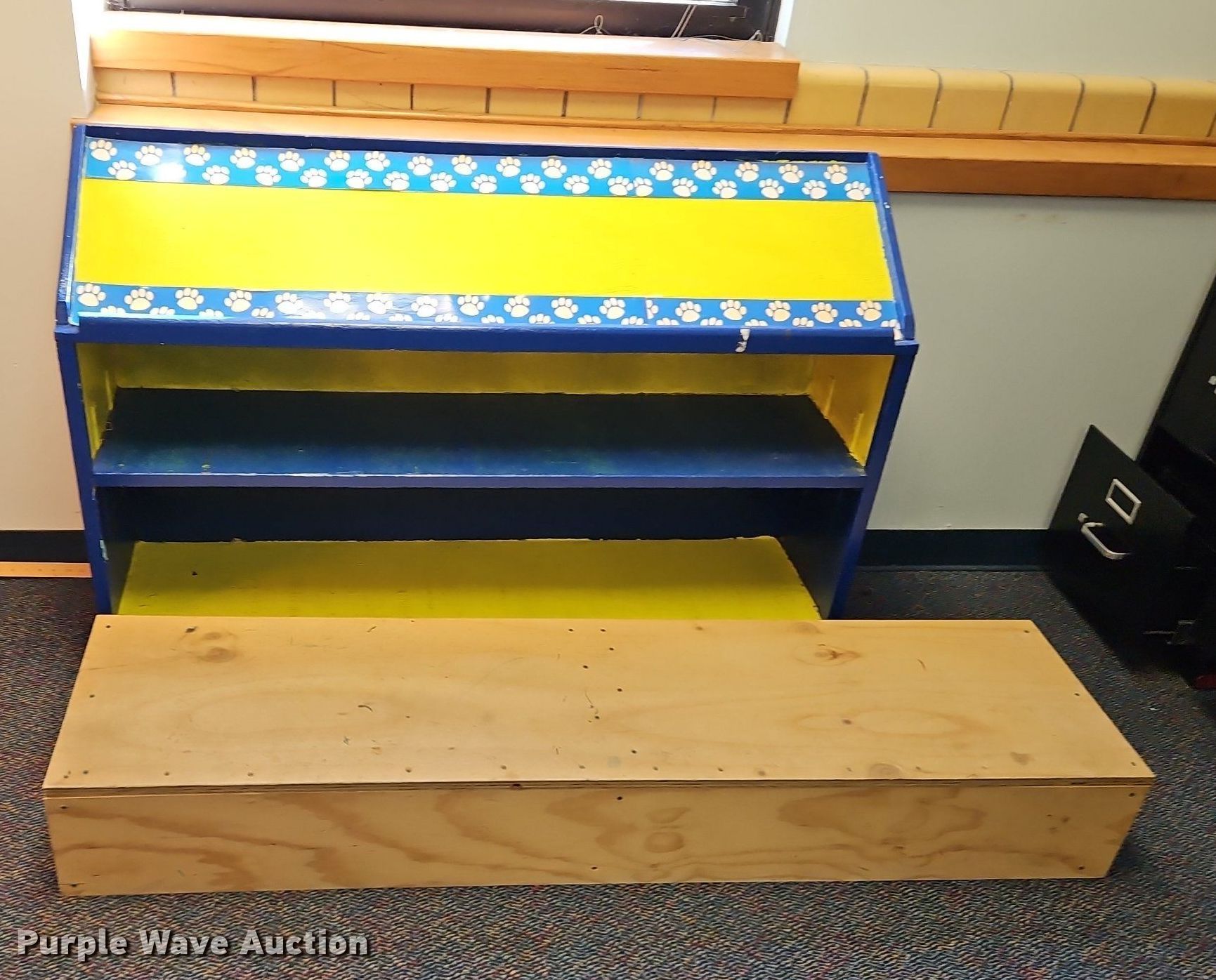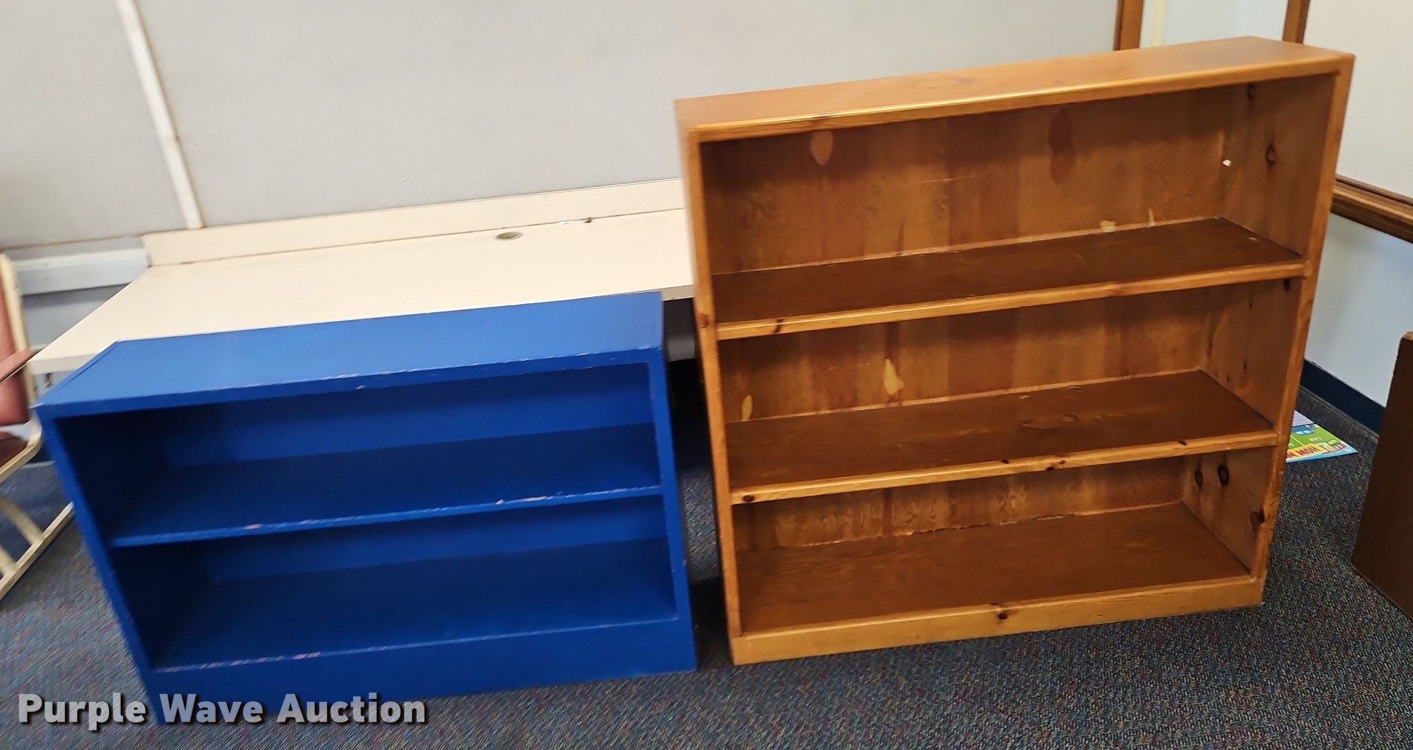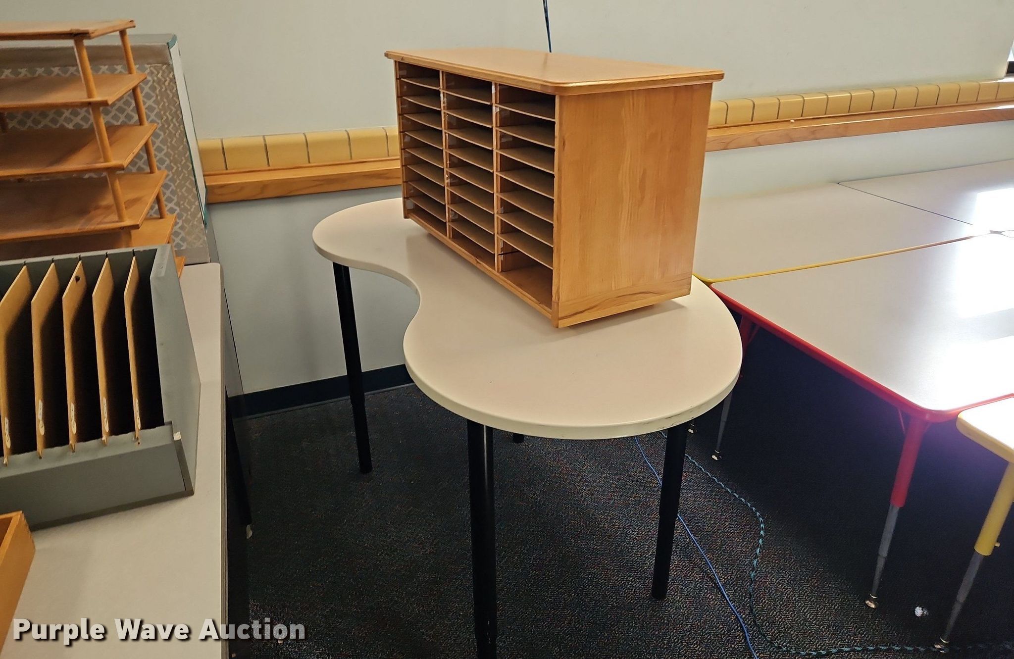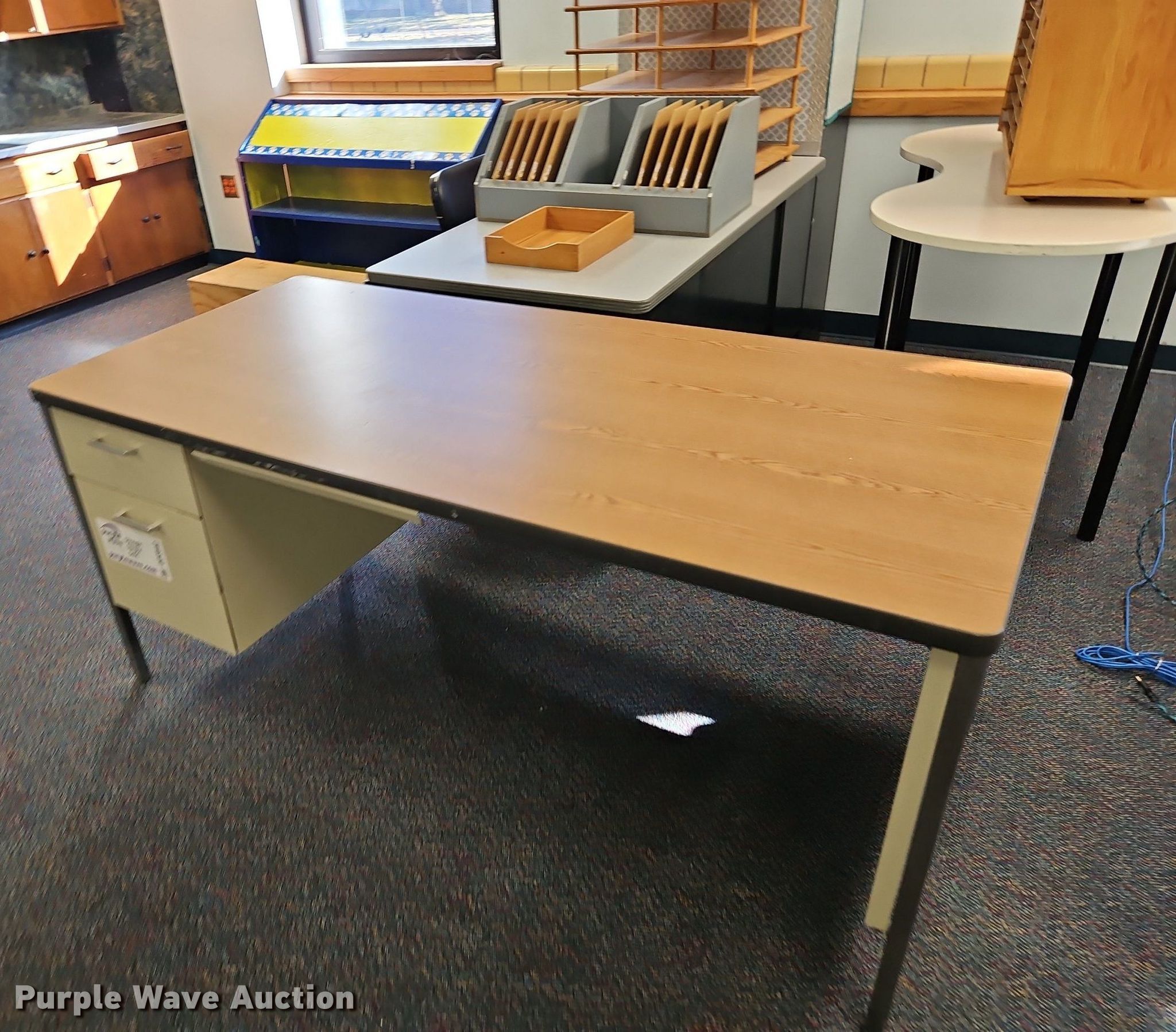 Purple Wave is selling a used Furniture in Kansas. This item is a Furniture with the following: (9) tables, (47) chairs, (2) desks, (3) shelves, Metal file cabinet and more