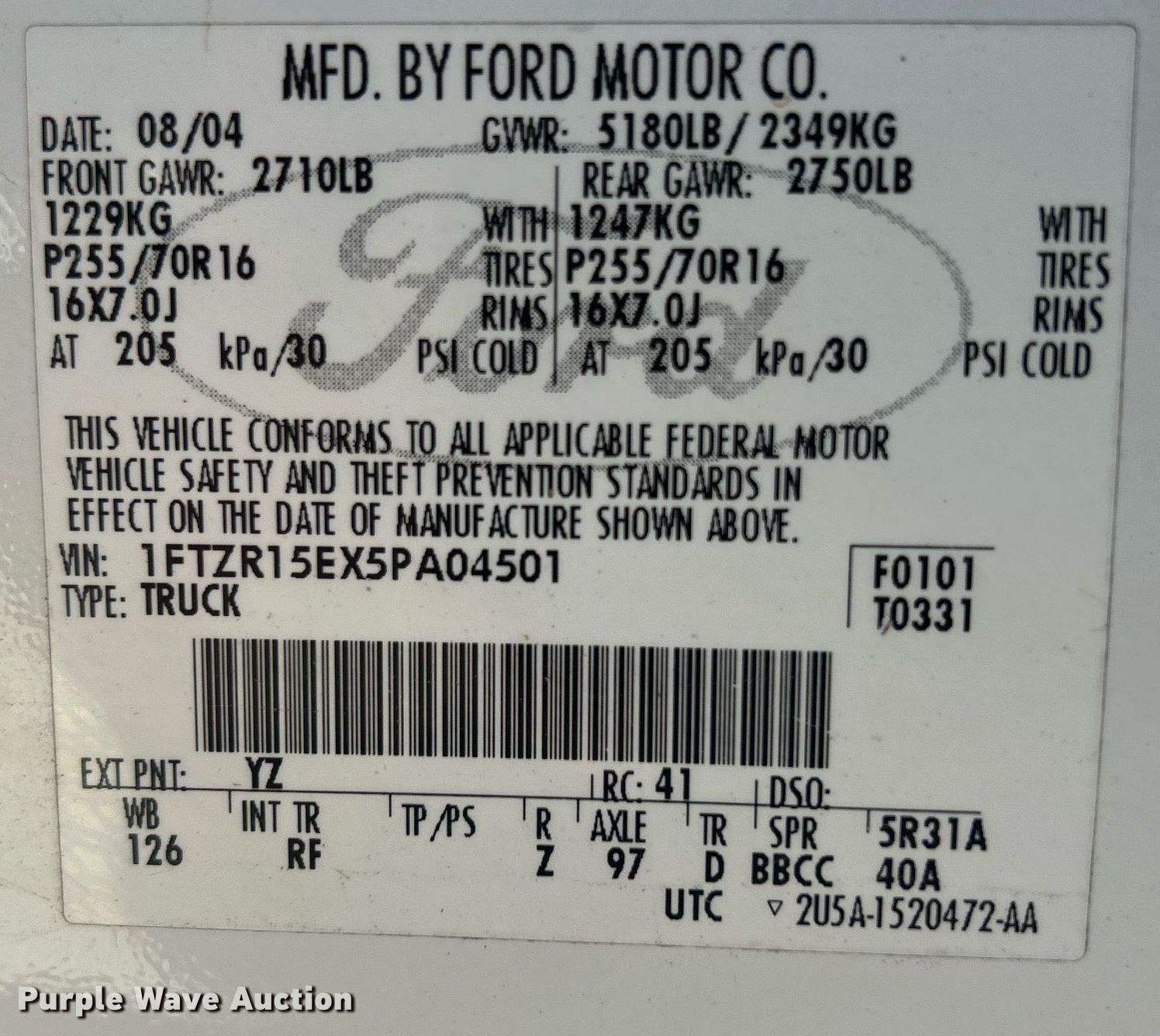 2005 Ford Ranger XLT SuperCab pickup truck. Miles: 110,681 on odometer, VIN: 1FTZR15EX5PA04501. Engine Displacement: 4.0L V6 SOHC, Cylinders: 6, Fuel type: Gas. Transmission Automatic, Four wheel drive. Interior AC, Heat. Tires Size: 255/70R16. Notes Contents not included , Dead battery. Iowa title. Title distribution may be delayed up to 14 days from verification of funds. City of Waterloo, Iowa. 625 Glenwood St. Waterloo, IA 50703