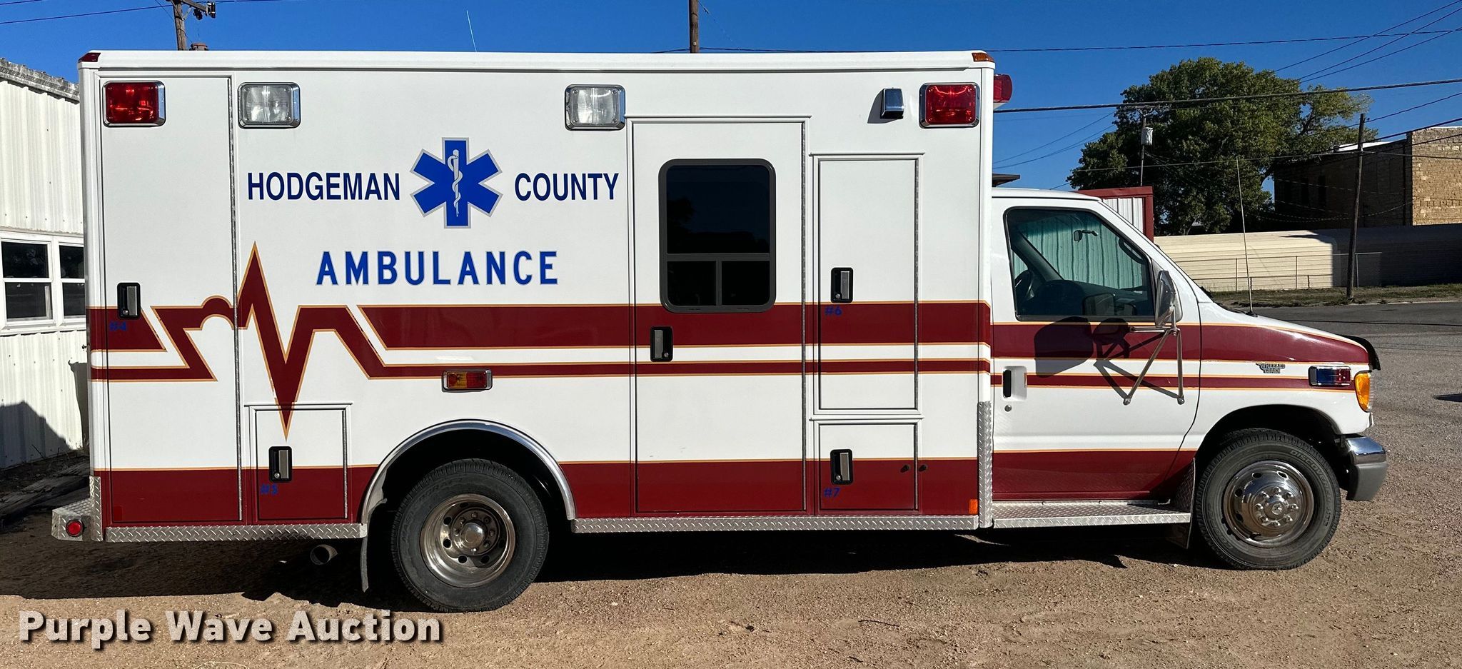 2001 Ford E450 Super Duty ambulance. Miles: 84,780 on odometer, VIN: 1FDXE45F41HA50659. Engine Displacement: 7.3L, Cylinders: 8, Fuel type: Diesel. Transmission Automatic. Chassis Axles: Single, Suspension: Spring, Brakes: Hydraulic, GVWR: 14,050 lbs. Interior AC, Heat, Power windows, Power locks, Cruise control. Features Ambulance body Wheeled Coach, PA/ siren controls, Oxygen hookups. Tires Size: 225/75R16. Notes Dead battery. Kansas title. Hodgeman County. 504 Roughton Street. Jetmore, KS 67854