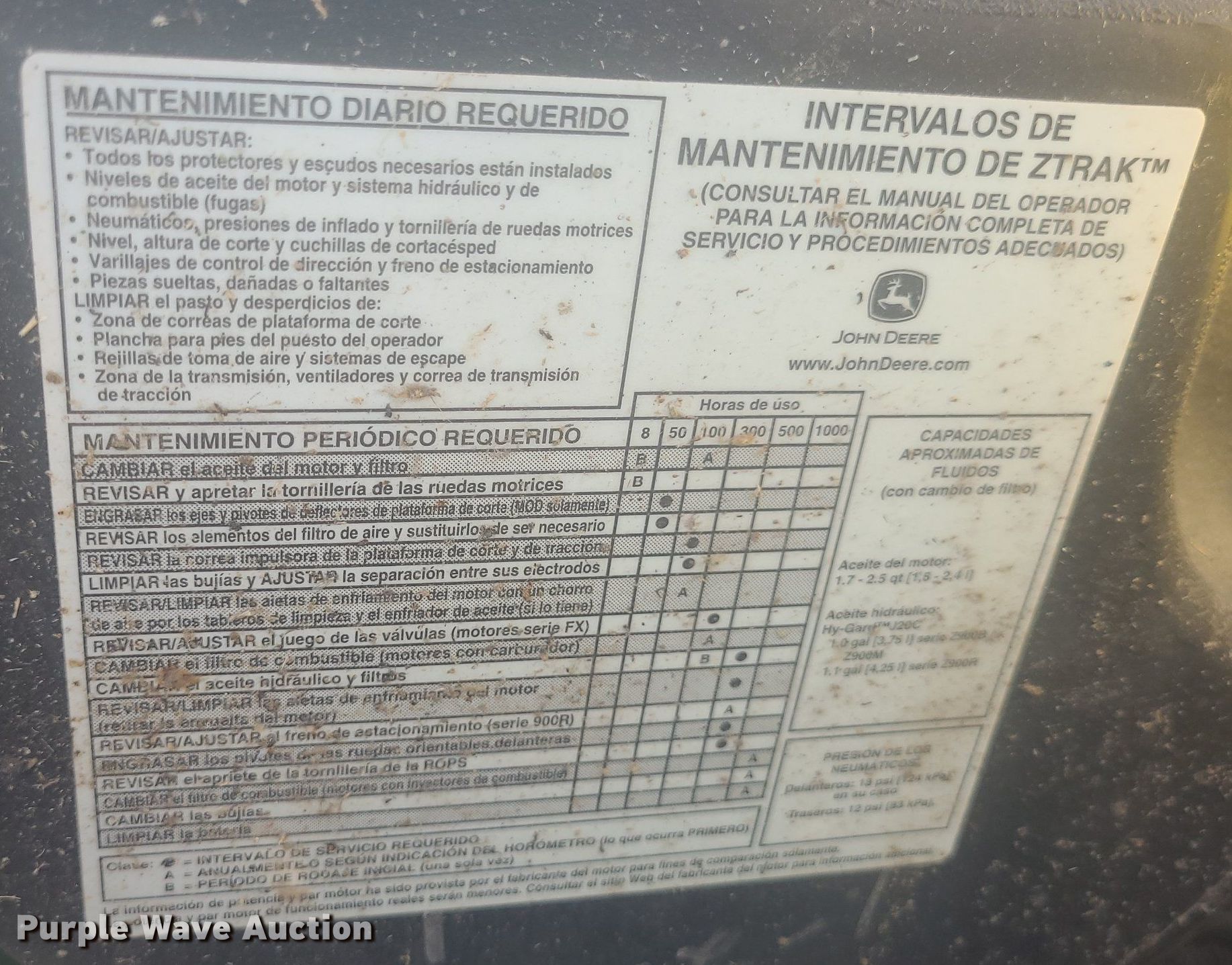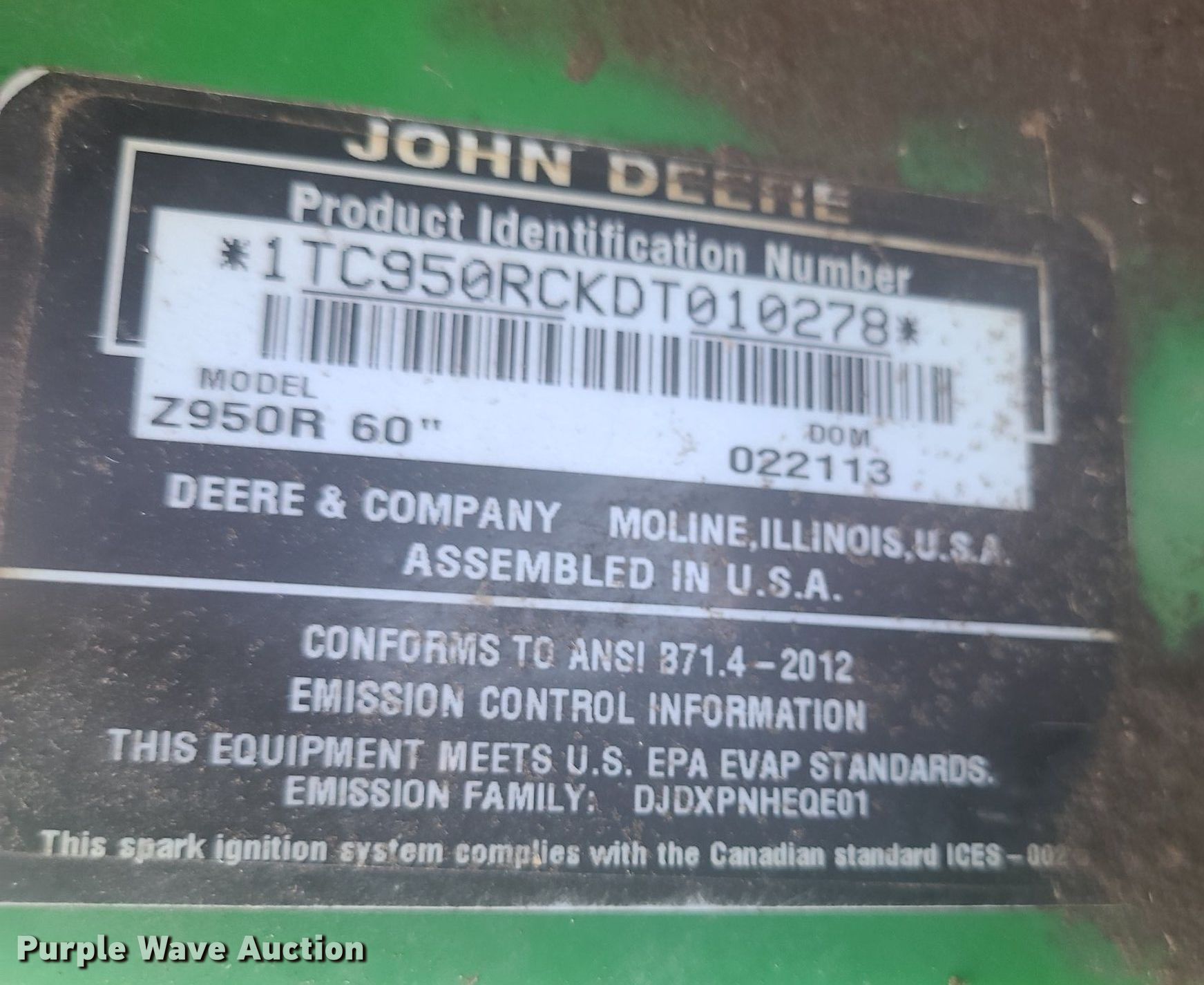 Purple Wave is selling a used Commercial Turf Mower in Kansas. This item is a 2013 John Deere Z950R ZTR lawn mower with the following: Hours: 1,256 on meter, Cutting width: 60", Serial: 1TC950RCKDT010278
