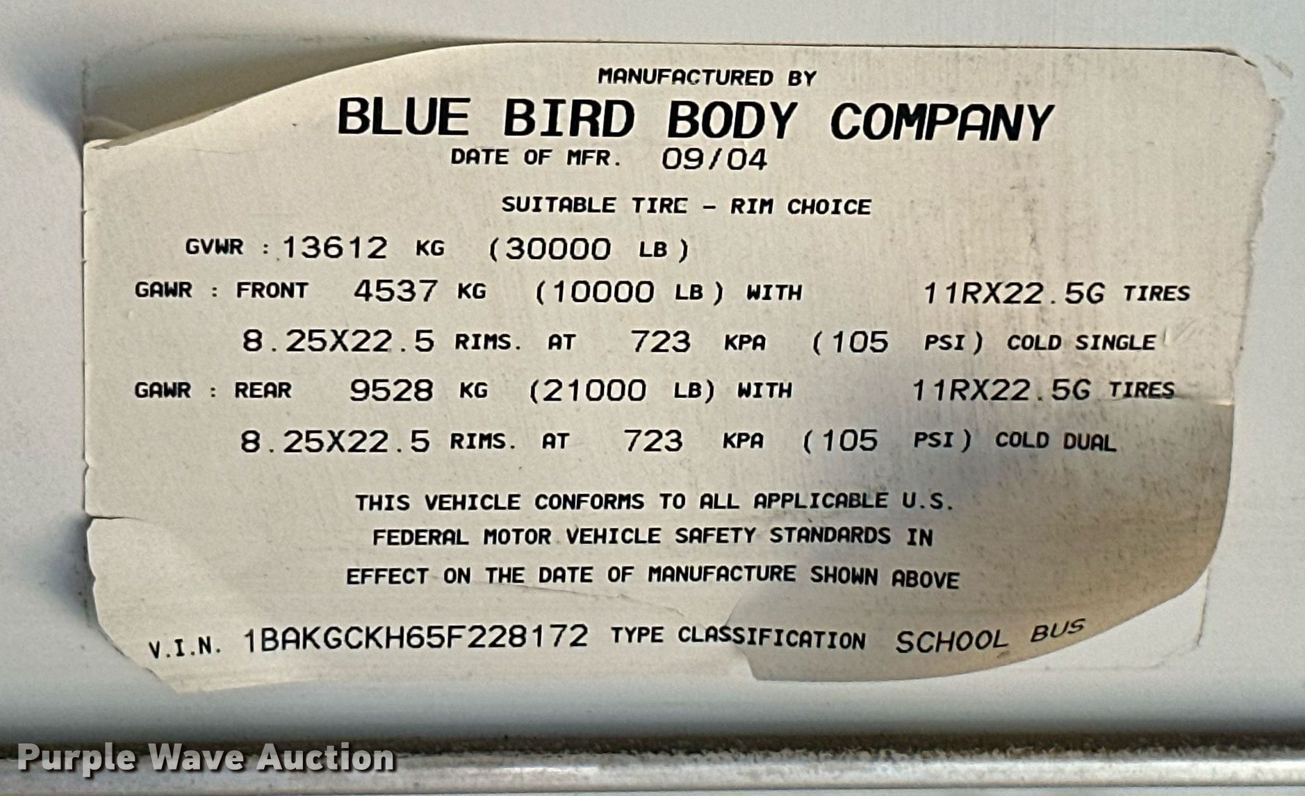 Purple Wave is selling a used Bus in Oklahoma. This item is a 2005 Blue Bird Vision school bus with the following: Miles: 134,490 on odometer, VIN: 1BAKGCKH65F228172, Unit #: 4
