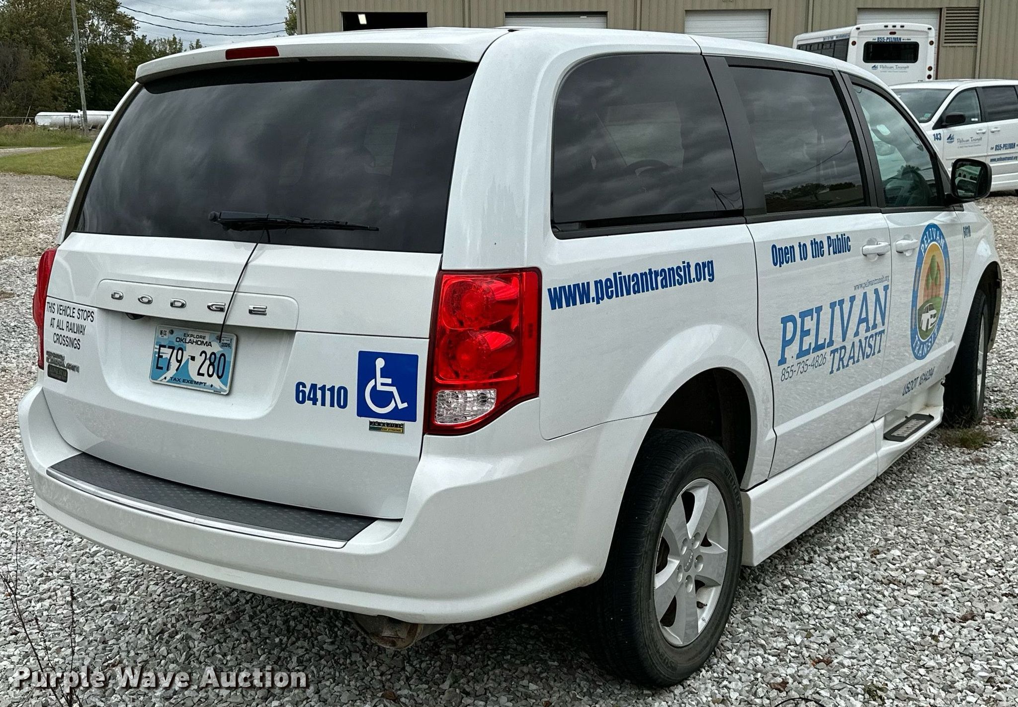 2018 Dodge Grand Caravan. Wheelchair ramp. ^ handicap accessible van Miles: 110,189 on odometer, VIN: 2C4RDGBG8JR364110. Engine Displacement: 3.6L V6 DOHC, Cylinders: 6, Fuel type: Gas. Transmission Automatic. Interior AC, Heat, Seat: Power driver, Heated mirrors, Power windows, power locks, Cruise control. Features Wheelchair ramp. Tires Size: 225/65R17. Notes No battery, Unknown operating condition. Oklahoma title. Grand Gateway Economic Dev. Assc. DBA Pelivan Transit. Big Cabin, OK 74332