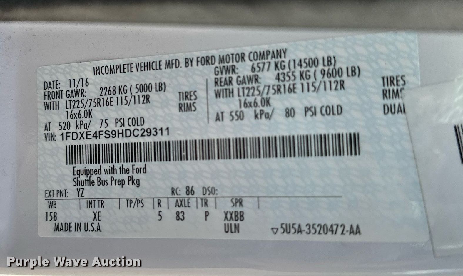 2017 Ford E450 shuttle bus. Miles: 119,857 on odometer, VIN: 1FDXE4FS9HDC29311. Engine Ford, Displacement: 6.8L, Cylinders: 10, Fuel type: Gas. Transmission Automatic. Chassis Axles: Single, Suspension: Spring, Brakes: Hydraulic, GVWR: 14,500 lbs, Wheelbase: 158". Interior AC, Heat, Electric passenger sliding door, Passengers: 14, Child safety seats: 5, Adult seats: 14, Wheelchair lift. Tires Size: 225/75R16. Notes Dash warning indicator: Check engine, Dead battery, Unknown operating condition of wheelchair ramp , Non-operational backup camera. Oklahoma title. Title distribution may be delayed up to 14 days from verification of funds. United Community Action Program Inc.. 501 6th Street. Pawnee, OK 74058