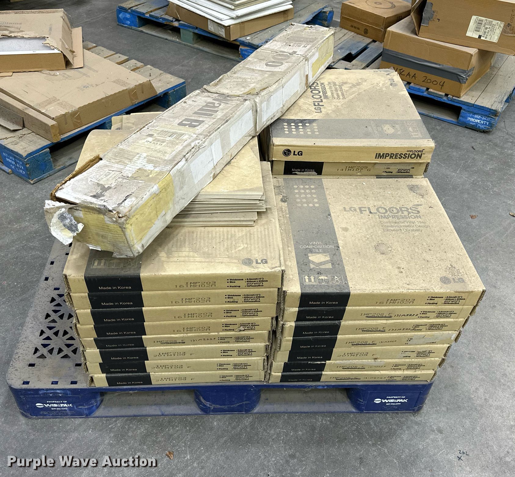 Purple Wave is selling a used Building Materials in Kansas. This item is a Vinyl flooring with the following: (30) boxes of LG vinyl flooring, Thickness: .12", Size: 17.7" x 17.7", (16) pieces per box, Some boxes missing pieces, (14) pieces of light brown rubber flooring, 48" x 6"