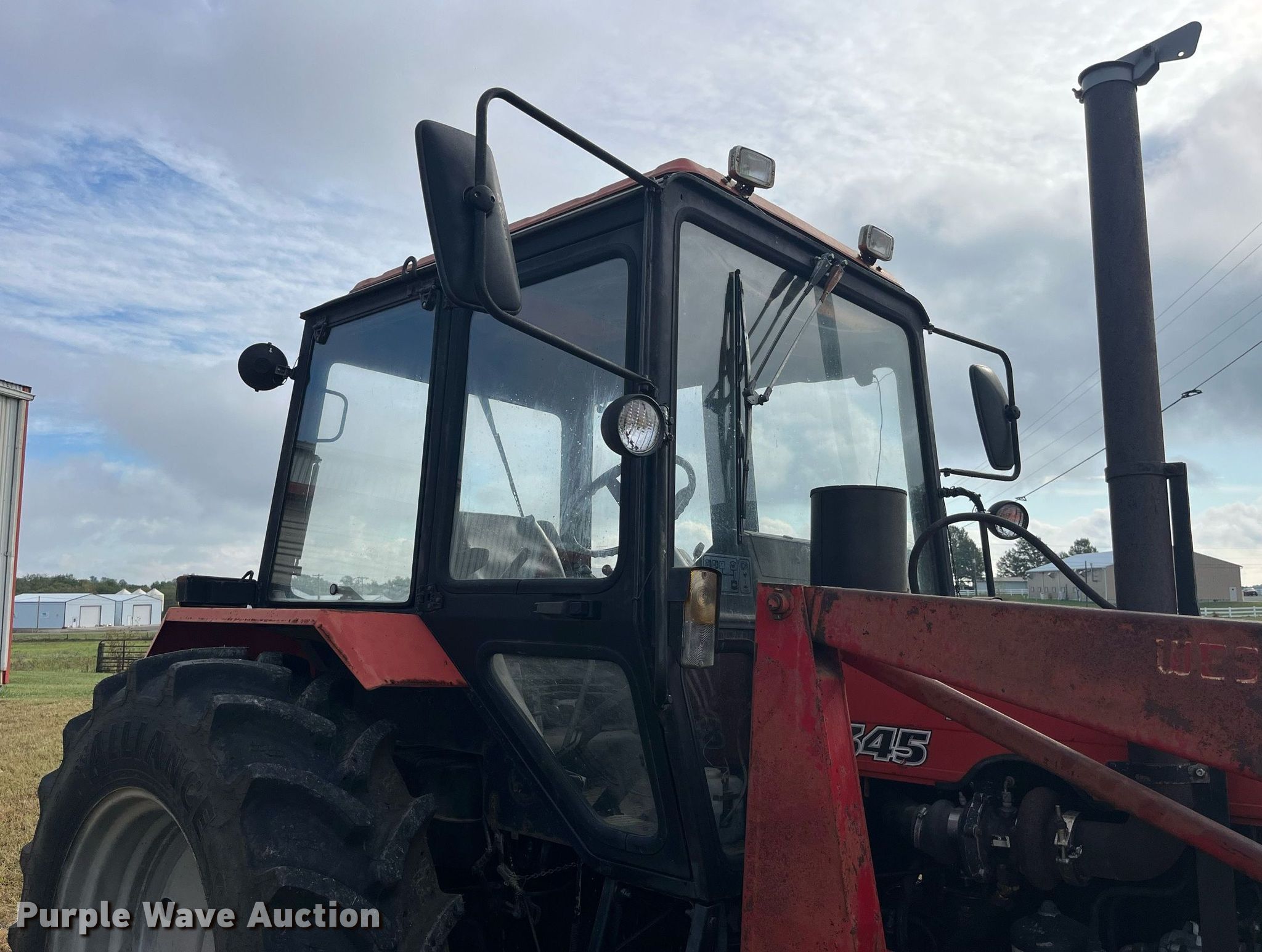 Belarus 8345 MFWD tractor. Hours: 2,103 on meter, Serial: 001596. Engine Serial: 322994, Cylinders: 4, Fuel type: Diesel. Transmission Manual, 14F - 4R. Operators station AC, Heat. Features PTO: 540, Three point Top link, Hydraulic remote sets Rear: 2, Loader Westondorf, Controls: Two-lever, Bucket Width: 85".. Tires Front tires: 320/85R20, 12.4R20, Rear tires: 420/85R38, 16.9R38. Notes Non-operational AC, Loader hydraulic leak. 4554 Berlin Road. King City, MO 64463