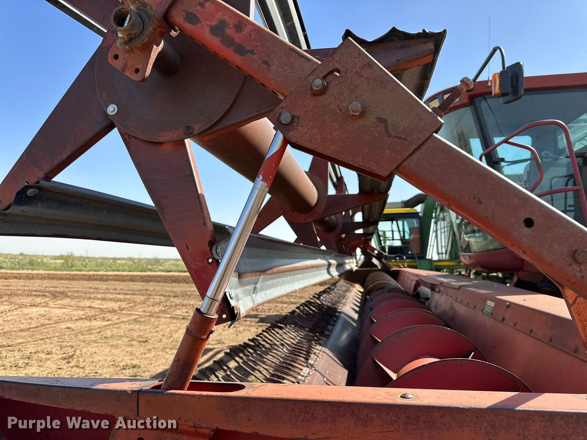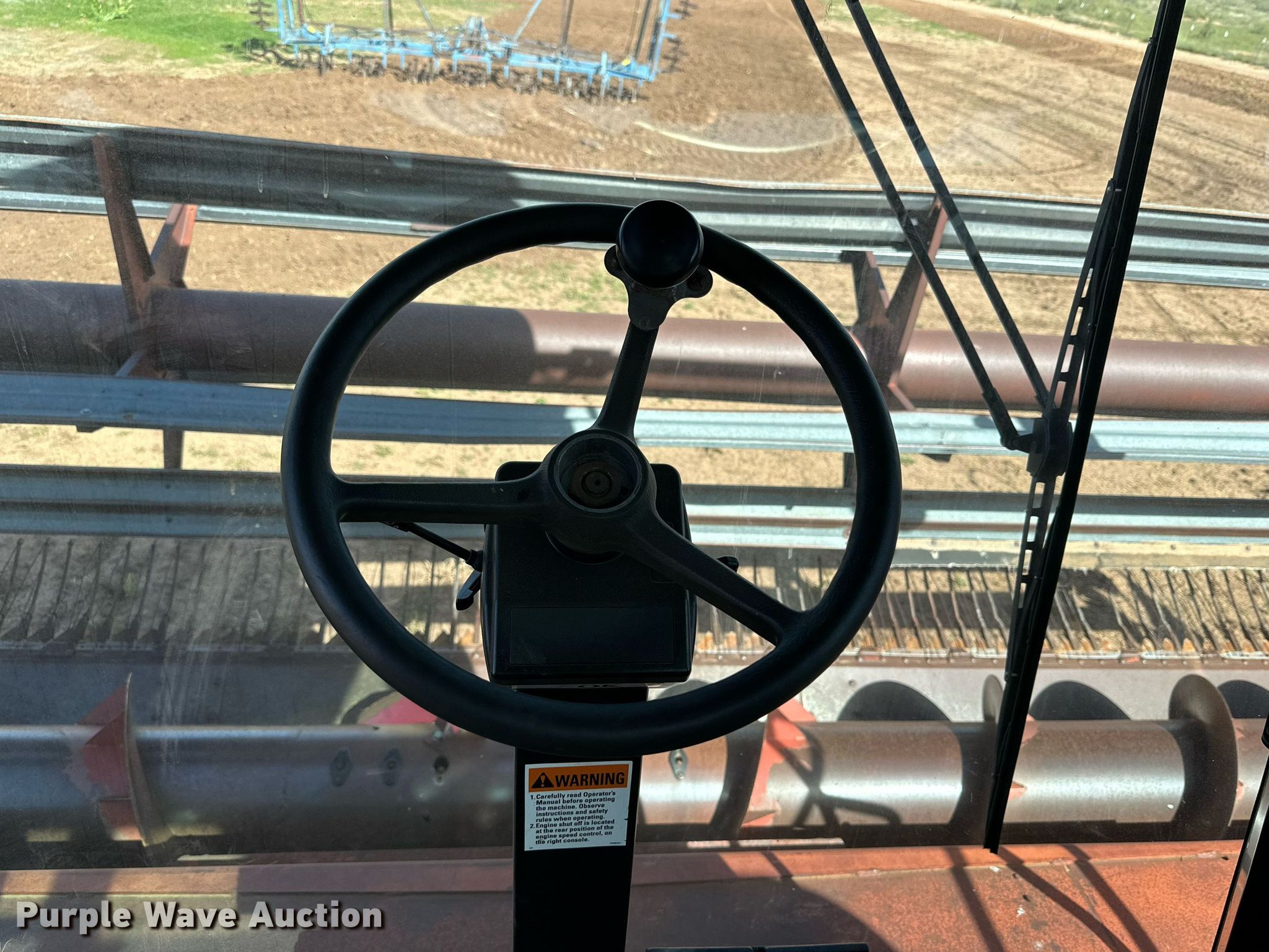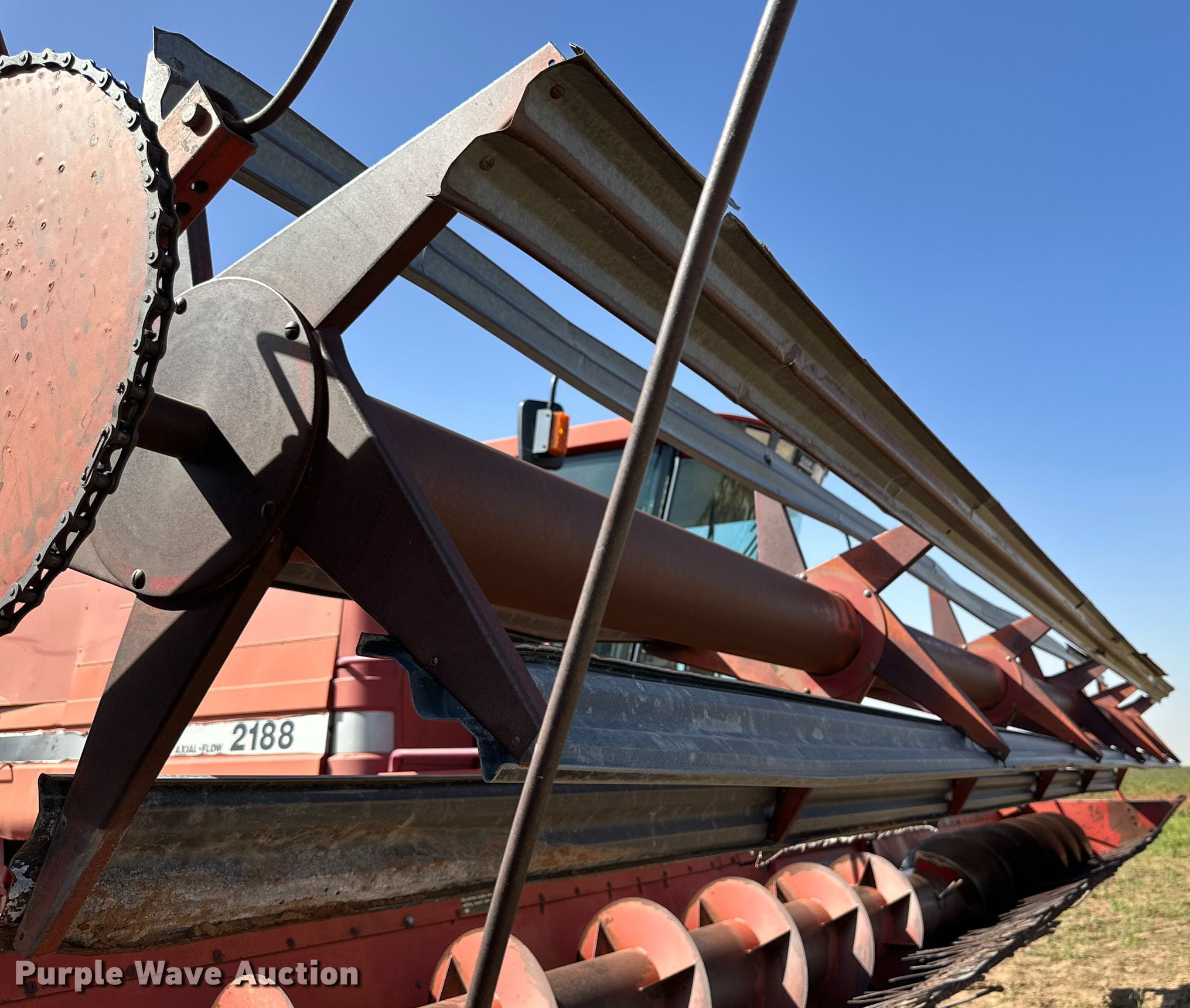 1997 Case IH 2188 combine. Engine hours: 5,807 on meter, Separator hours: 4,379 on meter, Serial: JJC0196671. Engine Cylinders: 6, Fuel type: Diesel. Transmission Hydrostatic. Interior AC, Heat. Features Feederhouse: Reverser, Chaff spreader, Unloading auger length: 17', Header International 810, Platform head Draper, Width: 30', Reel: Bat Hydraulic reel height control, Skid plates: Steel, Single point coupler, Drivelines: Dual. Tires Front: 30.5-32, Rear: 14.9-24. Notes Dead battery. 11209 Farm to Market Road 2641. Shallowater, TX 79363