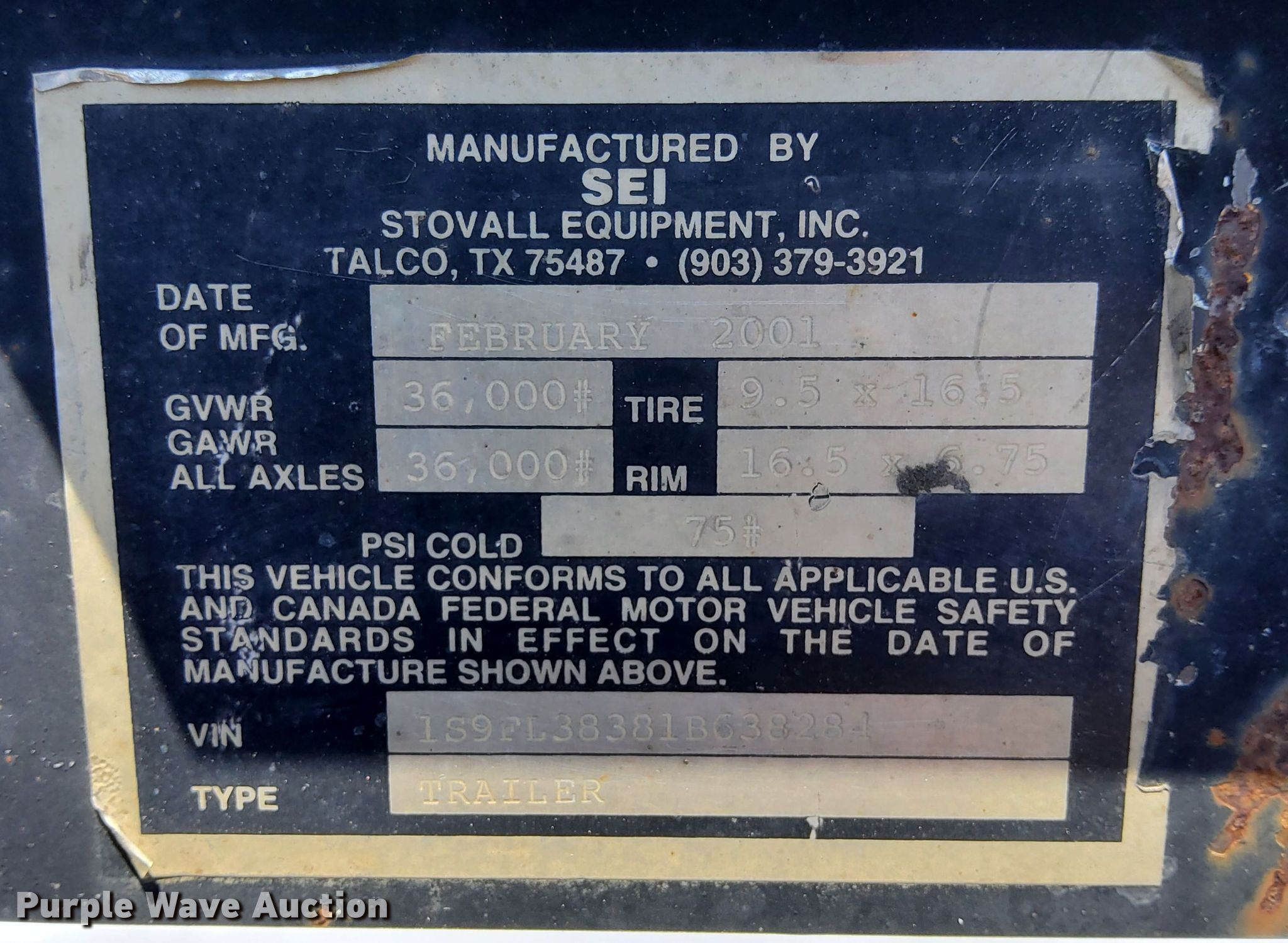 2001 SEI equipment trailer. VIN: 1S9FL38381B638284. Dimensions Overall: 36' L x 100" W, Deck: 23' L x 100" W, Tail length: 5', Ramps: Manual Length: 80". Features Deck type: Steel. Chassis Landing gear: Single, Suspension: Spring, Brakes: Air, Axles: Triple, GVWR: 36,000 lbs. Tires Steel wheels, Size: 235/85R16. Notes Truck not included. Colorado title. Title distribution may be delayed up to 30 days from verification of funds. Loveland, CO 80537
