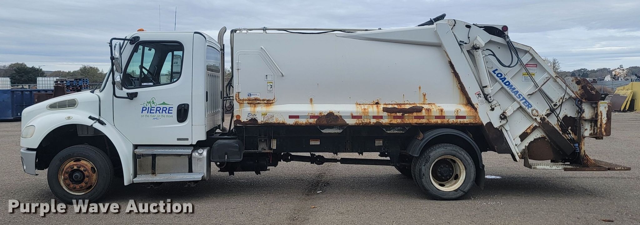 2010 Freightliner M2 106 refuse truck. Miles: 116,608 on odometer, Hours: 12,364 on meter, VIN: 1FVACXDT6ADAR1253. Engine Cummins, Displacement: 6.7L, Cylinders: 6, Fuel type: Diesel. Transmission Automatic. Chassis Axles: Single, Suspension: Spring, Brakes: Air, PTO. Interior AC, Heat. Features Refuse bed Loadmaster Elite, Load: Rear, Cart tipper, Winch. Tires Size: 245/70R19.5. Notes Dash warning indicator: ABS, Windshield chipped or cracked. South Dakota title. Title distribution may be delayed up to 14 days from verification of funds. City of Pierre. 1700 East Dakota Avenue. Pierre, SD 57501