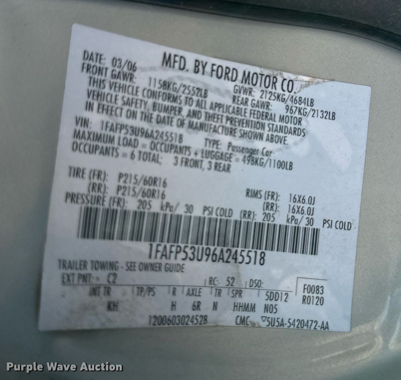 Purple Wave is selling a used Passenger Vehicle in Oklahoma. This item is a 2006 Ford Taurus with the following: Miles: 94,315 on odometer, VIN: 1FAFP53U96A245518, Unit #: 9902