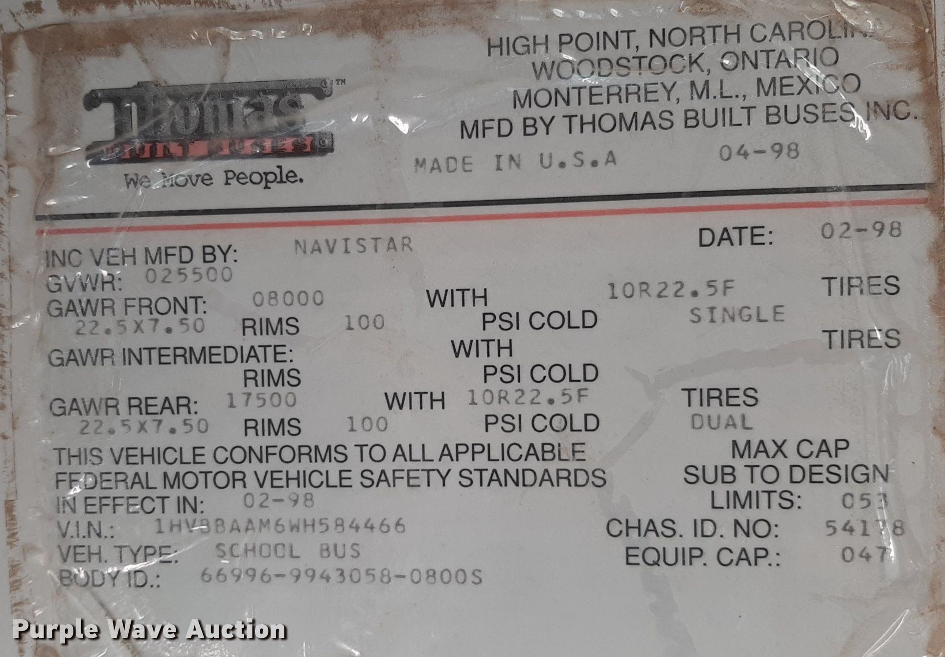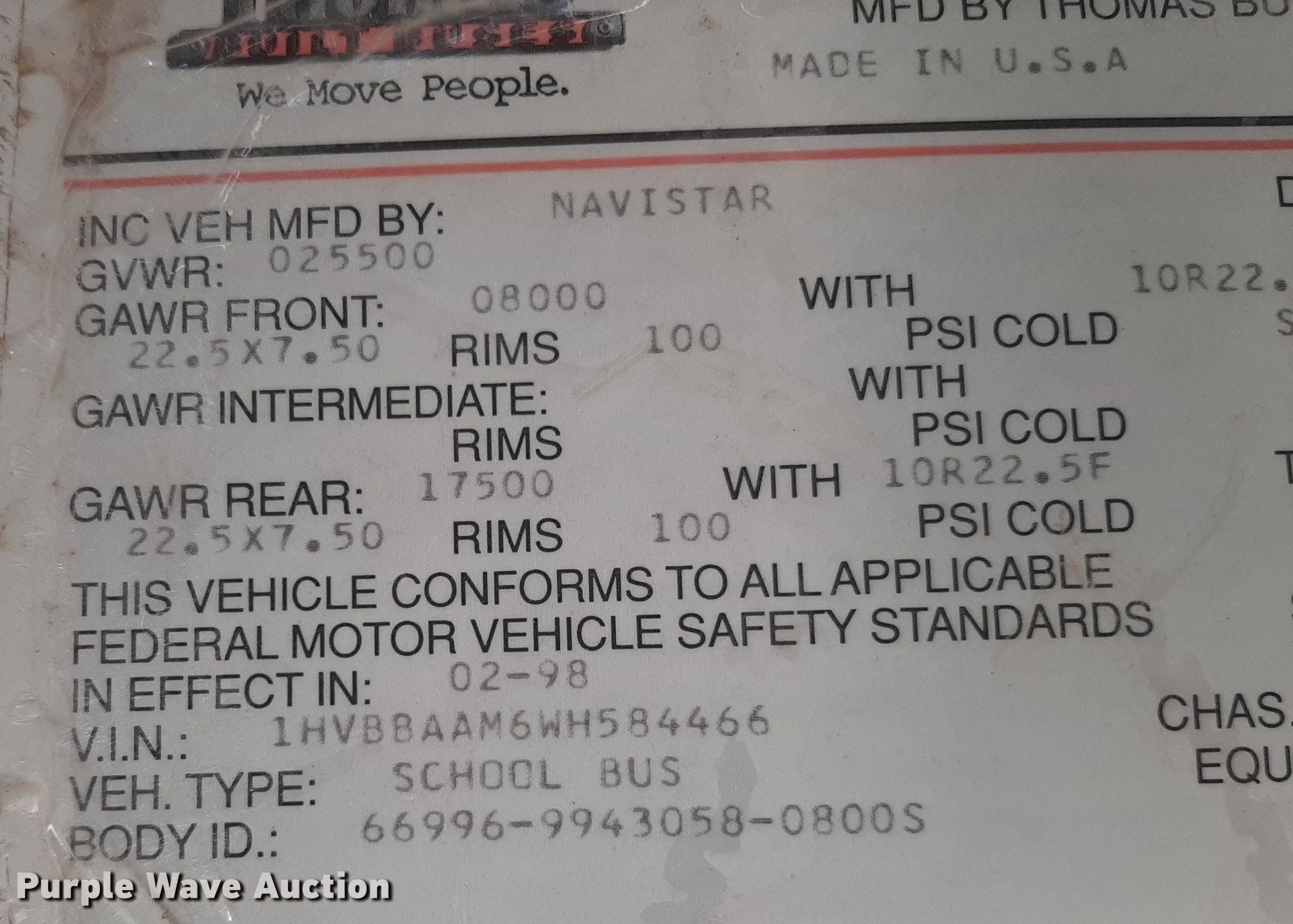 Purple Wave is selling a used Bus in Kansas. This item is a 1998 International school bus with the following: Miles: 147,521 on odometer, Hours: 6,868 on meter, VIN: 1HVBBAAM6WH584466