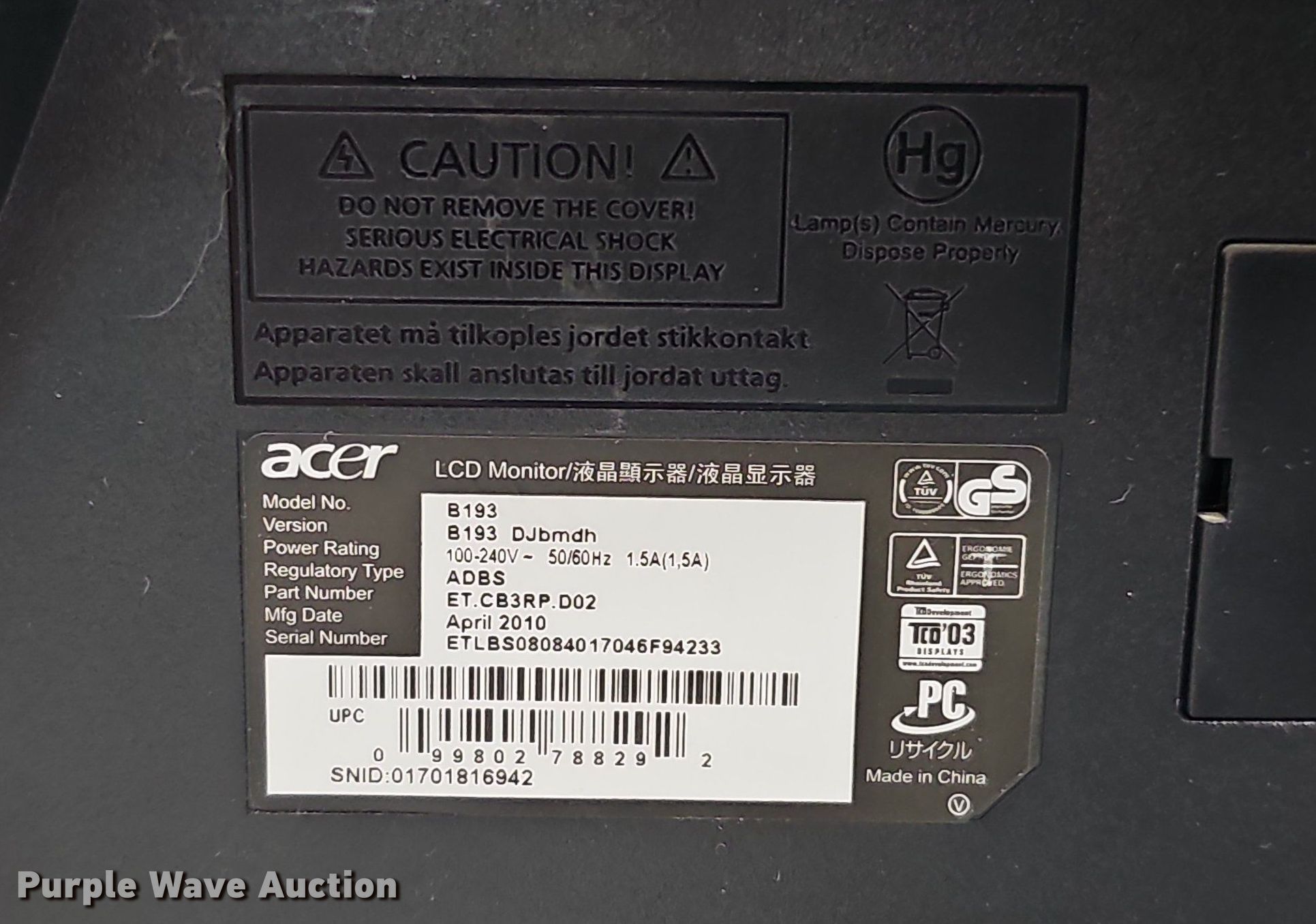 Purple Wave is selling a used Electronics in Nebraska. This item is a Acer B193 computer monitor with the following: Acer B193 computer monitor. Washington County, NE. 8845 Berry Hill Road. Blair, NE 68008