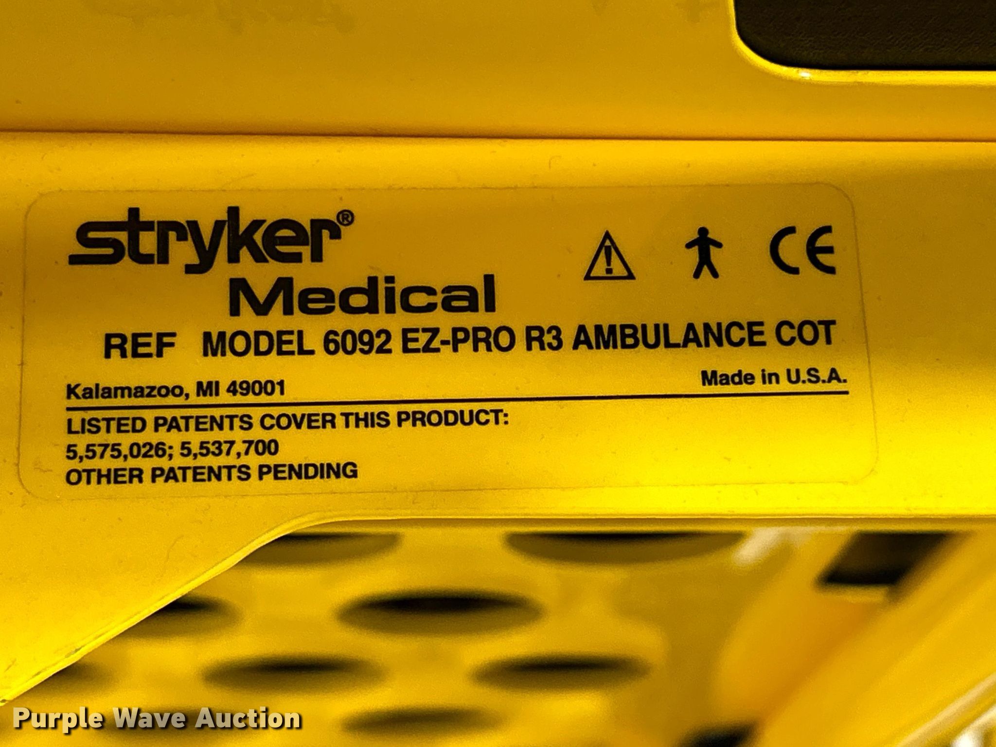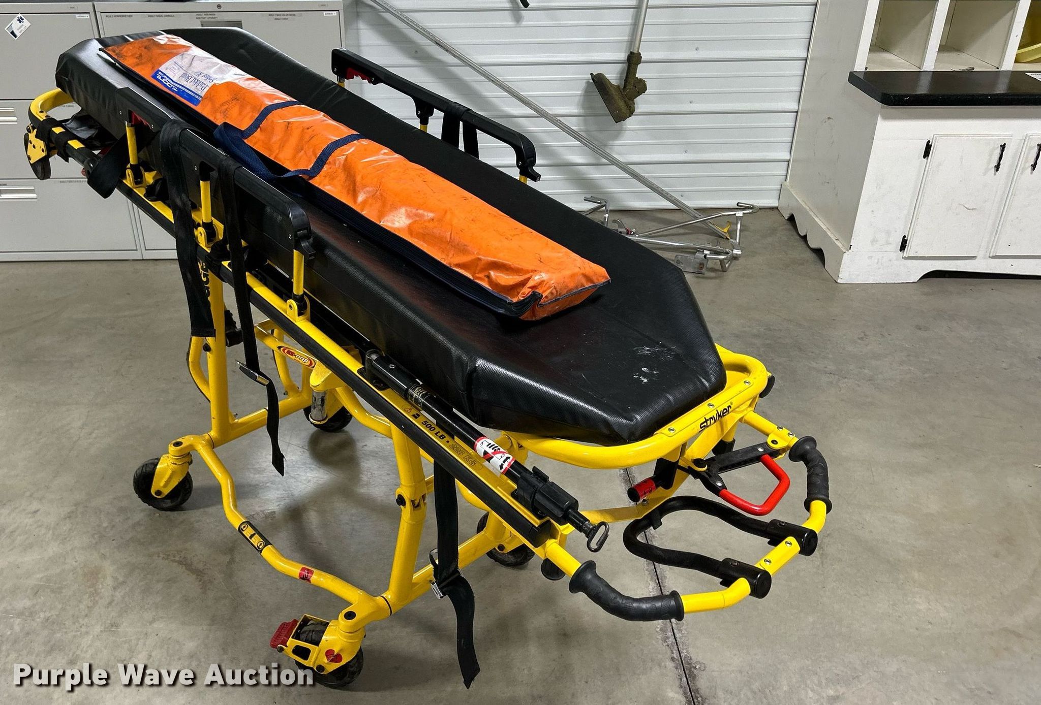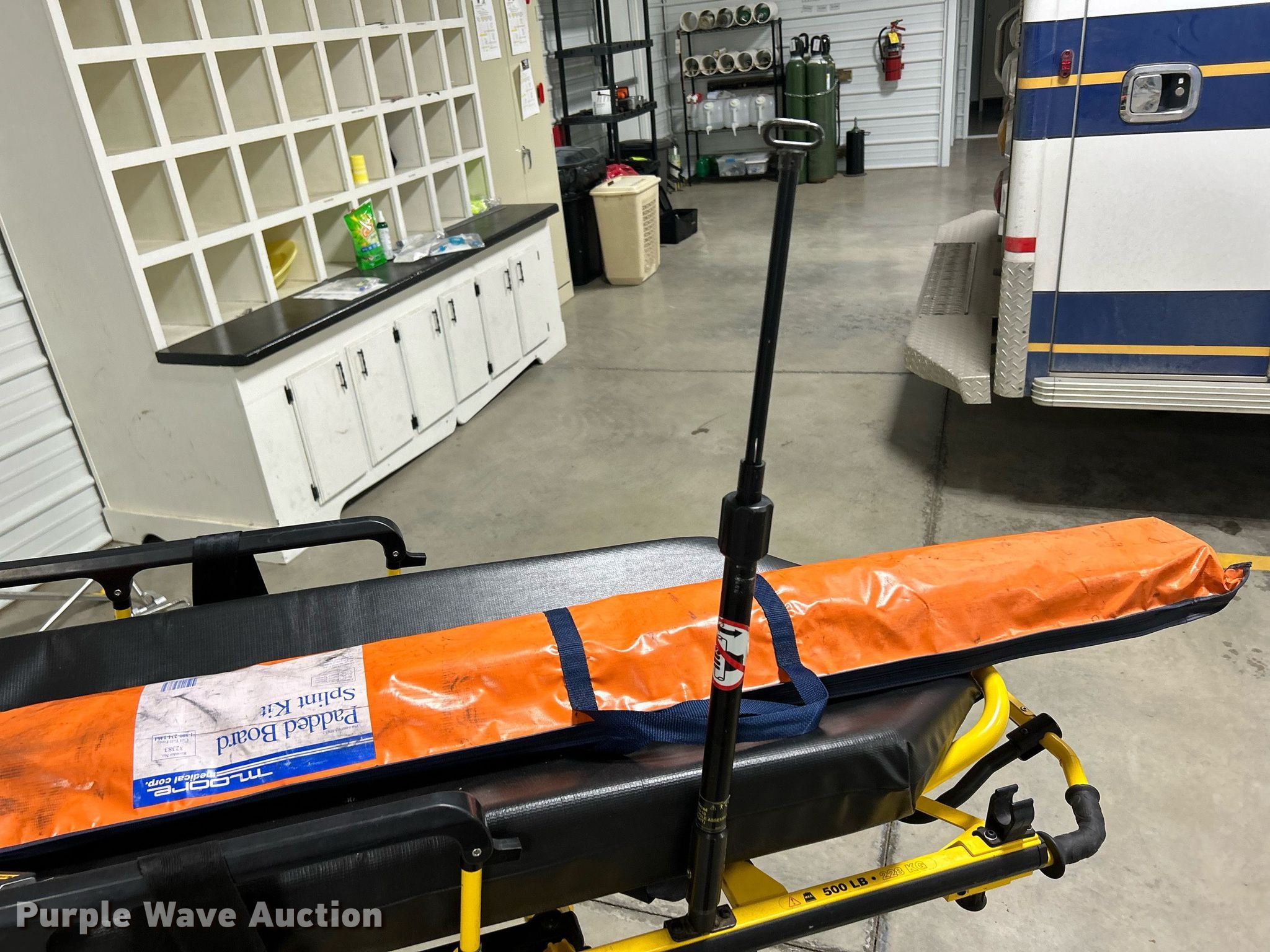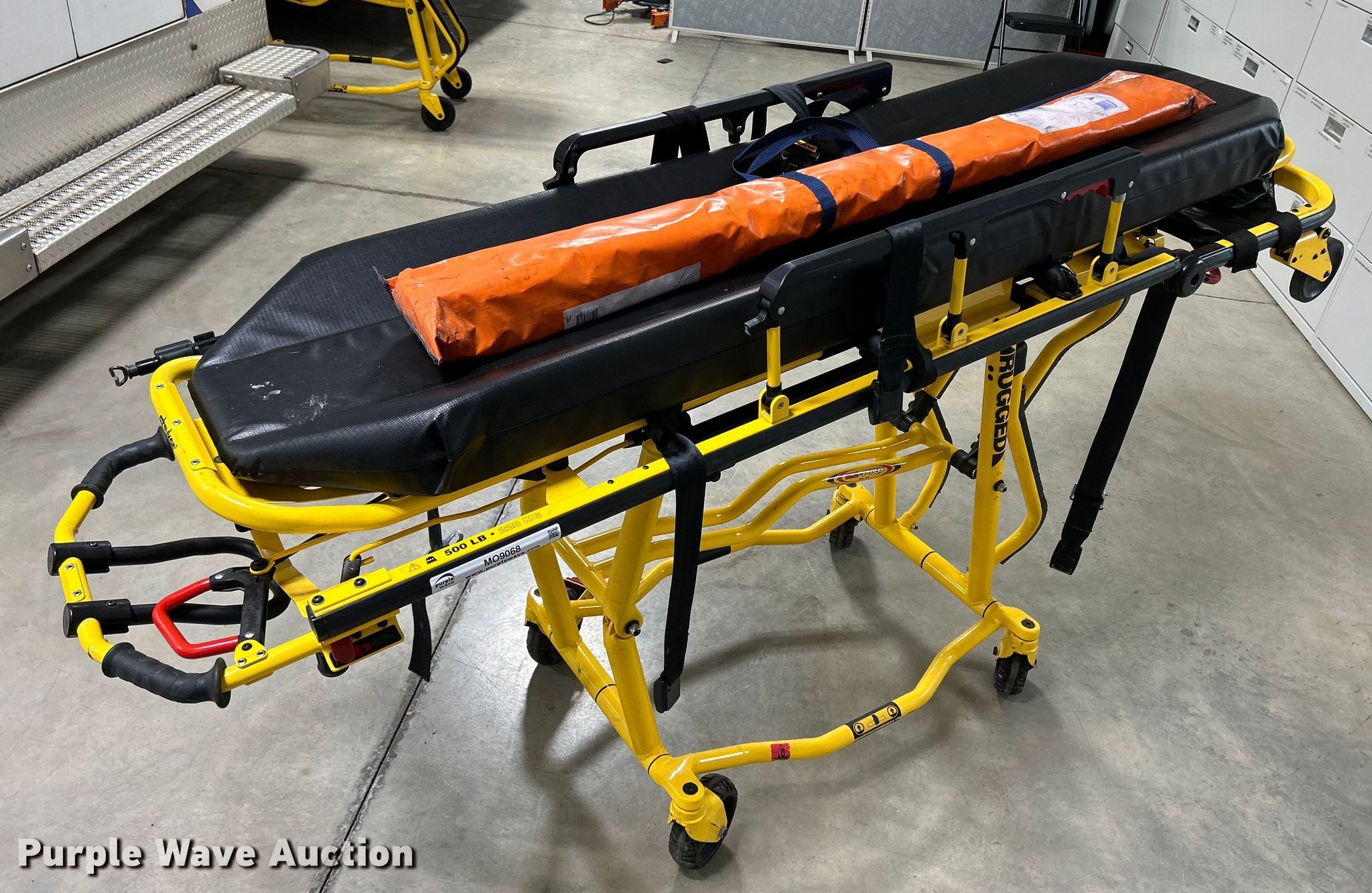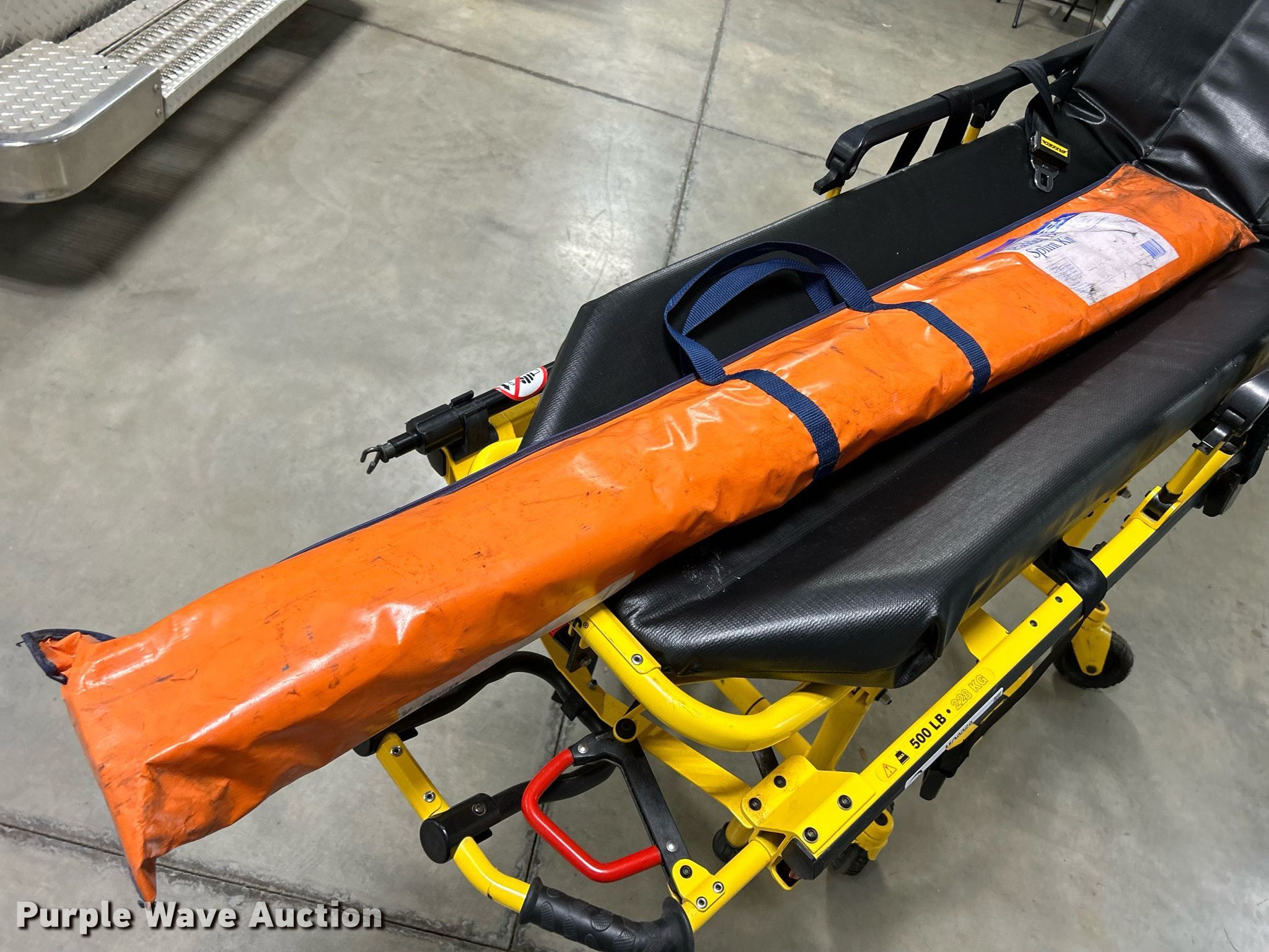 Purple Wave is selling a used Medical Equip. in Iowa. This item is a Stryker 6092 EZ-Pro R3 Stretcher with the following: Serial: 020839594, Capacity: 500 lbs, Splint kit, (2) 15" boards, (2) 54" boards
