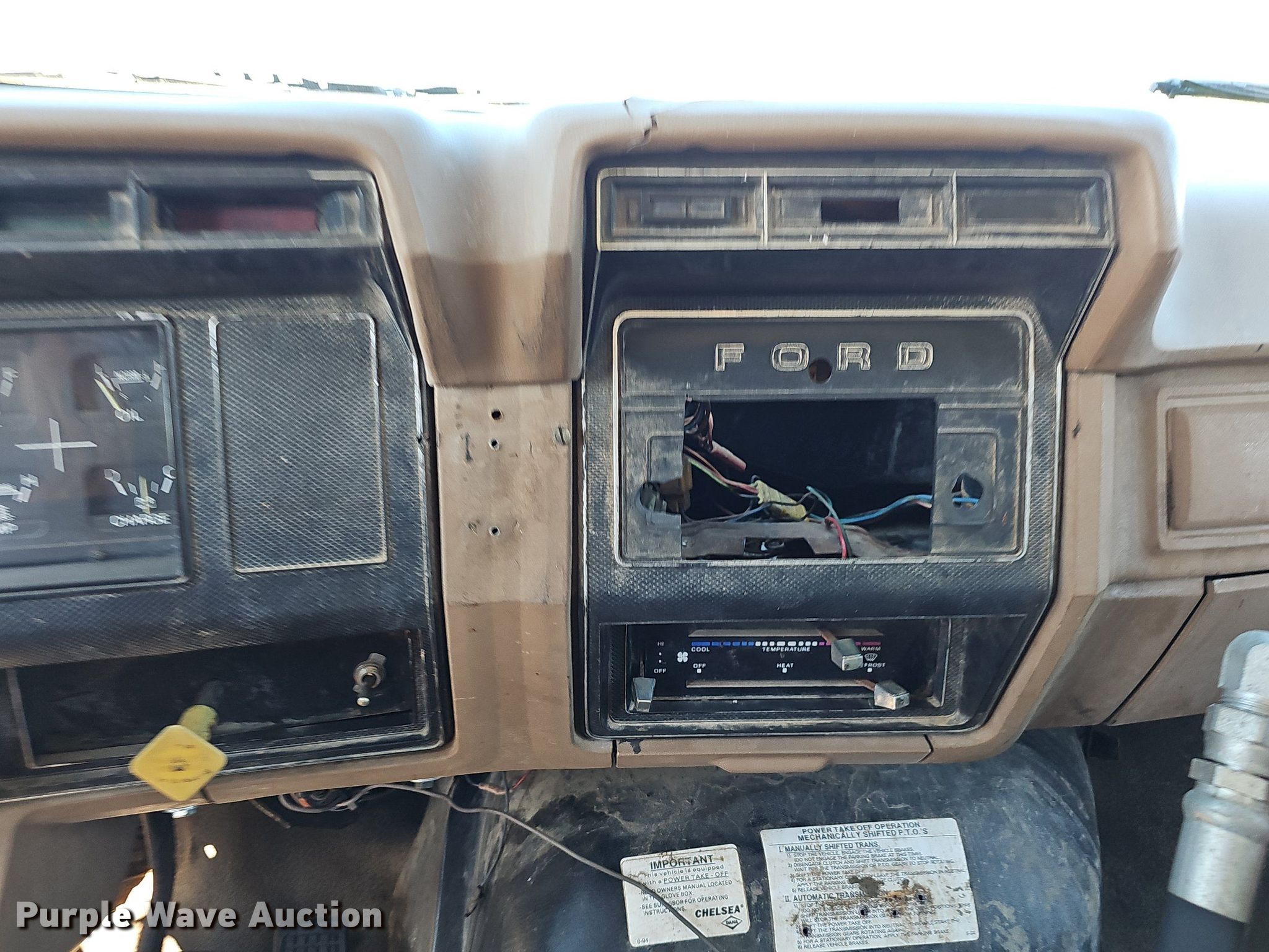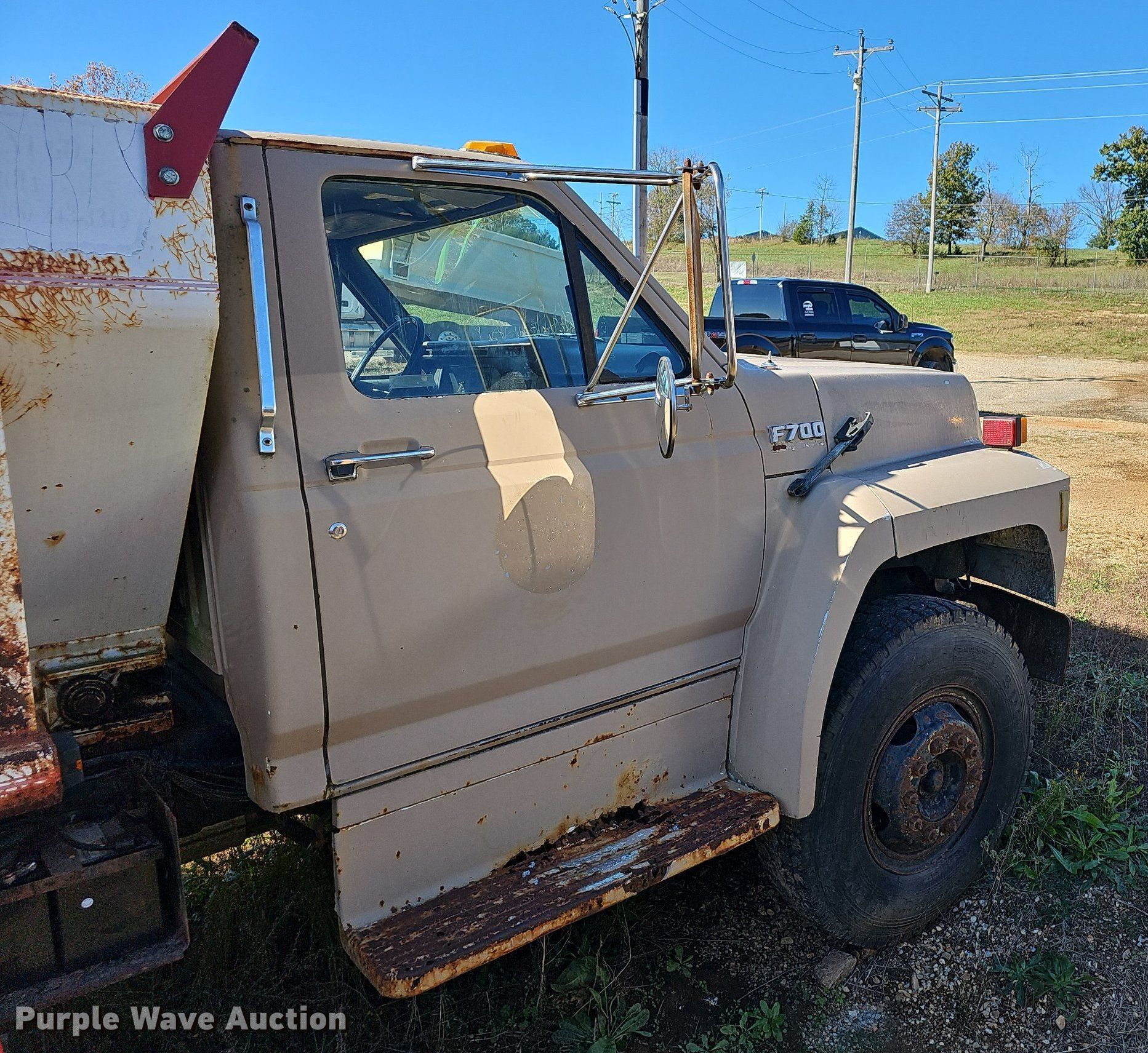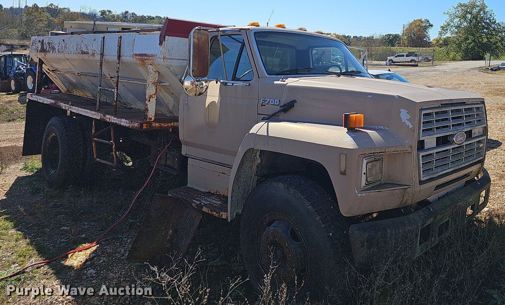 1987 Ford F700 manure spreader truck. Miles: 86,620 on odometer, VIN: 1FDNT74P1HVA04128. Engine Ford, Displacement: 6.6L, Cylinders: 6, Fuel type: Diesel. Transmission Ford, Manual, Speed: 5, plus 2. Chassis Axles: Single, Suspension: Spring, Brakes: Hydraulic, PTO, GVWR: 23,100 lbs, Wheelbase: 225". Interior Heat. Features Manure spreader bed Donovan, 15' L x 88" W, Side height: 41", Chain driven floor, Quantity: 2, Rear applicator: Disc Width: 24", Spacing: 2".. Tires Size: 10.00R20. Notes Dead battery, Unknown operating condition. Arkansas title. Carroll County, AR. 205 Hailey Road. Berryville, AR 72616