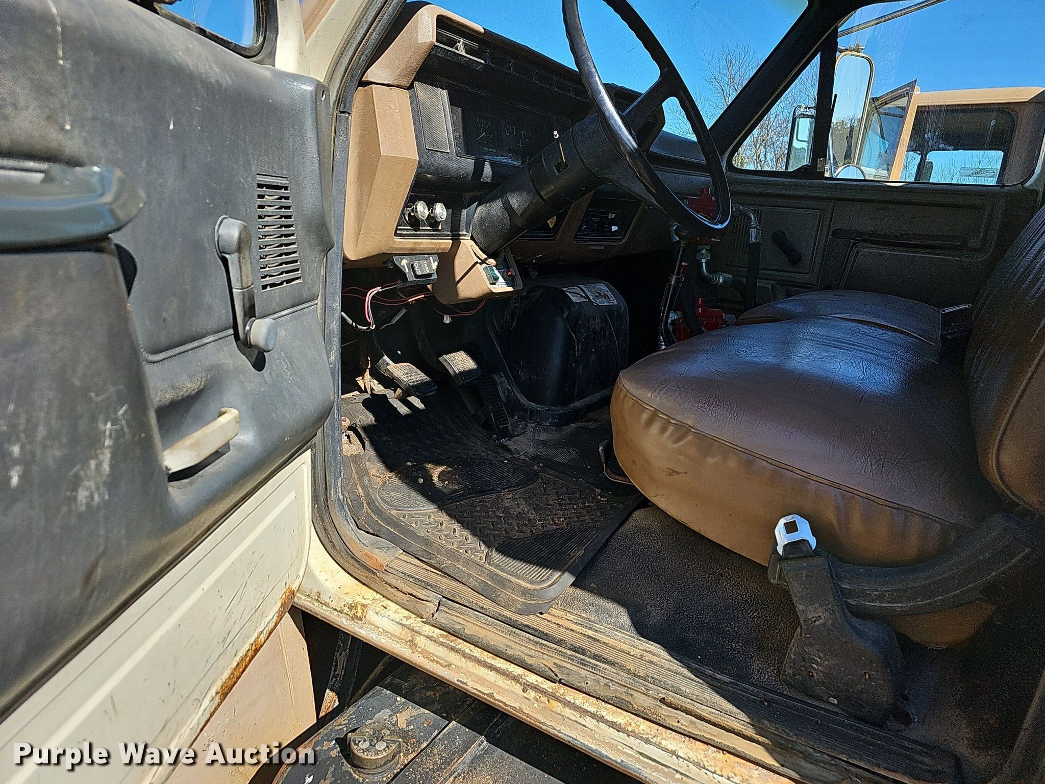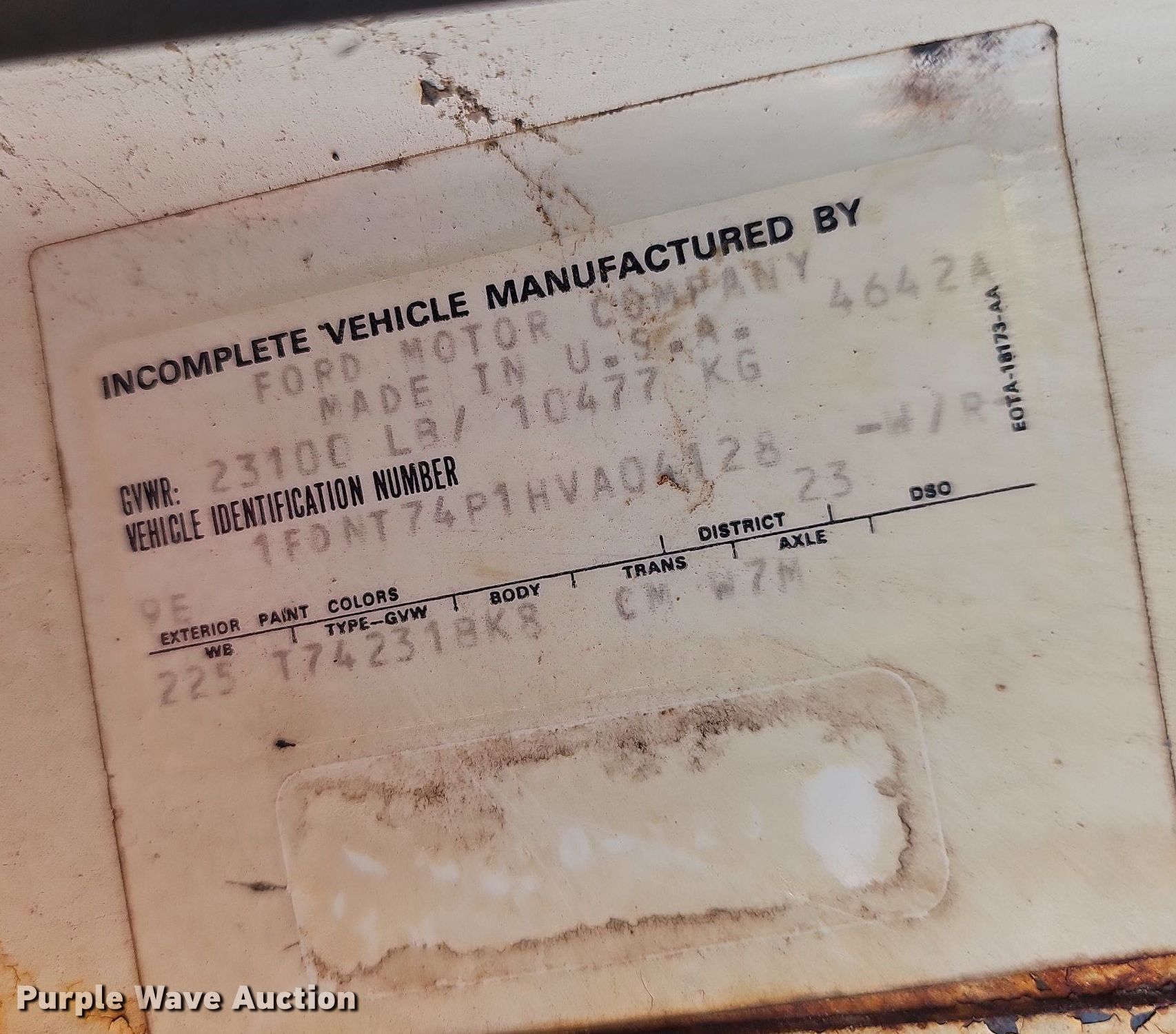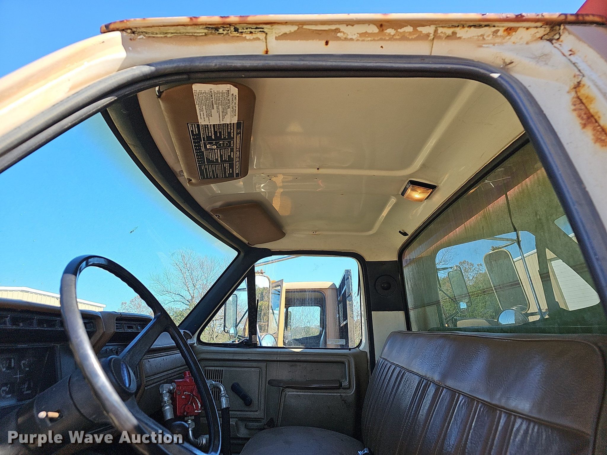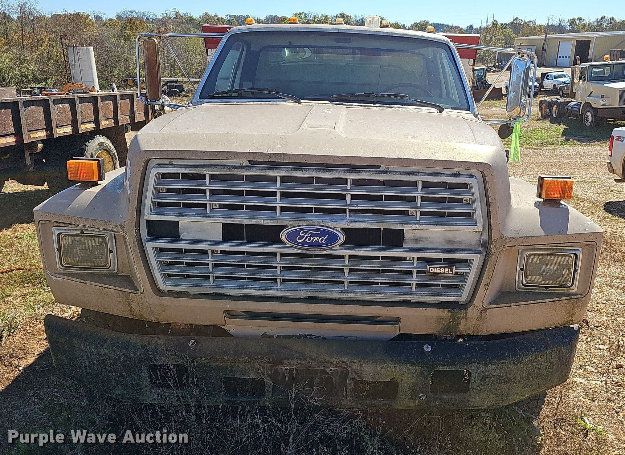 1987 Ford F700 manure spreader truck. Miles: 86,620 on odometer, VIN: 1FDNT74P1HVA04128. Engine Ford, Displacement: 6.6L, Cylinders: 6, Fuel type: Diesel. Transmission Ford, Manual, Speed: 5, plus 2. Chassis Axles: Single, Suspension: Spring, Brakes: Hydraulic, PTO, GVWR: 23,100 lbs, Wheelbase: 225". Interior Heat. Features Manure spreader bed Donovan, 15' L x 88" W, Side height: 41", Chain driven floor, Quantity: 2, Rear applicator: Disc Width: 24", Spacing: 2".. Tires Size: 10.00R20. Notes Dead battery, Unknown operating condition. Arkansas title. Carroll County, AR. 205 Hailey Road. Berryville, AR 72616