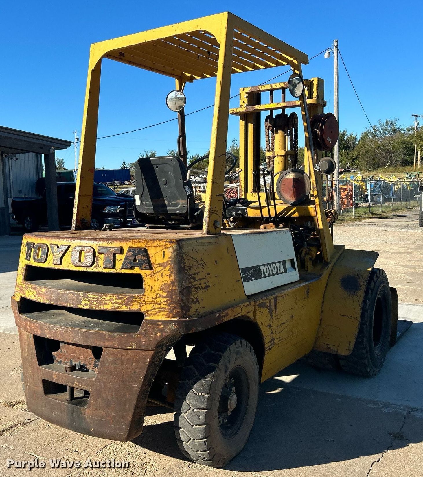 Purple Wave is selling a used Strt. Mast Rough Terr. Forklift in Oklahoma. This item is a Toyota 2FG35 forklift with the following: Hours: 9,414 on meter, Serial: 2FG35-60806