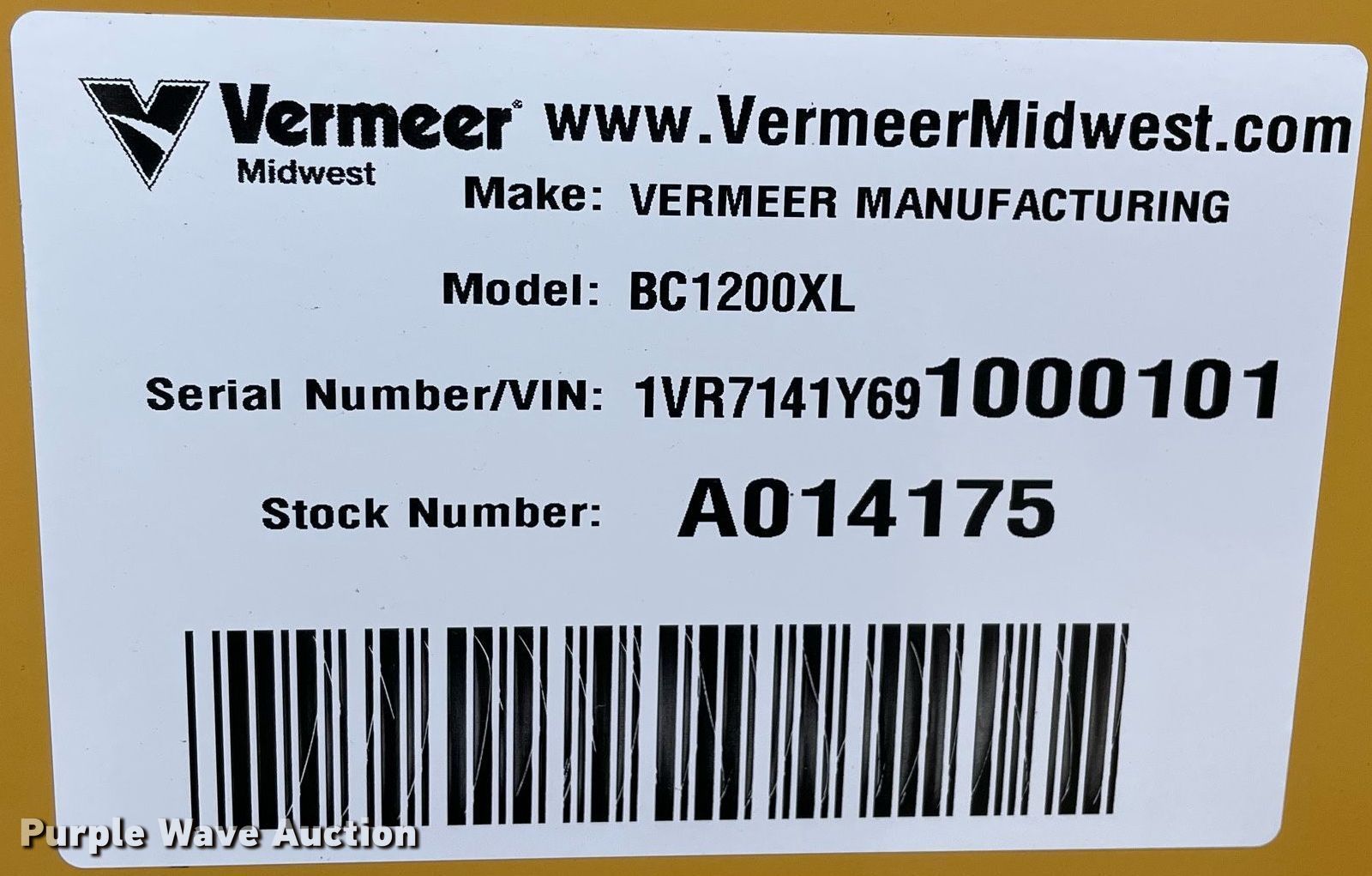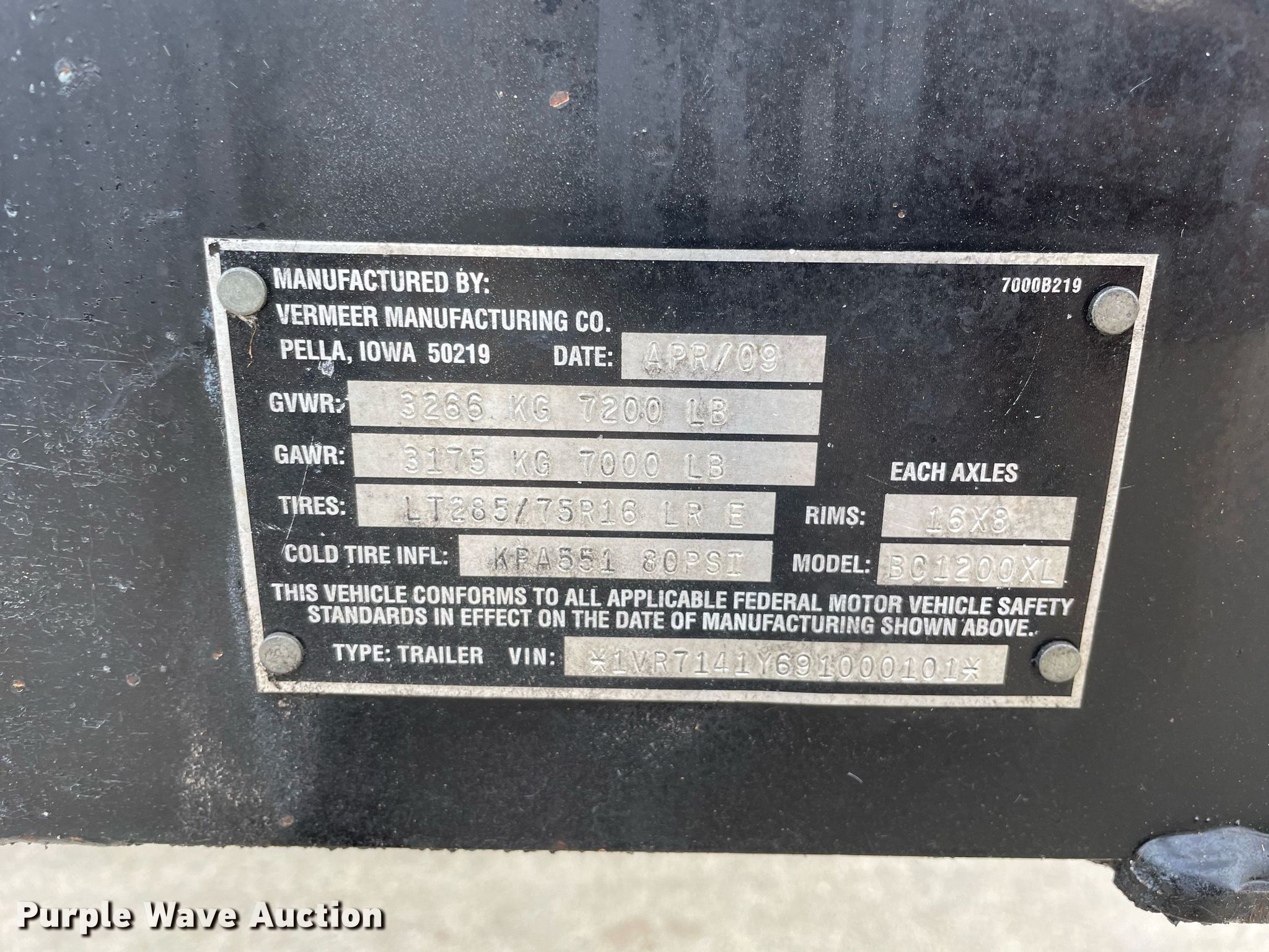 2009 Vermeer BC1200XL wood chipper. Hours: 2,414 on meter, VIN: 1VR7141Y691000101. Engine Cummins QSB3.3, Cylinders: 4, Fuel type: Diesel. Features Capacity: 12", Throat opening: 17" L x 15" W, Auto feed. Tires Size: 285/75R16. Trailer 13' 6" L x 80" W, Hitch: Pintle, Brakes: Electric, Axles: Single, Tire size: 285/75R16, GVWR: 7,200 lbs, GAWR: 7,000 lbs. Notes Non-operational engine, Dead battery, Non-operational unit. This is worksite support equipment and will not come with a title. Transfer of ownership documentation will be a bill of sale. Vermeer Midwest. 2801 Beverly Dr. Aurora, IL 60502