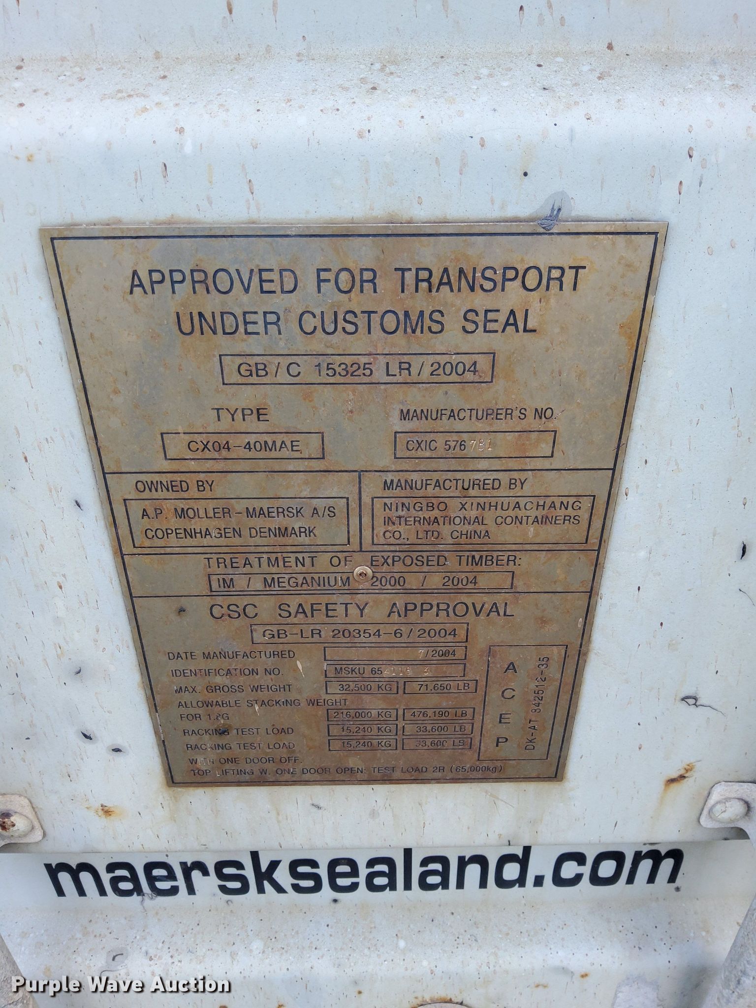 2004 NINGBO XINHUACHANG CX04-40MAE shipping container. Serial: MSKKU65, 40' L x 8' W x 8' 6' H. Corner Carriers Brokerage Inc. 1525 North 21st Street. Decatur, IL 62526