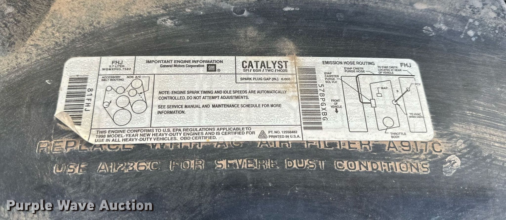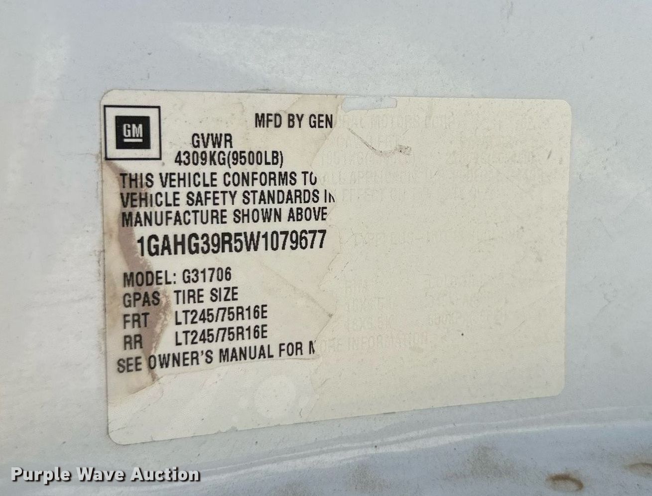 1998 Chevrolet Express 3500 van. Miles: 170,061 on odometer, VIN: 1GAHG39R5W1079677. Engine Displacement: 5.7L V8 OHV, Cylinders: 8, Fuel type: Gas. Transmission Automatic. Interior AC, Heat, Cruise control. Tires Size: 245/75R16. Notes Windshield chipped or cracked, Hail damage. Oklahoma classic title. Title distribution may be delayed up to 30 days from verification of funds. Smithfields Hog Production Division. 13051 US Hwy 60. Pampa , TX 79065