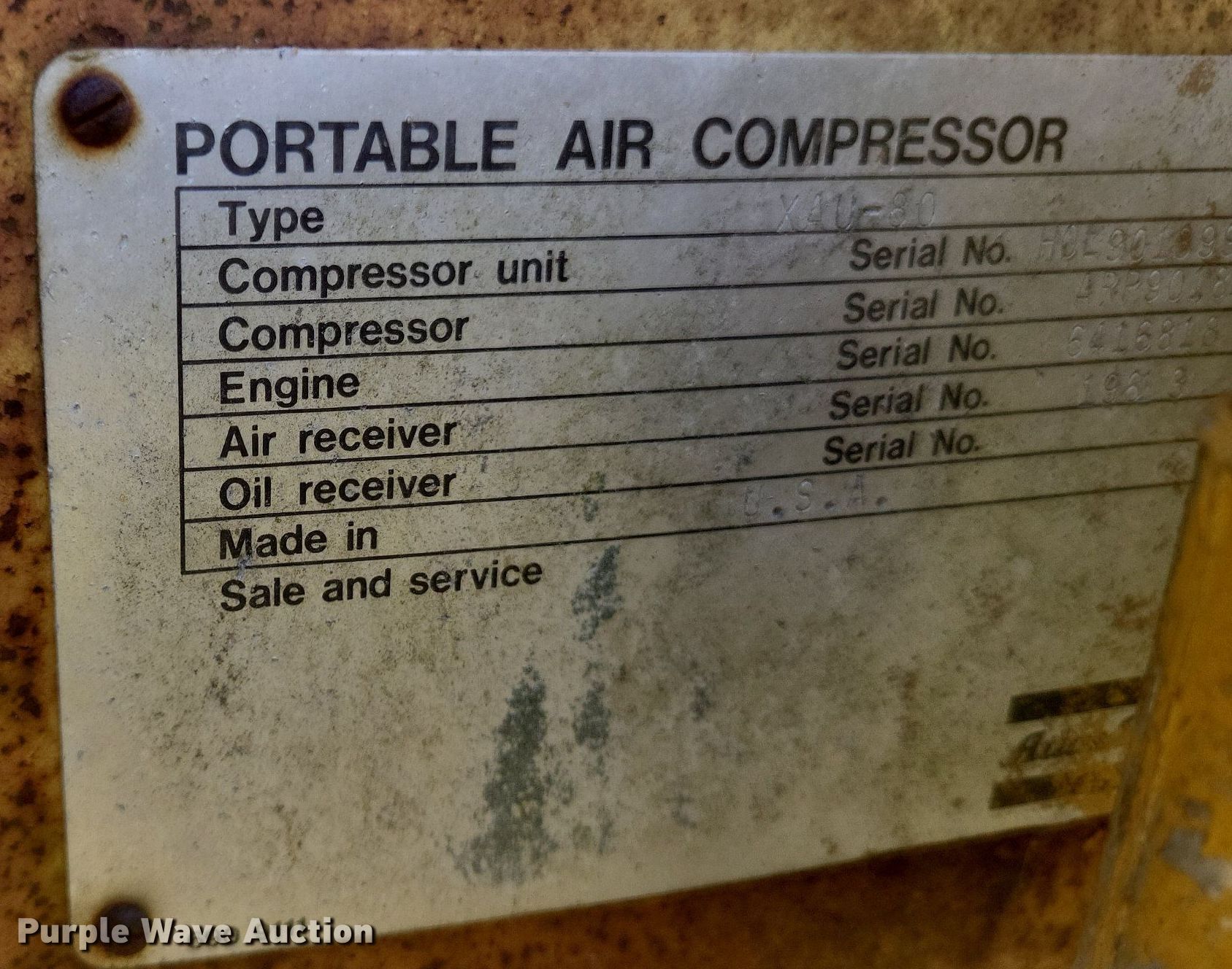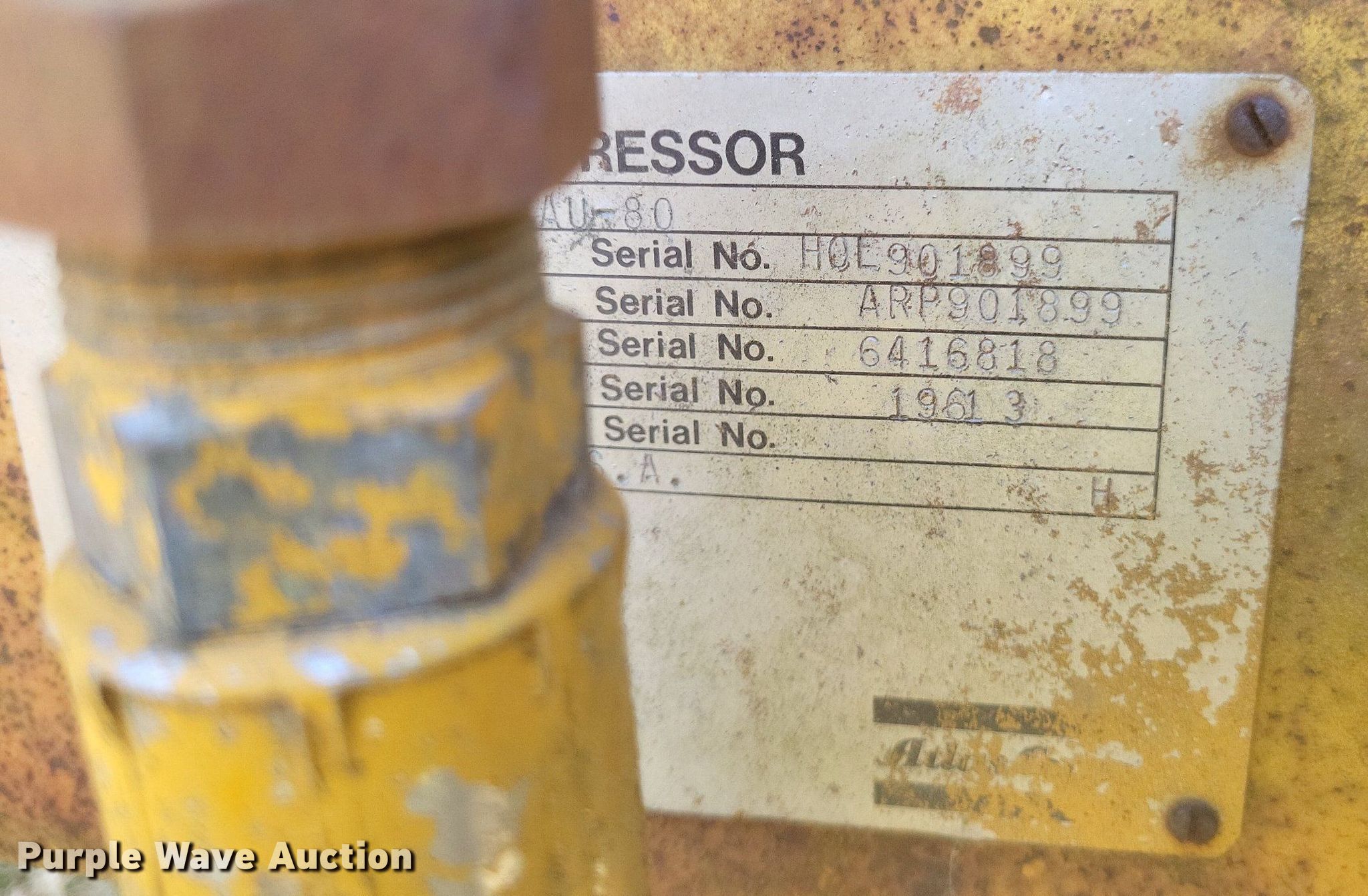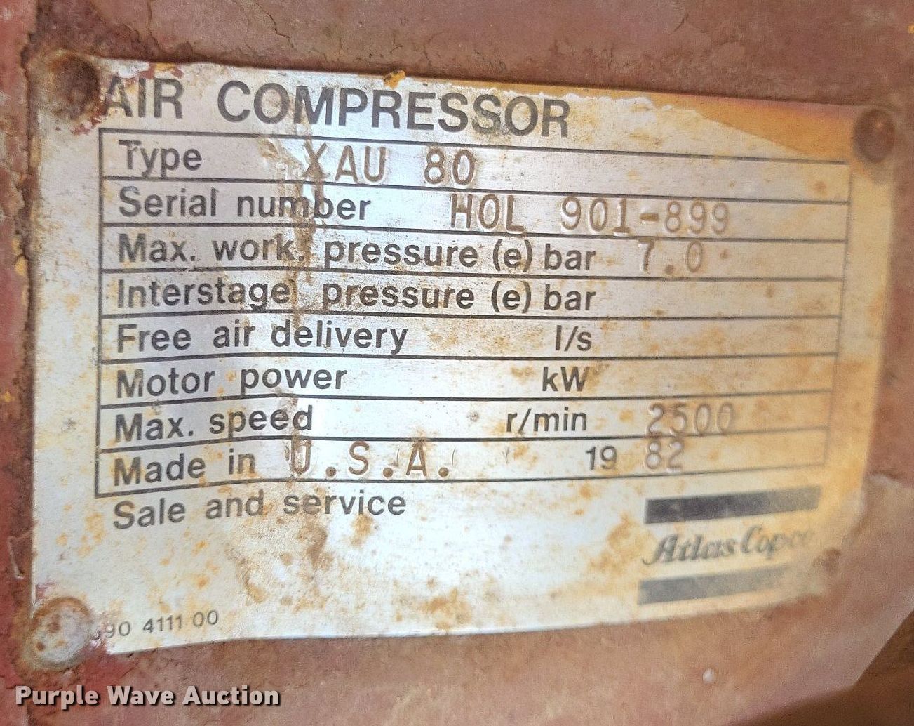 Purple Wave is selling a used Air Compressor in Missouri. This item is a 1982 Atlas Copco XAU-80 air compressor with the following: Serial: HOL901899