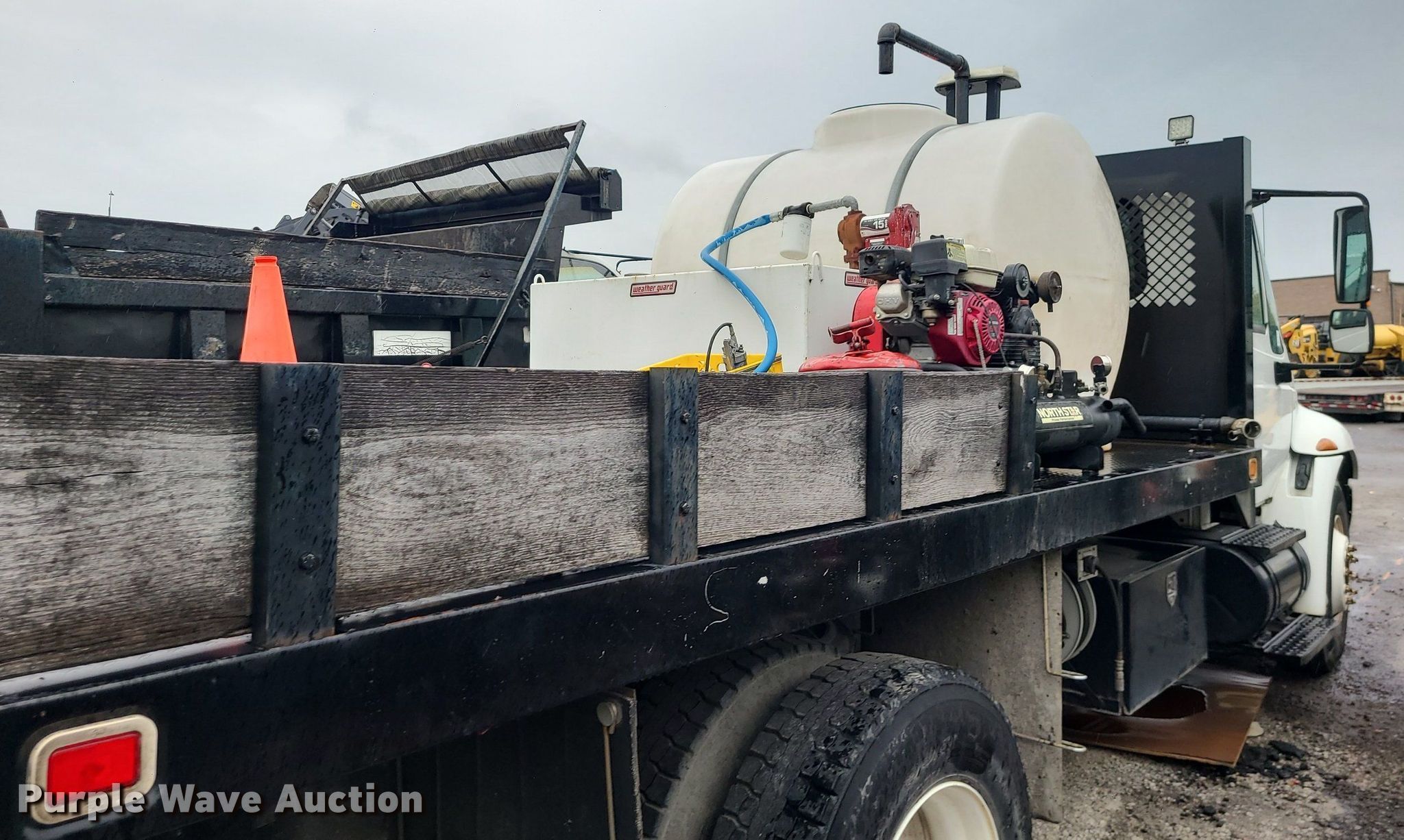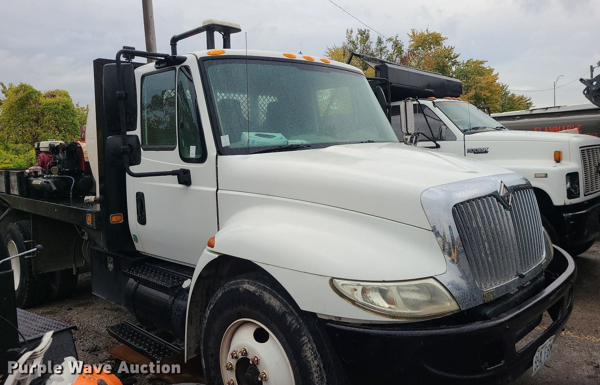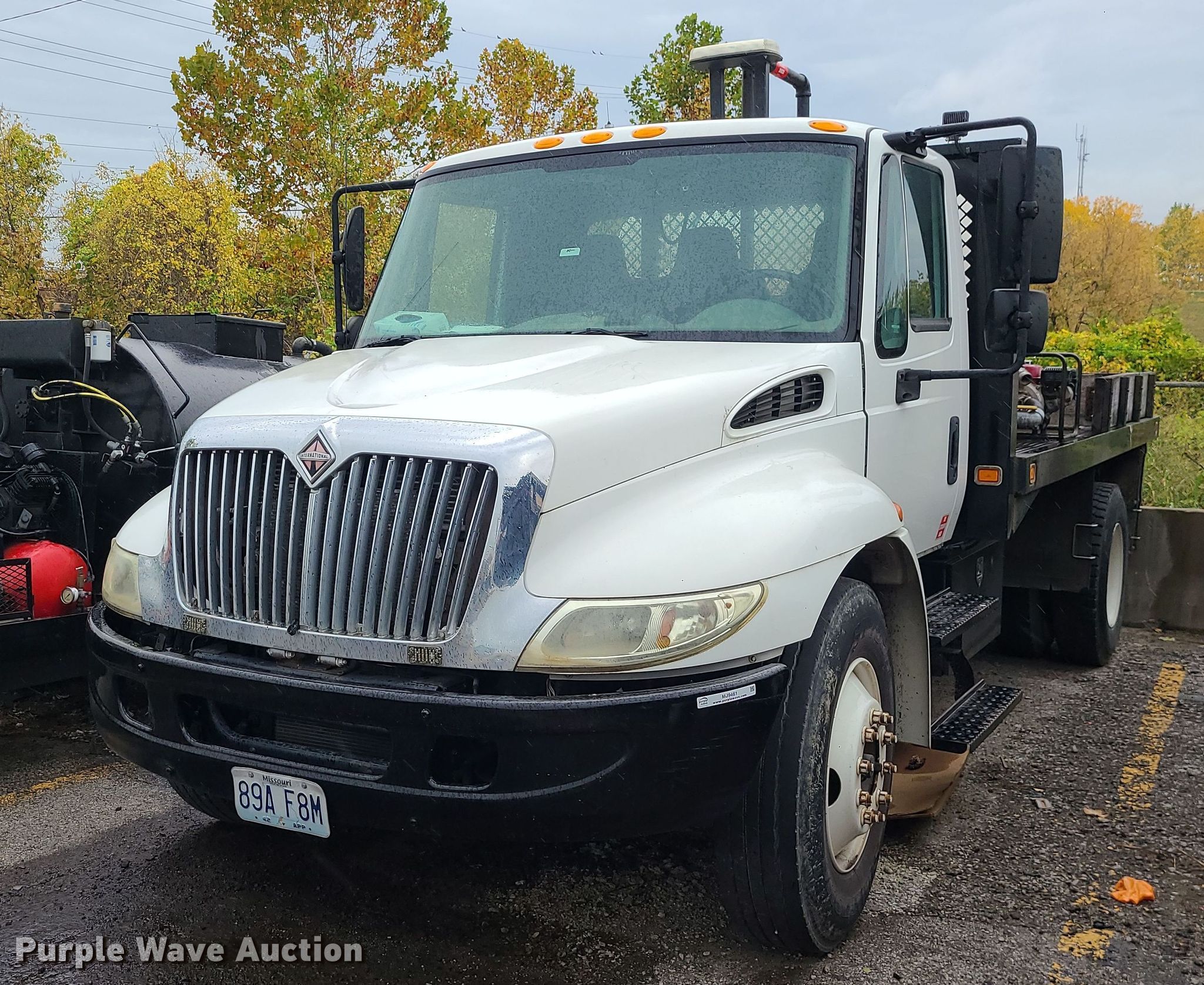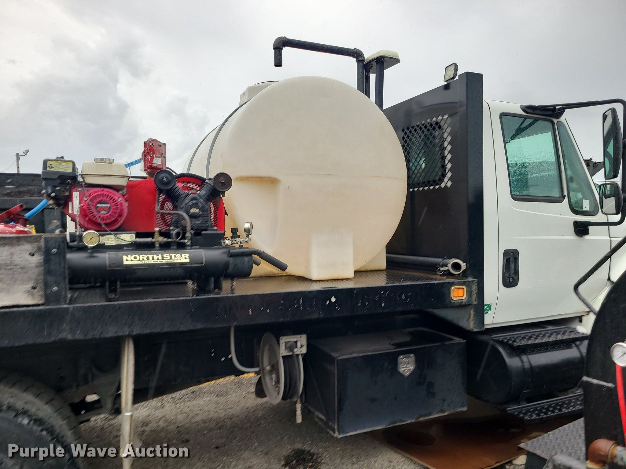 2004 International 4300 flatbed truck. Miles: 222,627 on odometer, Hours: 8,391 on meter, VIN: 1HTMMAAM54H593832. Engine Displacement: 7.6L , Cylinders: 6, Fuel type: Diesel. Transmission Automatic. Chassis Axles: Single, Suspension: Spring, Brakes: Hydraulic. Interior AC, Heat. Features Flatbed 14'L x 96" W, Northstar gas powered air compressor, Honda water pump, Auxiliary fuel tank with 12V pump, 500 gallon poly tank. Tires Size: 11/R22.5. Notes Engine issues, cranks but does not start., Possible electrical issue , rodent damage., Non-operational unit. Missouri title. Title distribution may be delayed up to 14 days from verification of funds. Seal-O-Matic Paving. 2601 Northwest Tullison Road. Riverside, MO 64150
