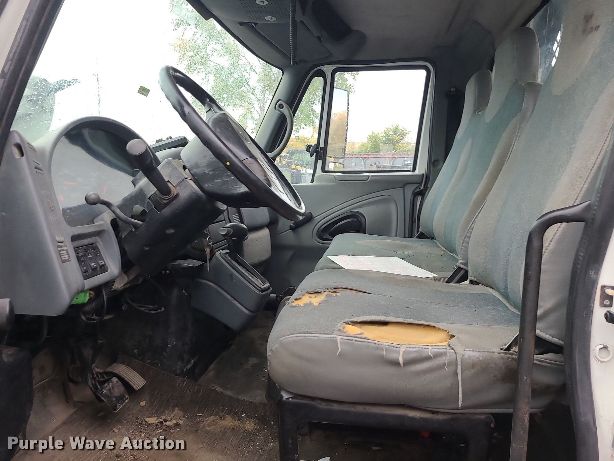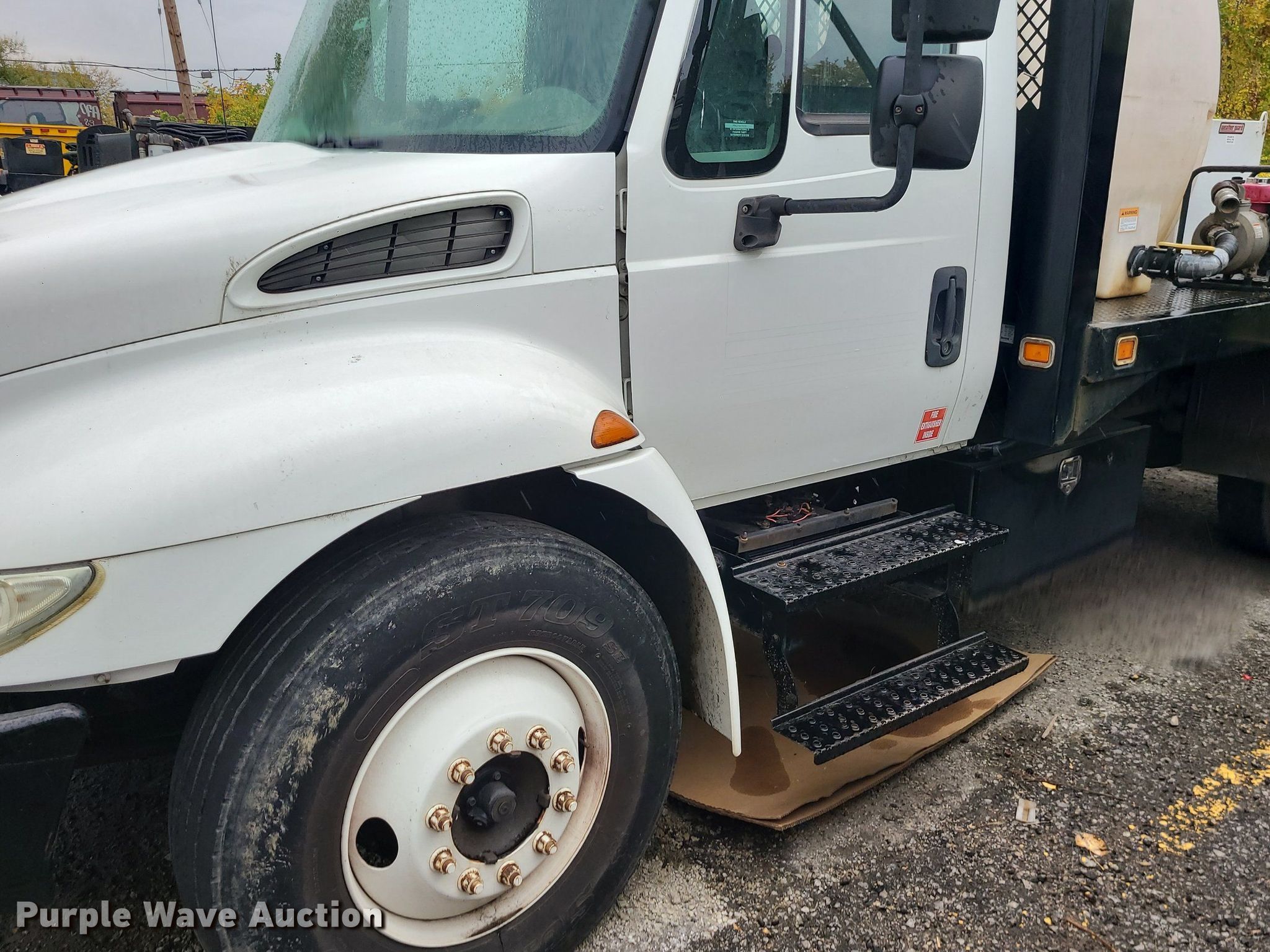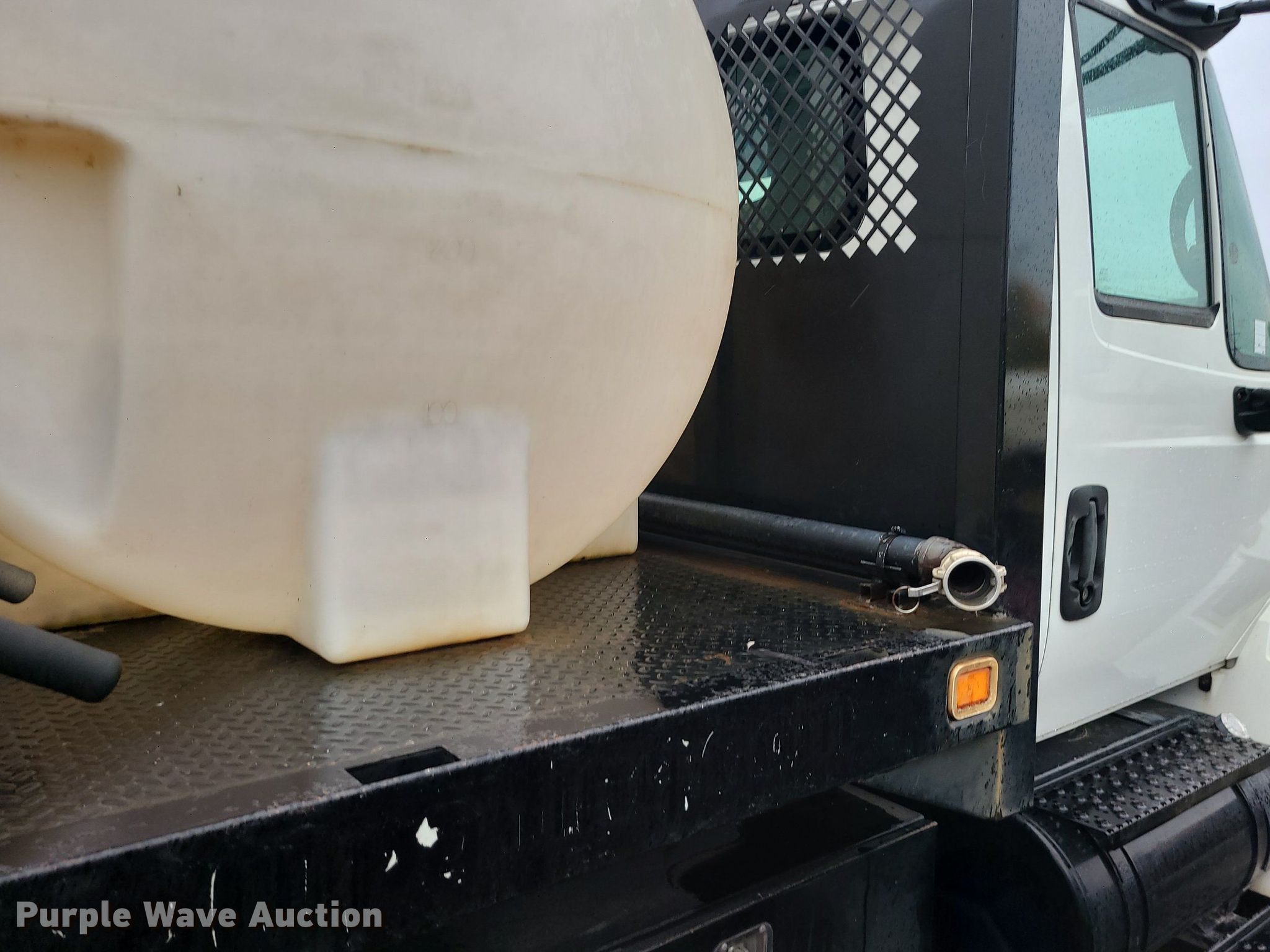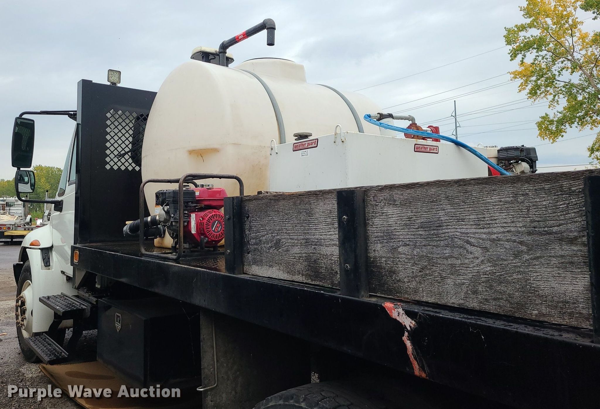 2004 International 4300 flatbed truck. Miles: 222,627 on odometer, Hours: 8,391 on meter, VIN: 1HTMMAAM54H593832. Engine Displacement: 7.6L , Cylinders: 6, Fuel type: Diesel. Transmission Automatic. Chassis Axles: Single, Suspension: Spring, Brakes: Hydraulic. Interior AC, Heat. Features Flatbed 14'L x 96" W, Northstar gas powered air compressor, Honda water pump, Auxiliary fuel tank with 12V pump, 500 gallon poly tank. Tires Size: 11/R22.5. Notes Engine issues, cranks but does not start., Possible electrical issue , rodent damage., Non-operational unit. Missouri title. Title distribution may be delayed up to 14 days from verification of funds. Seal-O-Matic Paving. 2601 Northwest Tullison Road. Riverside, MO 64150