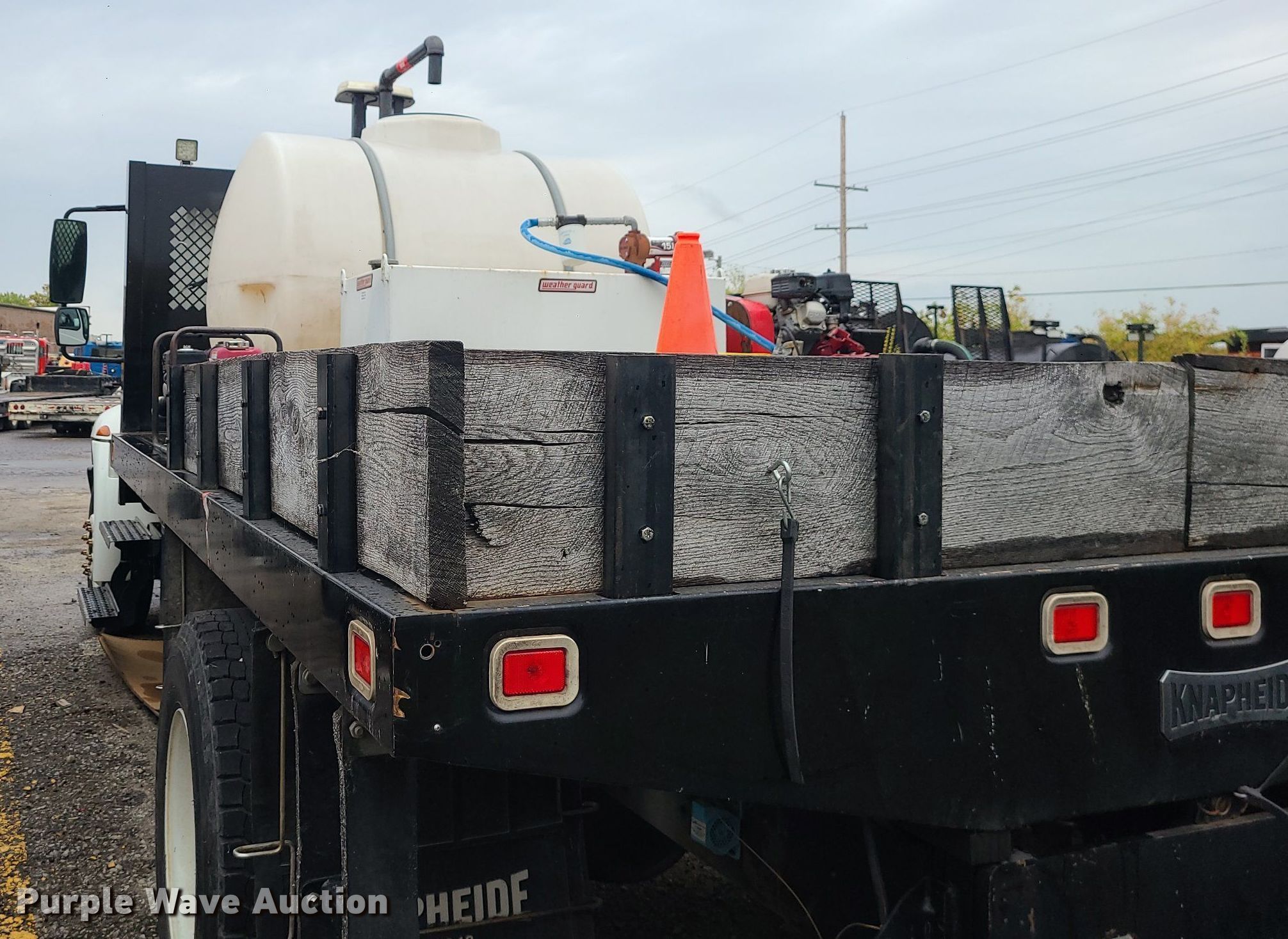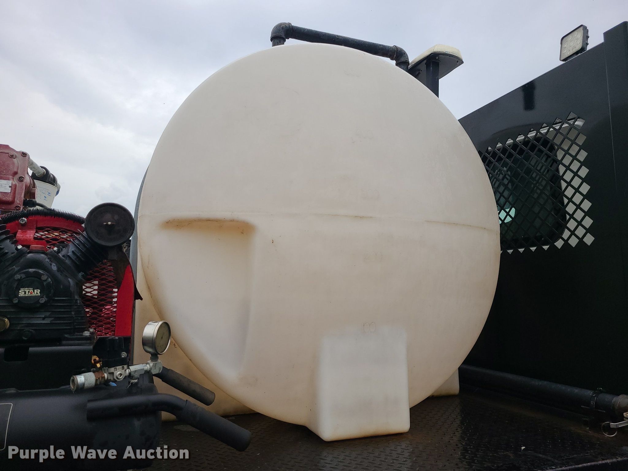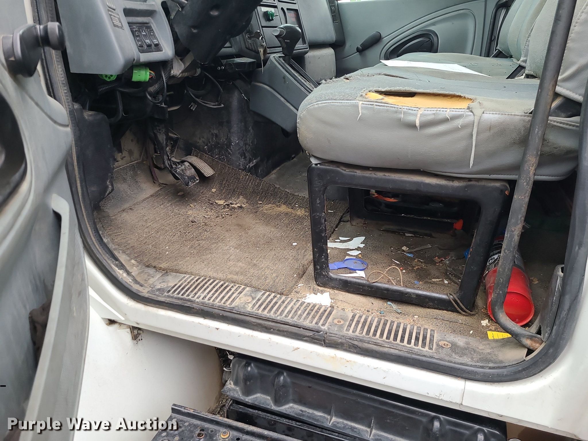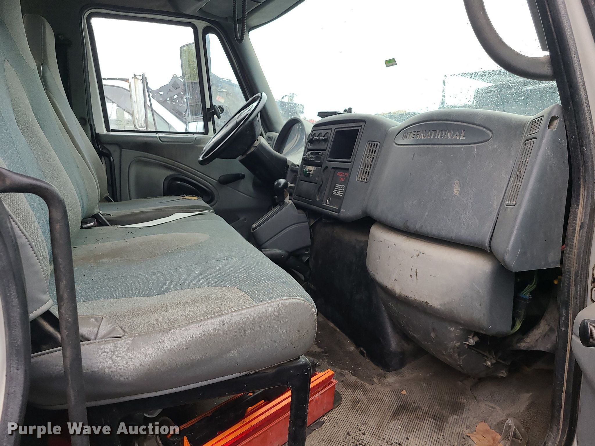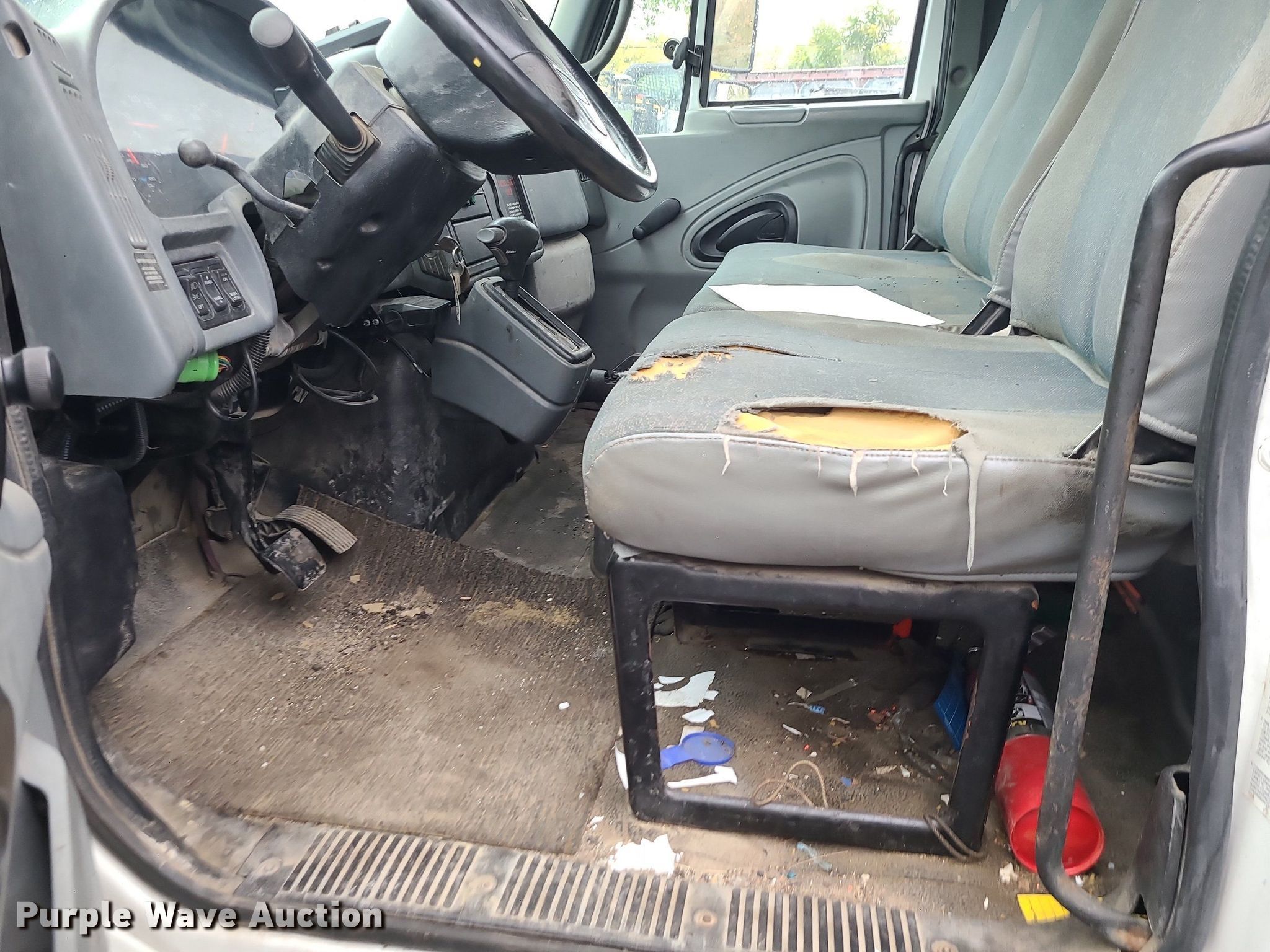 2004 International 4300 flatbed truck. Miles: 222,627 on odometer, Hours: 8,391 on meter, VIN: 1HTMMAAM54H593832. Engine Displacement: 7.6L , Cylinders: 6, Fuel type: Diesel. Transmission Automatic. Chassis Axles: Single, Suspension: Spring, Brakes: Hydraulic. Interior AC, Heat. Features Flatbed 14'L x 96" W, Northstar gas powered air compressor, Honda water pump, Auxiliary fuel tank with 12V pump, 500 gallon poly tank. Tires Size: 11/R22.5. Notes Engine issues, cranks but does not start., Possible electrical issue , rodent damage., Non-operational unit. Missouri title. Title distribution may be delayed up to 14 days from verification of funds. Seal-O-Matic Paving. 2601 Northwest Tullison Road. Riverside, MO 64150