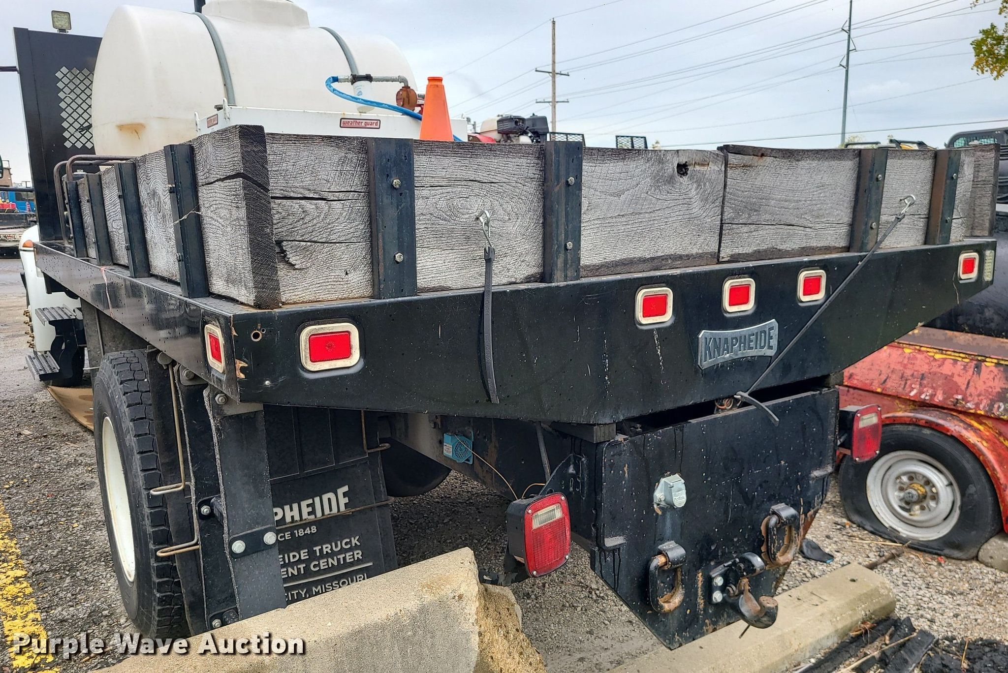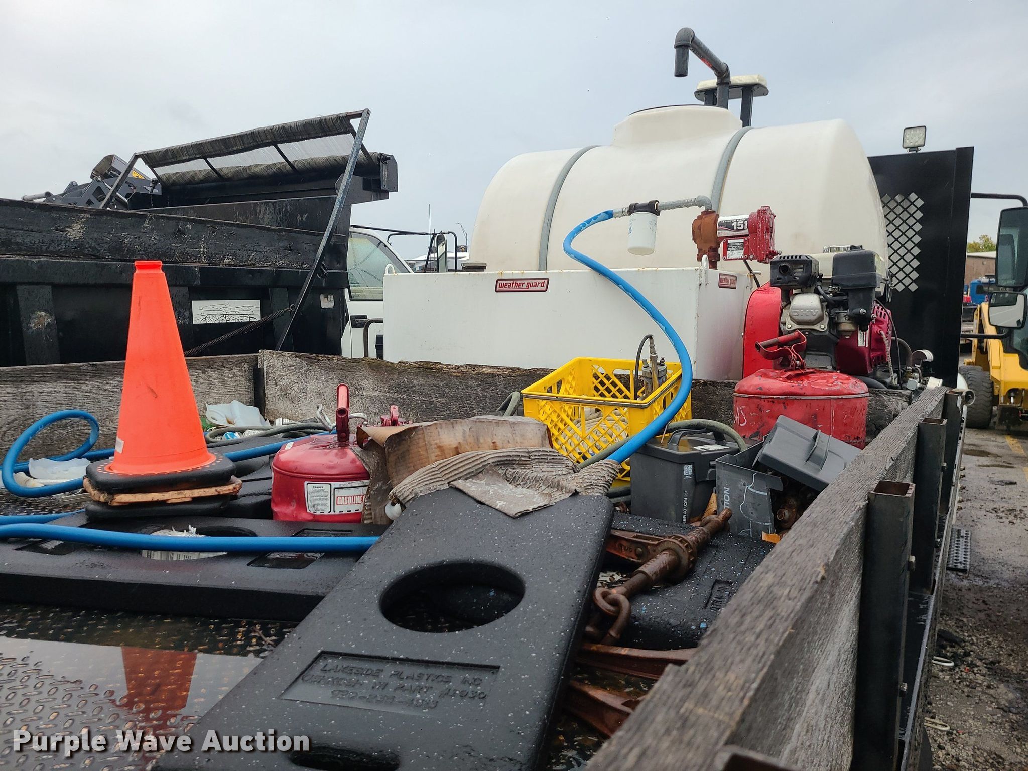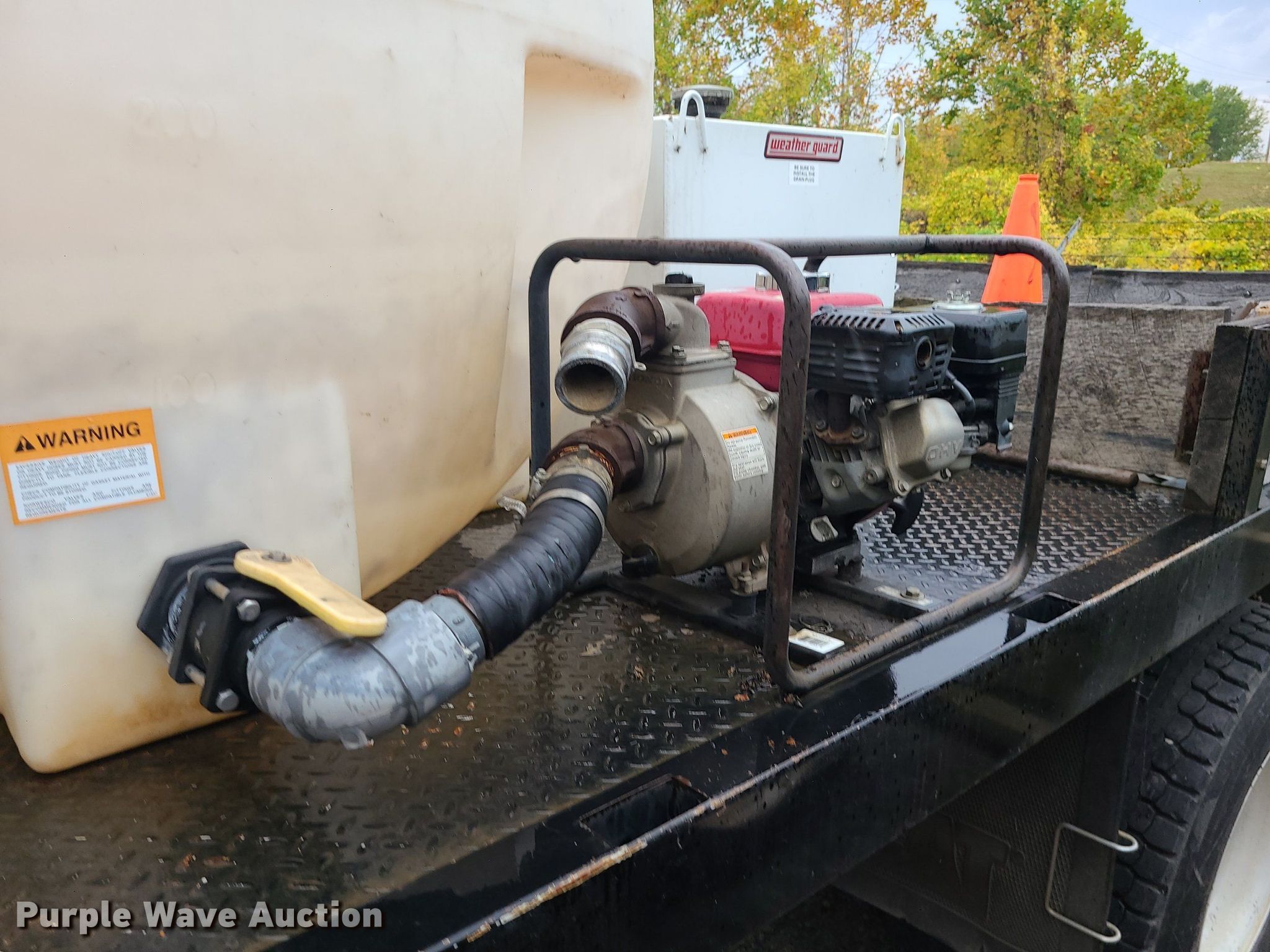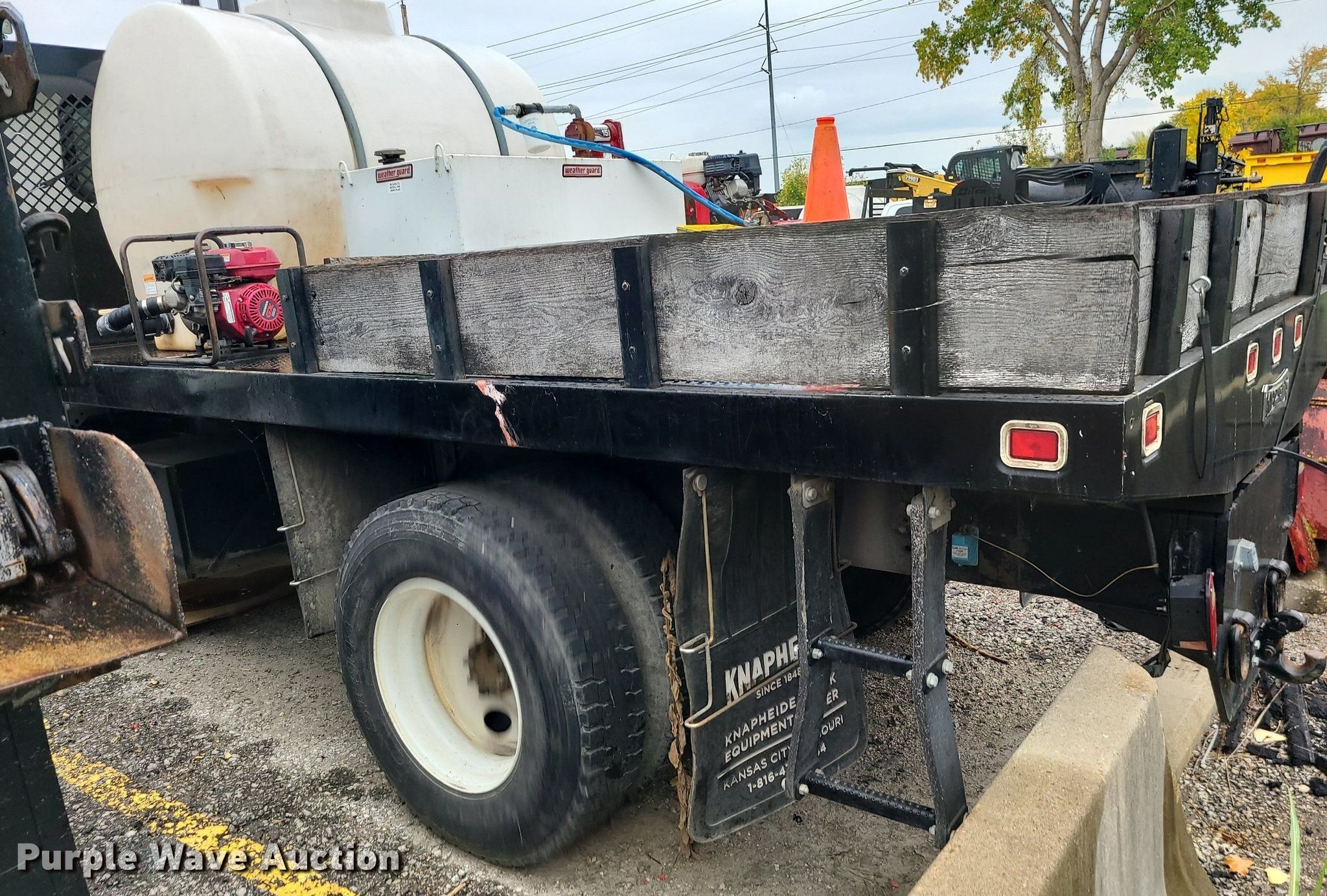 2004 International 4300 flatbed truck. Miles: 222,627 on odometer, Hours: 8,391 on meter, VIN: 1HTMMAAM54H593832. Engine Displacement: 7.6L , Cylinders: 6, Fuel type: Diesel. Transmission Automatic. Chassis Axles: Single, Suspension: Spring, Brakes: Hydraulic. Interior AC, Heat. Features Flatbed 14'L x 96" W, Northstar gas powered air compressor, Honda water pump, Auxiliary fuel tank with 12V pump, 500 gallon poly tank. Tires Size: 11/R22.5. Notes Engine issues, cranks but does not start., Possible electrical issue , rodent damage., Non-operational unit. Missouri title. Title distribution may be delayed up to 14 days from verification of funds. Seal-O-Matic Paving. 2601 Northwest Tullison Road. Riverside, MO 64150