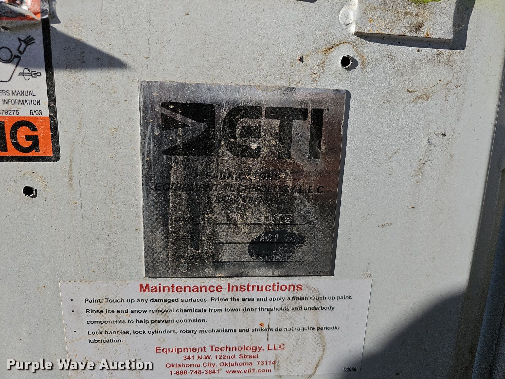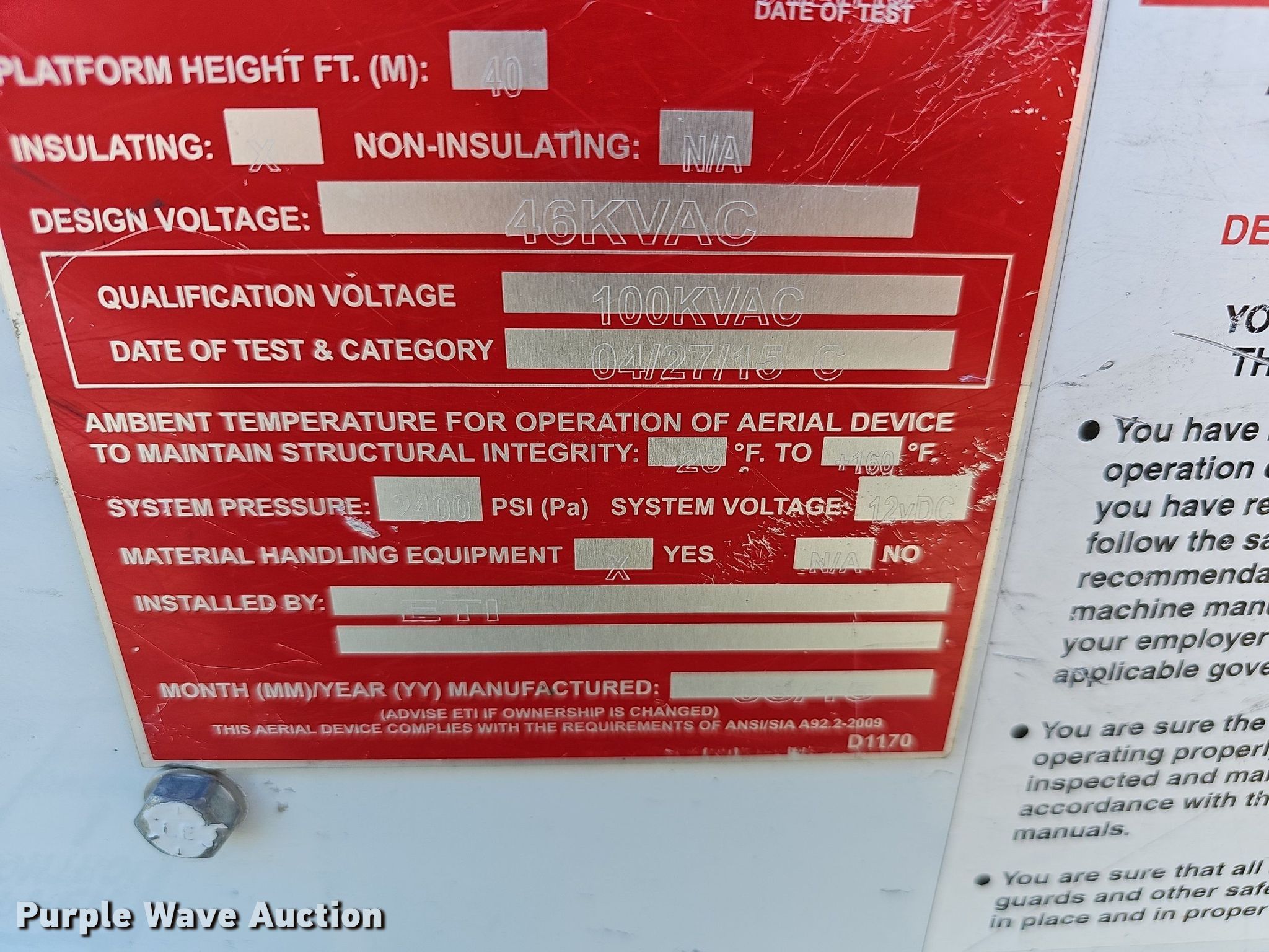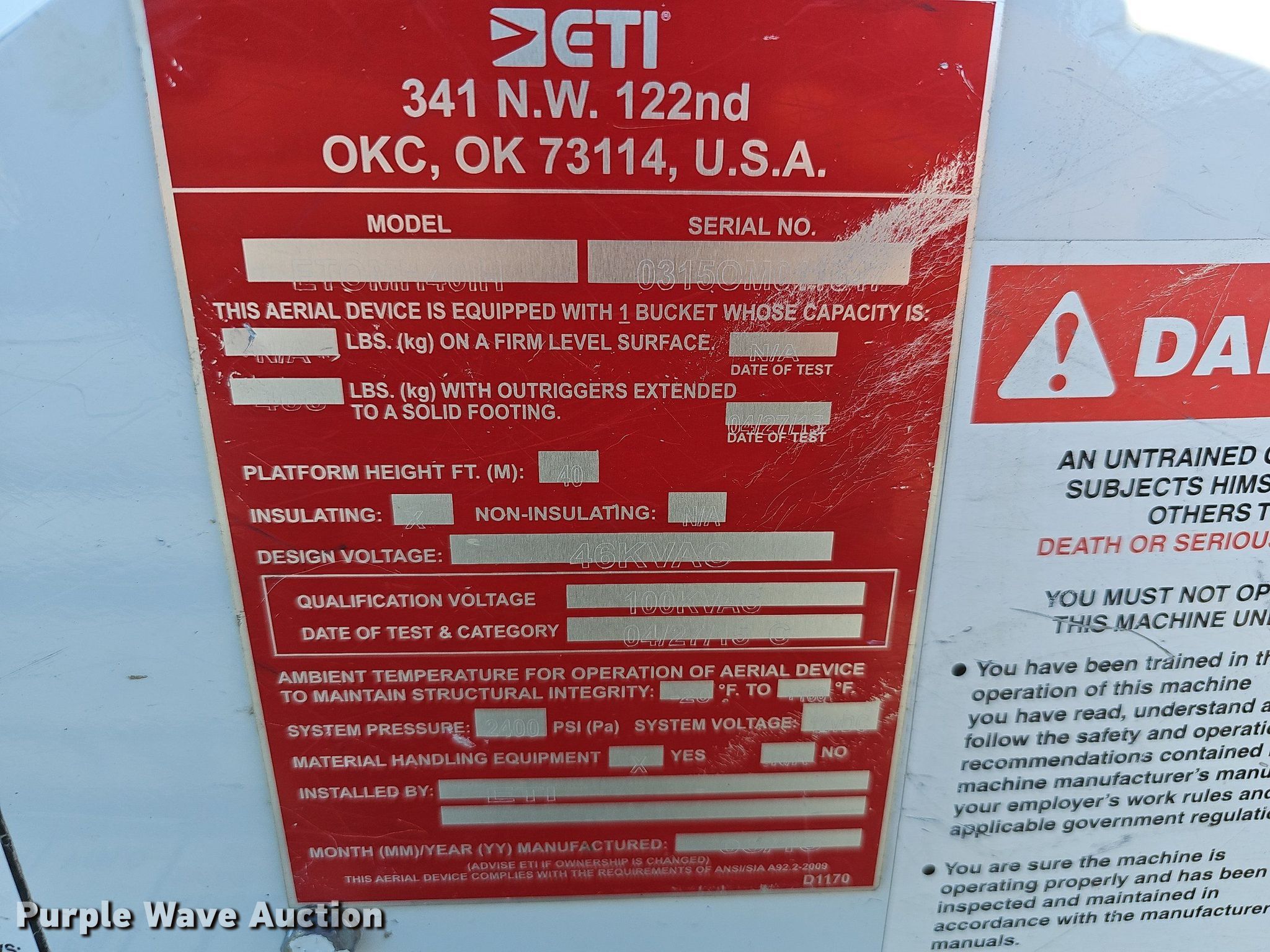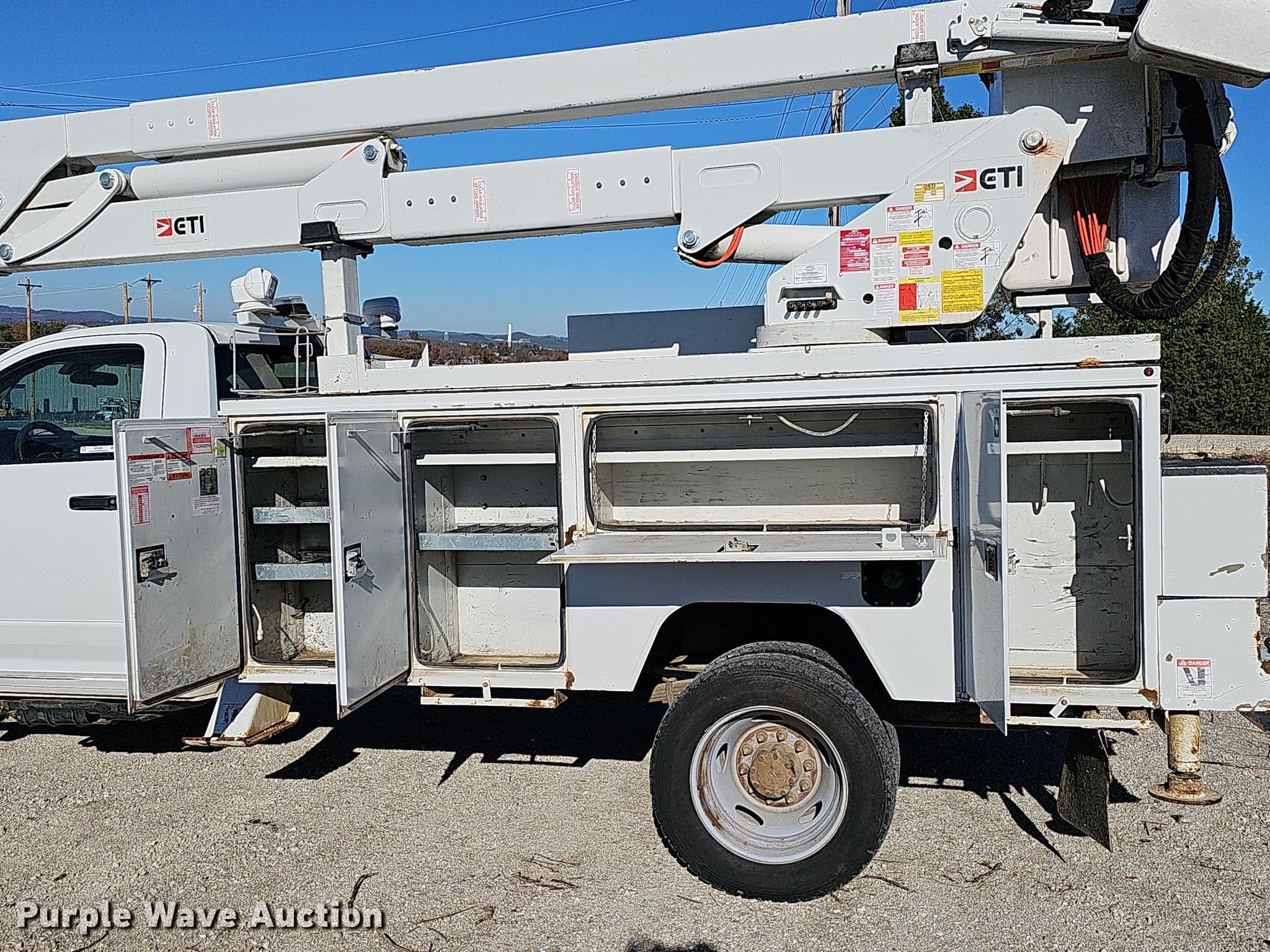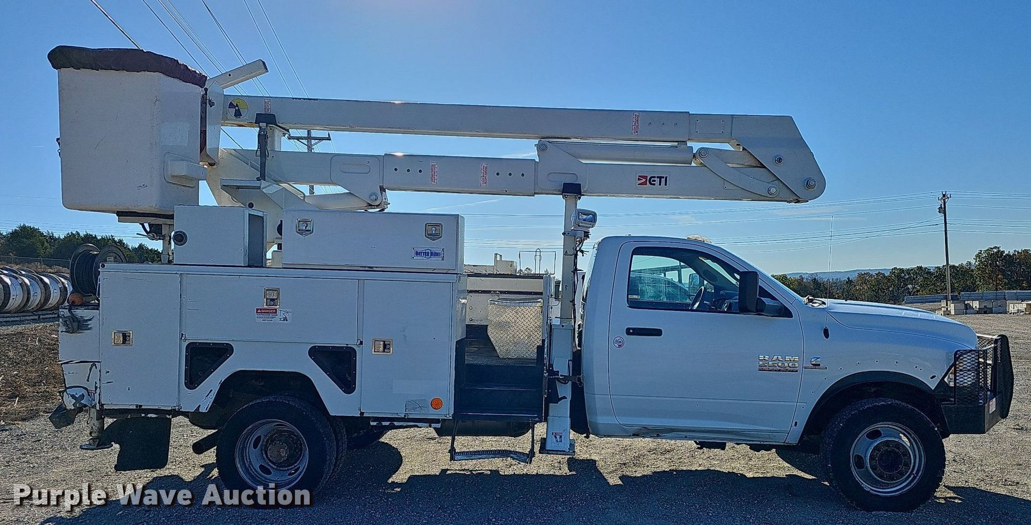 2015 Dodge Ram 5500HD bucket truck. Miles: 159,907 on odometer, VIN: 3C7WRNBL1FG640388, Unit #: 20. Engine Cummins, Displacement: 6.7L L6 OHV, Cylinders: 6, Fuel type: Diesel. Transmission Automatic. Chassis Four wheel drive, Axles: Single, Suspension: Spring, Brakes: Hydraulic, PTO, GVWR: 19,500 lbs. Interior AC, heat, Cruise control, Auxiliary controls. Features Bed ETI SB122DD96B, Serial: 17901, 122" L x 96" W, Boom 2015 ETI ETOMH4OIH, Serial: 0315OM011647, Boom length: 40', Maximum lift capacity: 400 lbs, Boom type: Articulating, Insulated, Man basket, Boom controls Ground, Platform/ basket.. Tires Size: 225/70R19.5. Missouri title. Title distribution may be delayed up to 14 days from verification of funds. White River Valley Electric Cooperative. 2449 State Highway 76. Branson, MO 65616