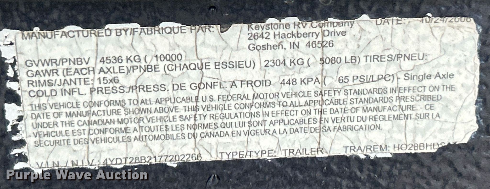 Purple Wave is selling a used RV or Camper in Missouri. This item is a 2007 Keystone Hornet with the following: Camper length: 28', VIN: 4YDT28B2177202266